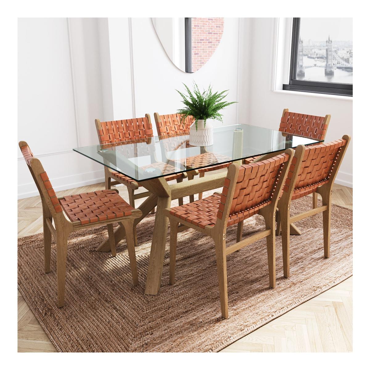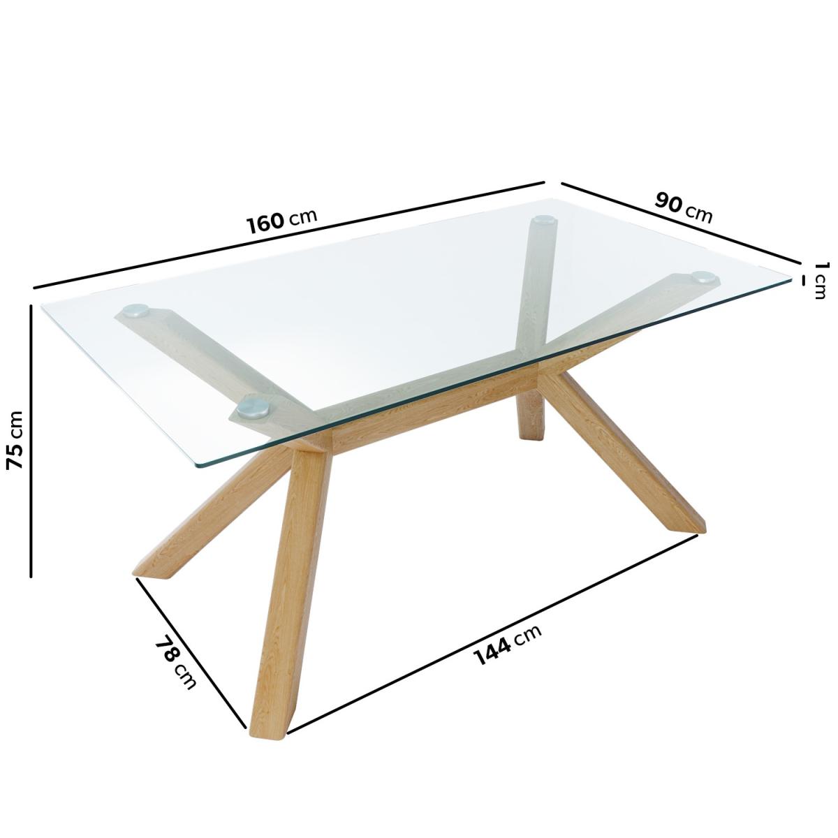 The stylish Nori rectangular glass dining table is the perfect size for six people. The glass top adds light to the room, creating an illusion of more space in your dining room or kitchen. Solid oak legs provide durability and style with a unique, eye-catching design. Check out our range of dining chairs to complete the look. Please note: Due to the nature of the natural wood, each piece will be unique due to the variation of the real wood grain.
