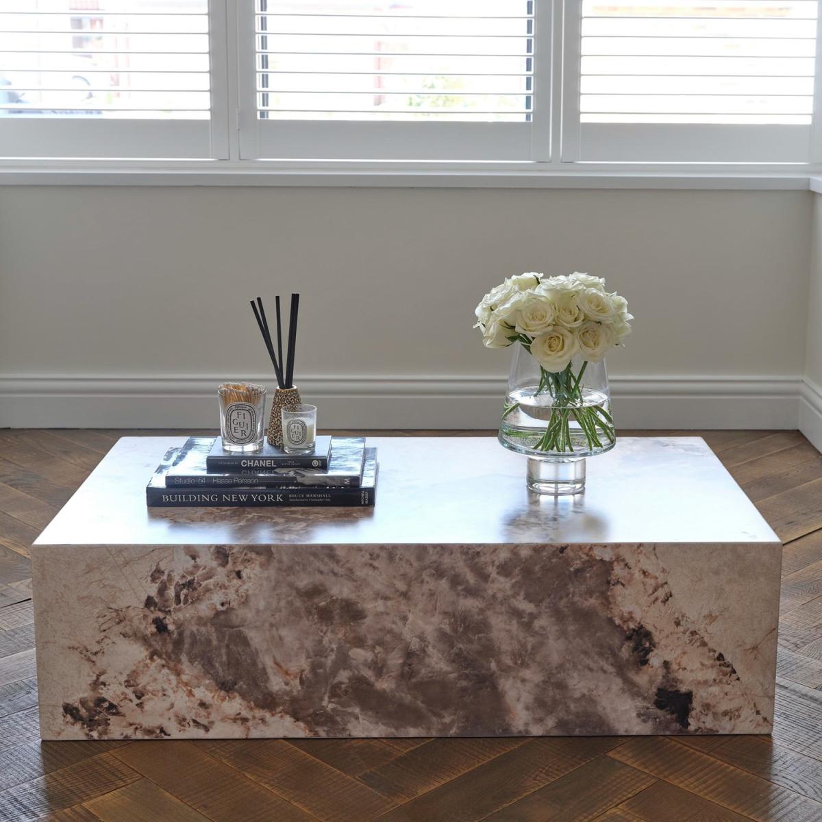 Offers a luxurious look with natural marble aesthetics, creating a sophisticated focal point. Complements any room, blending effortlessly with various colour schemes and interior styles. Adds a sleek, subtle shine that enhances the table's overall elegance while keeping it low-maintenance. Perfect for living rooms, bedrooms, or any space needing an upscale, functional accent piece. Pair with other items in the same collection to create a harmonious and stylish interior look. The Sur large coffee table makes a bold design statement with its Pandora marble effect. Its neutral tones and matte finish bring a subtle yet elegant touch to any room, effortlessly complementing various interior styles. This coffee table is not only visually appealing but also practical, offering a refined accent for any space. The Sur coffee table enhances the atmosphere with its luxurious design. Pair it with other pieces from the collection to create a cohesive, stylish look that elevates your home decor. Please use heat-protective mats & coasters when placing items onto the table to protect the tabletop, clean any spills straight away with a damp cloth to avoid staining. Dimensions:W106.8 x D58.6 x H30 cm Shape: Rectangular Material: Heat & Scratchproof Textured Composite Finish:Marble Assembly required: No Product weight: 37kg Maximum Supported Weight: 120kg Package dimensions:W66 x D114 x H38 cm