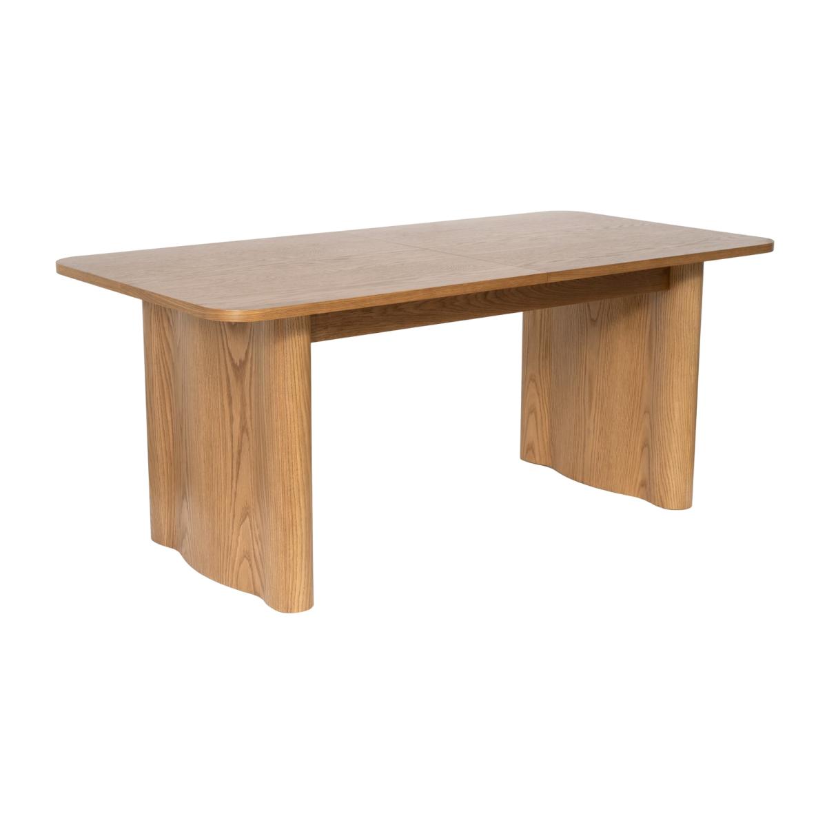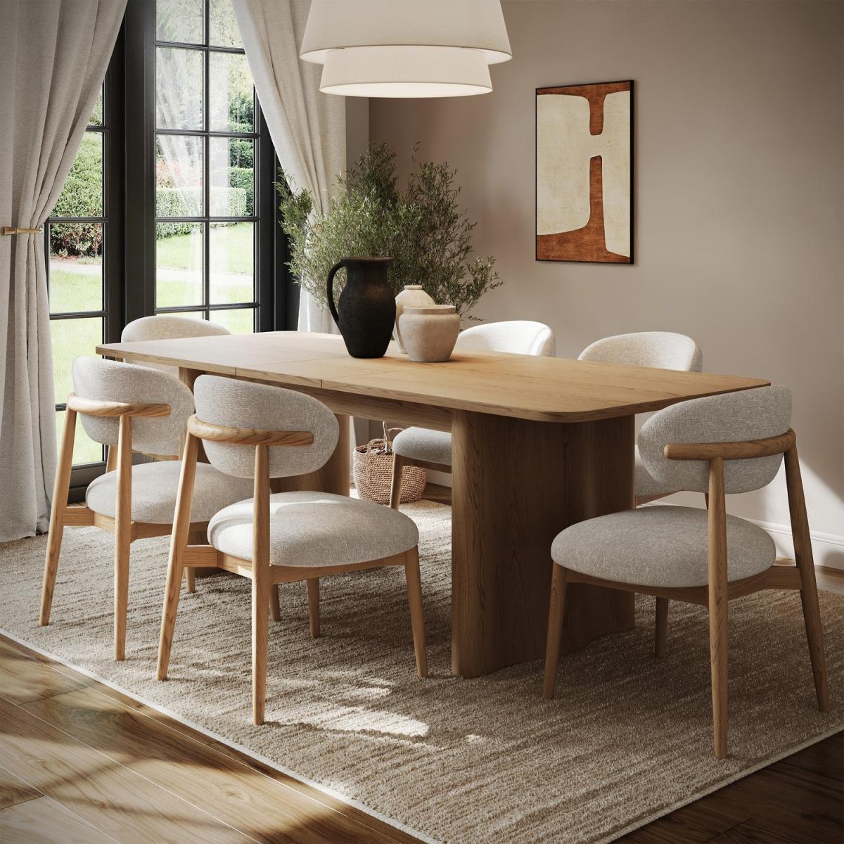 The curved wave legs create a striking silhouette, turning this table into a centrepiece even when it’s not in use. It’s the kind of detail that gets compliments. Seamlessly hidden within the frame, the butterfly mechanism allows you to extend the table in seconds, ideal for gatherings. Oak veneer gives the table a rich, smooth finish with a natural grain that adds depth. The oak wood adds warmth to all interiors. Soft, neutral fabric complements various interior styles and adds a layer of refined comfort. The open back silhouette provides support while enhancing the chair's mid-century modern aesthetic. Crafted from rustic solid oak, the exposed backrest adds a natural, timeless charm with a touch of retro sophistication. Upgrade your dining space with the Wave & Kori dining set. Made for modern living effortlessly blending unique design with everyday functionality. The sculptural Wave table makes a focal point with its curved, wave-inspired legs and rich solid oak finish, creating a sophisticated centrepiece that enhances your dining space. Thanks to the concealed butterfly extension, it adapts seamlessly to suit the moment whether you're enjoying a quiet breakfast or hosting a full table of guests. Paired with six Kori chairs, upholstered in a beautifully textured beige fabric, the set brings depth, comfort and contemporary charm to your home. This set transforms ordinary meals into occasions, offering a stylish and versatile setup that makes every sit-down feel special. Please use heat-protective mats & coasters when placing items onto the table to protect the tabletop, clean up any spills straight away as wood is porous and will absorb liquids. Due to the natural characteristics of the wood, each table is unique and may vary to images shown on site.