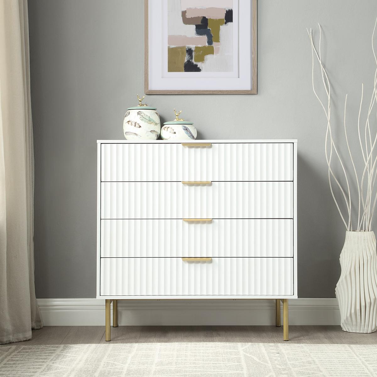 Add a touch of opulence to your interior with this elegant white chest of 4 drawers with a unique ridged design and gold accented handles. 4 spacious drawers are ideal for storing clothes, with space for up to 18 T-shirts. Perfect drawers for storage in any room, suitable for any household items, including toys, toiletries, makeup, paperwork, garments and stationery. Compact sturdy construction with anti-bowing drawer supports to reinforce the drawer bases and hold larger weight limits. Strong metal legs raise the drawers for easy access, and thick particleboard wood construction. Each drawer has an anti-bowing support underneath, which adds strength. The bar gives the drawers extra strength, stopping them from bowing and deforming. Each drawer is mounted on 2 metal runners, allowing for the smooth opening and closing of each drawer. Included in each pack, 4 drawers, 4 handles, and all fittings required for assembly.