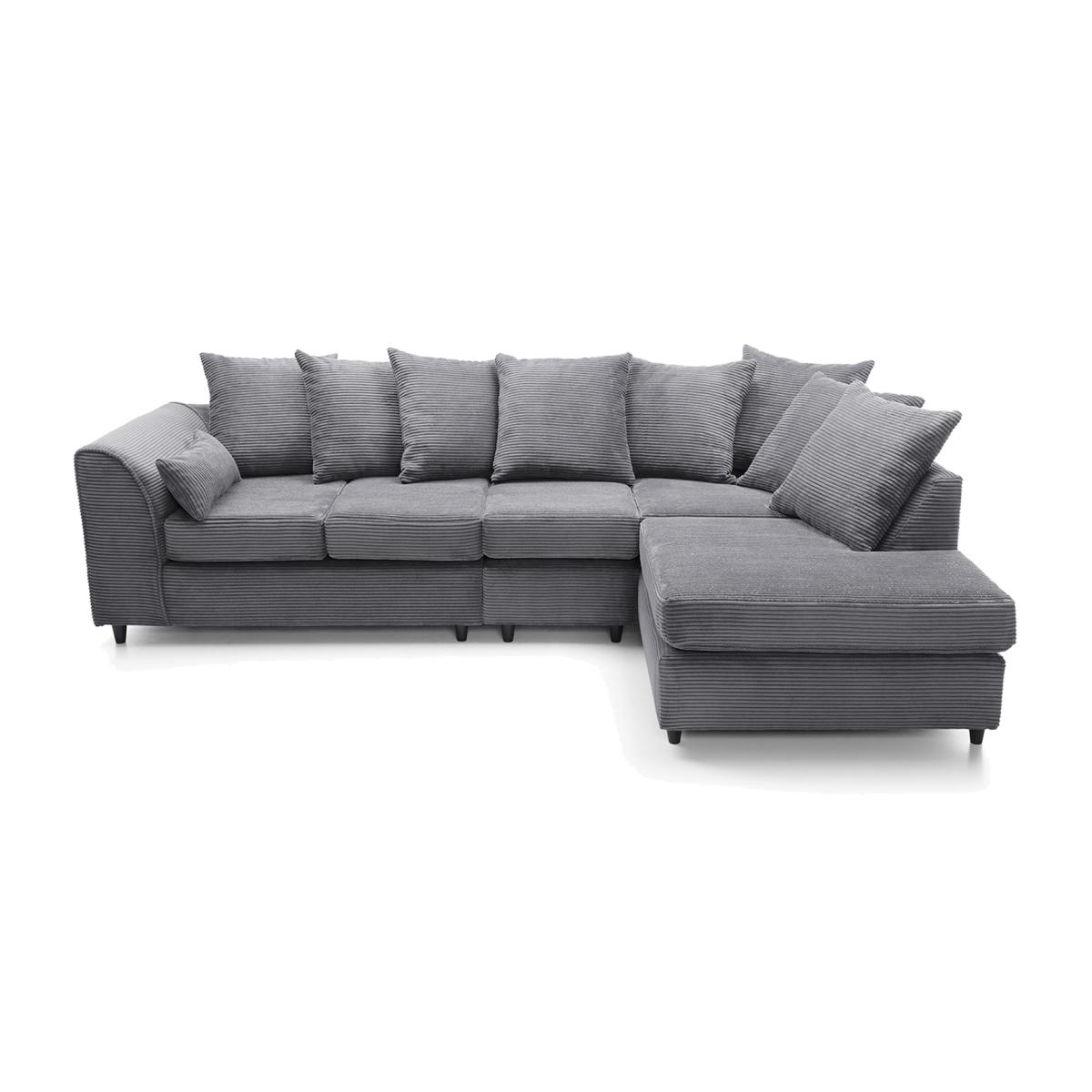 A grey jumbo cord corner sofa, perhaps in brown. We have it both! Enjoy a lavish chaise corner sofa upholstered in the most pristine soft structured cord chenille fabric there is. Soft to the touch. Opulent and inviting in its visual appeal. Angular arms, back and generously filled scatter cushion provide a very contemporary style statement. A sofa destined to become your old faithful. Choose from an earthy black and grey colour pairing or a warmer brown and beige pairing.