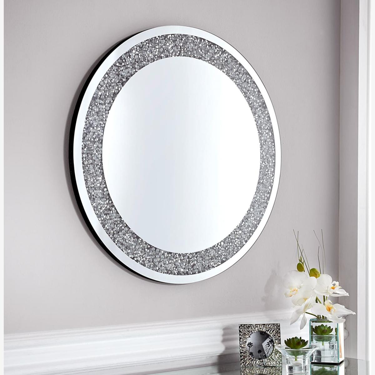 Round Crushed Jewel Mirror, Hang this stunning mirror on a wall at home. Features a stunning crushed jewel design. Colour Silver Dimensions 80cm Approx.