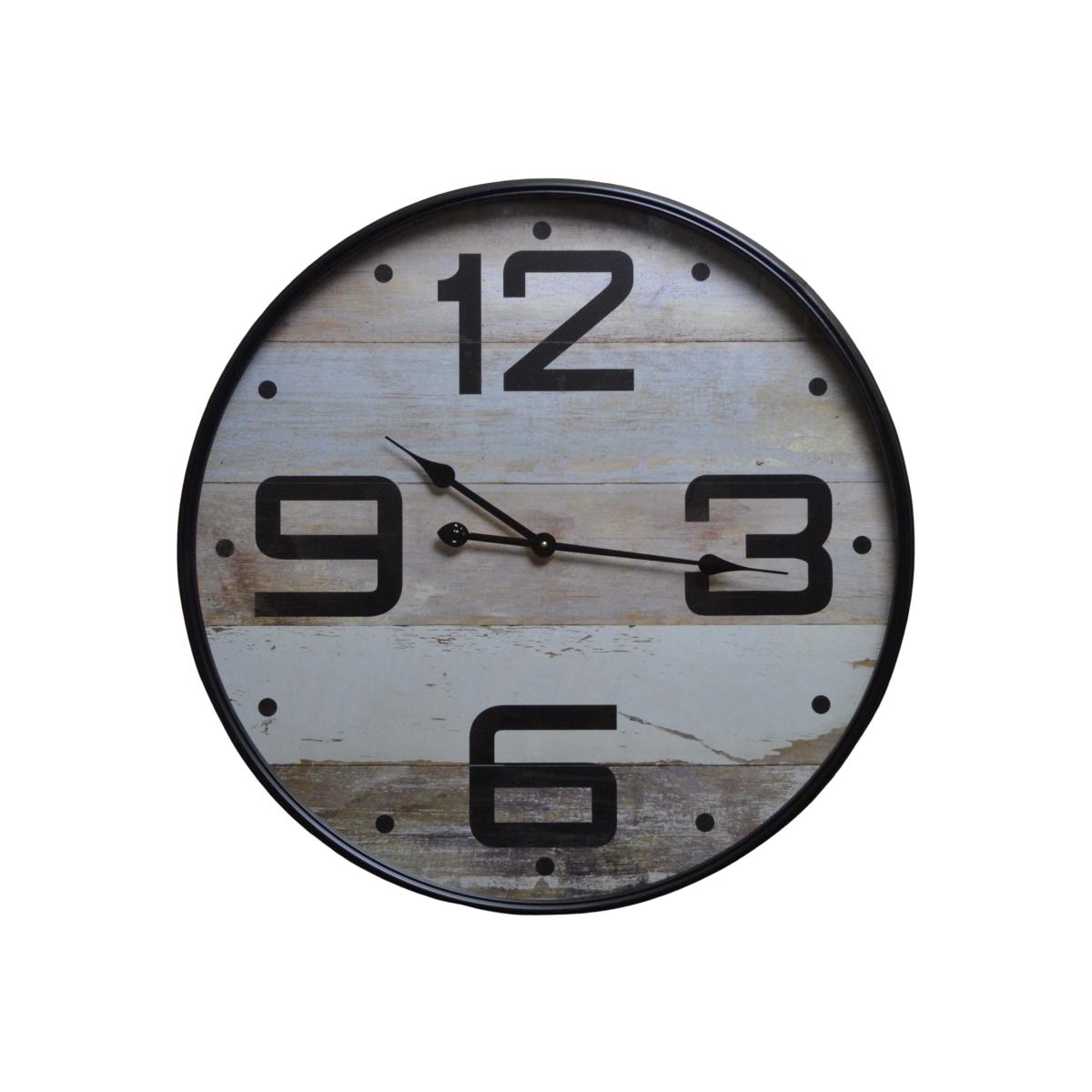 Elevate your space with the Large Round Wall Clock, adding a touch of rustic charm. This impressive timepiece boasts a warm and character-rich wooden effect face with large printed numbers at 12, 3, 6, and 9 for easy readability. Encased in a thin black metal surround, it strikes a balance between vintage and contemporary design, while shades of blue and white subtly enhance its visual appeal. This clock serves as a bold statement piece on any wall, harmoniously blending textures, colors, and styles, making it ideal for spaces seeking a mix of rustic aesthetics and functional timekeeping.