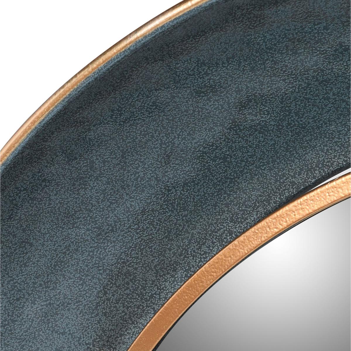 An oversized round wall mirror with a convex-shape frame crafted from iron. Finished in teal with a contemporary copper edge detailing.