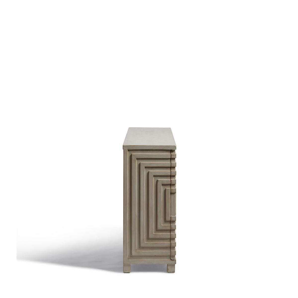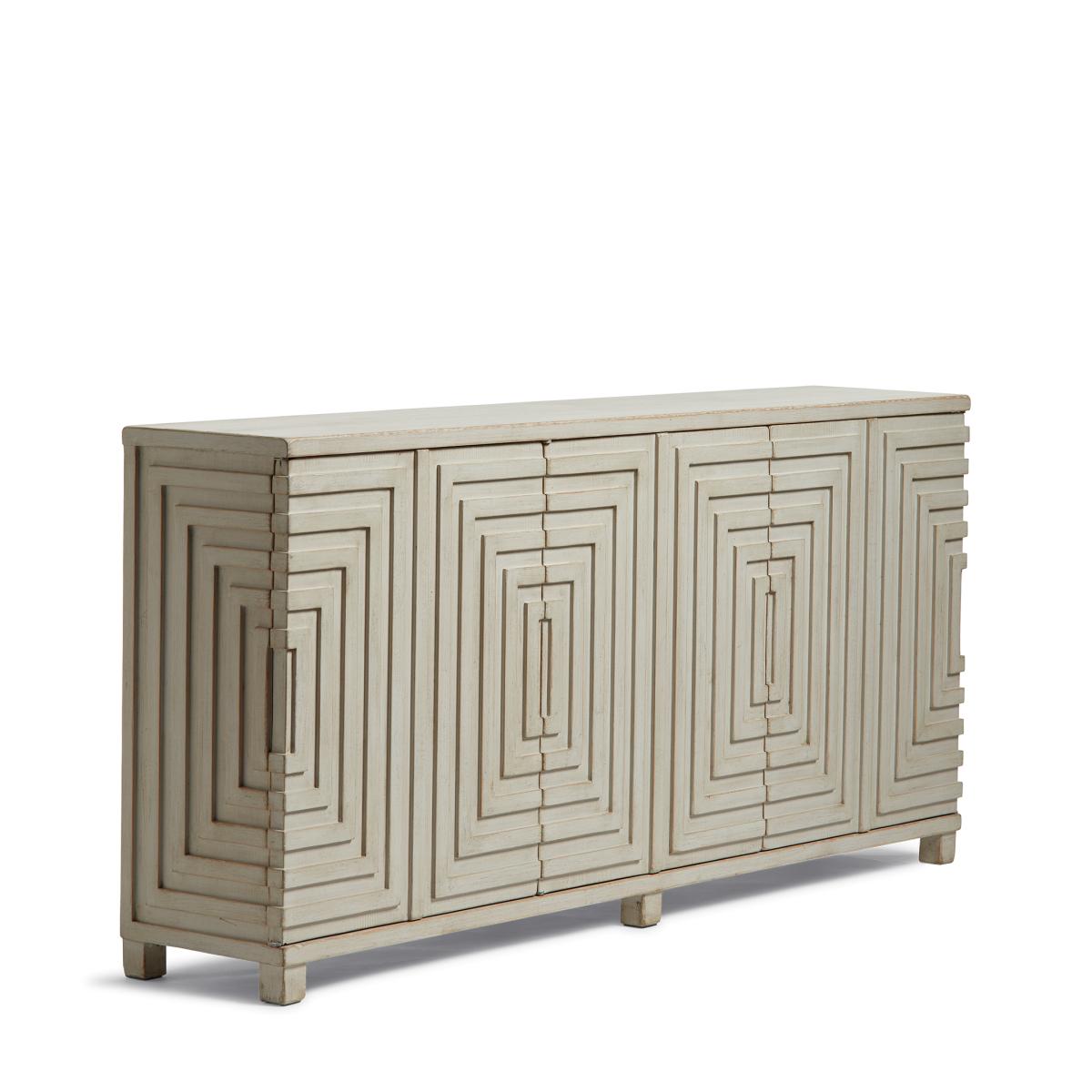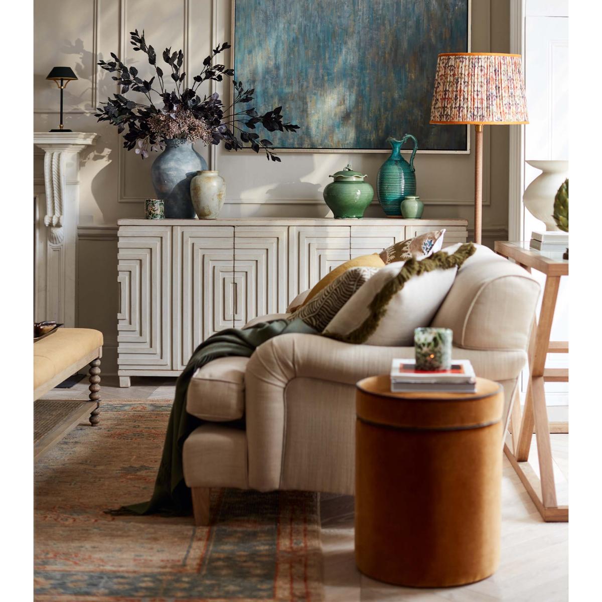 The large Rubinne sideboard in washed grey is an excellent versatile piece that works well in both modern and rustic interiors. I love how its subtle, muted tone can seamlessly complement a neutral colour palette, adding texture without overpowering the space. Its spacious interior makes it practical for organising dining essentials or living room clutter, while the eye-catching geometric detailing lends visual interest and a contemporary edge. For styling tips, consider layering with minimalistic accessories like ceramic vases or statement tabletop decor to keep the look fresh. Position it against a textured wall or near a subtle patterned rug to enhance its architectural appeal, making it a practical yet stylish focal point in any room.