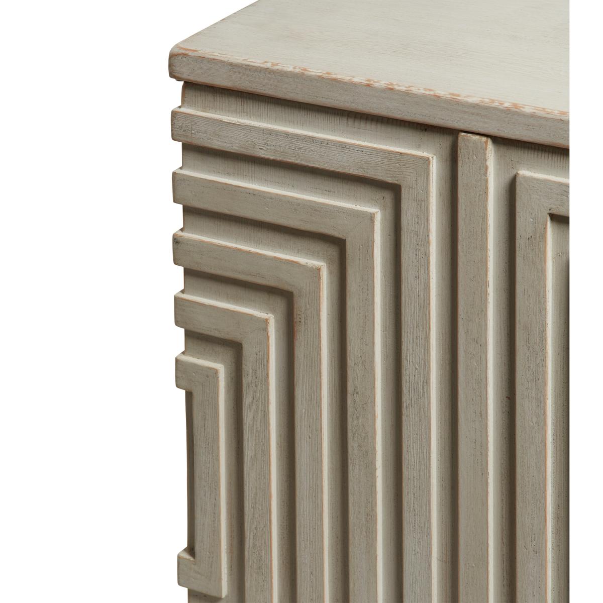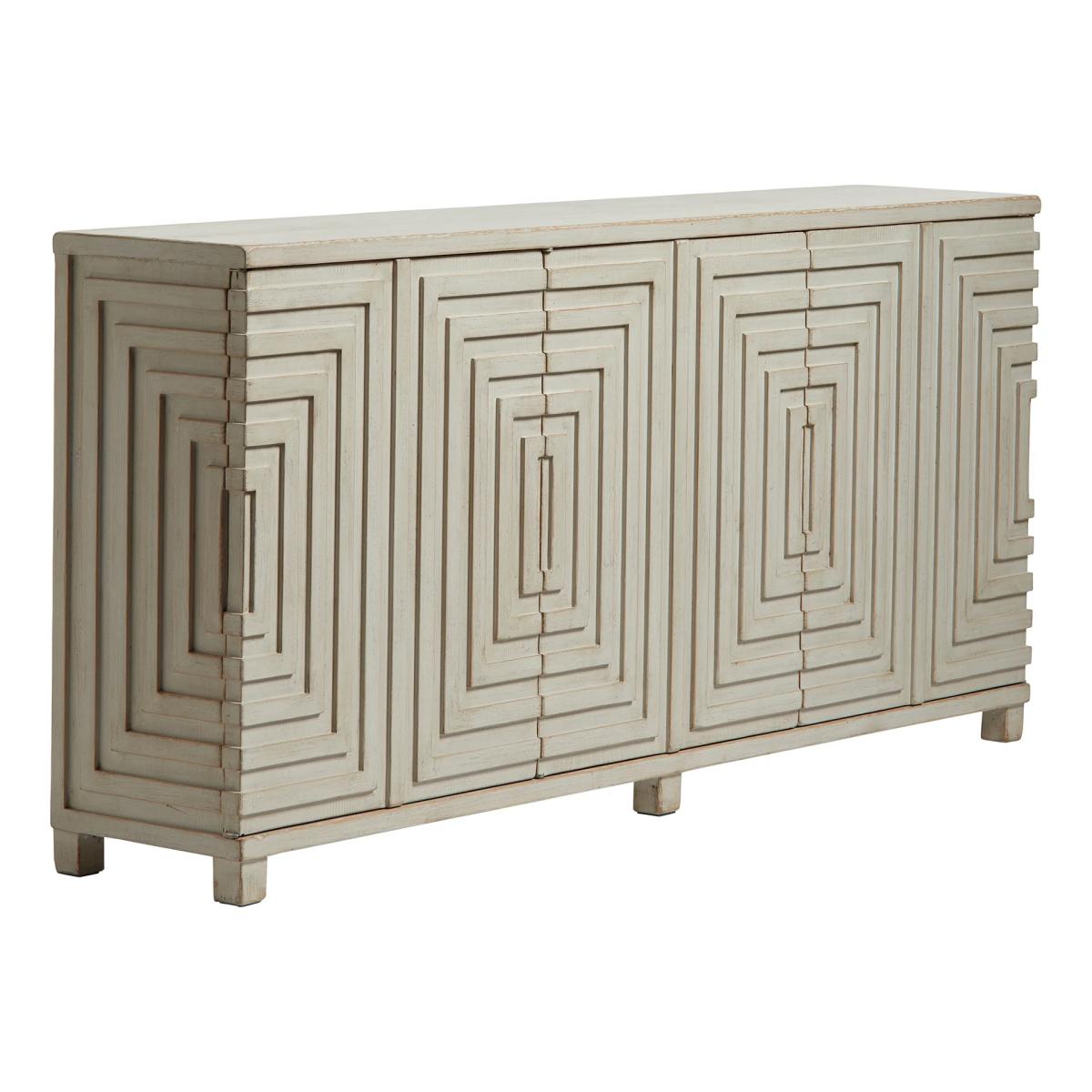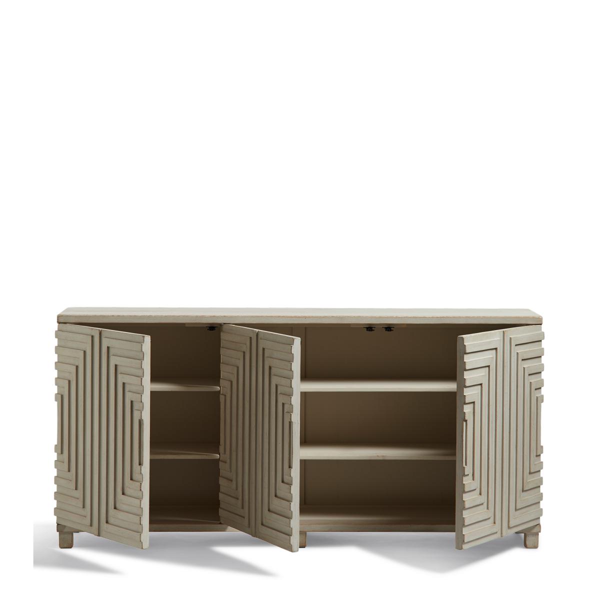 The large Rubinne sideboard in washed grey is an excellent versatile piece that works well in both modern and rustic interiors. I love how its subtle, muted tone can seamlessly complement a neutral colour palette, adding texture without overpowering the space. Its spacious interior makes it practical for organising dining essentials or living room clutter, while the eye-catching geometric detailing lends visual interest and a contemporary edge. For styling tips, consider layering with minimalistic accessories like ceramic vases or statement tabletop decor to keep the look fresh. Position it against a textured wall or near a subtle patterned rug to enhance its architectural appeal, making it a practical yet stylish focal point in any room.