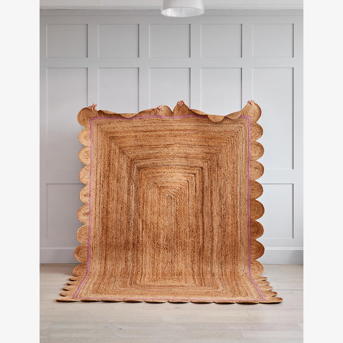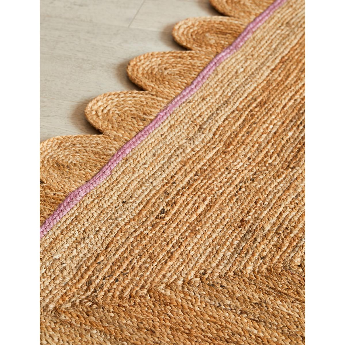 I love this rug for its playful scalloped edges and the soft pink trim, which add a touch of warmth and charm to any space. It's versatile enough to work well in both modern and traditional interiors, especially in cozy living rooms, bedrooms, or even a nursery. When styling, consider pairing it with neutral furniture to let the rug stand out, or use it to introduce a subtle pop of colour in a more muted palette. Practical tips include layering it over a larger, neutral rug for added texture or letting it be a statement piece on its own. Its natural jute texture provides durability, making it a great choice for high-traffic areas while maintaining a relaxed and inviting feel.