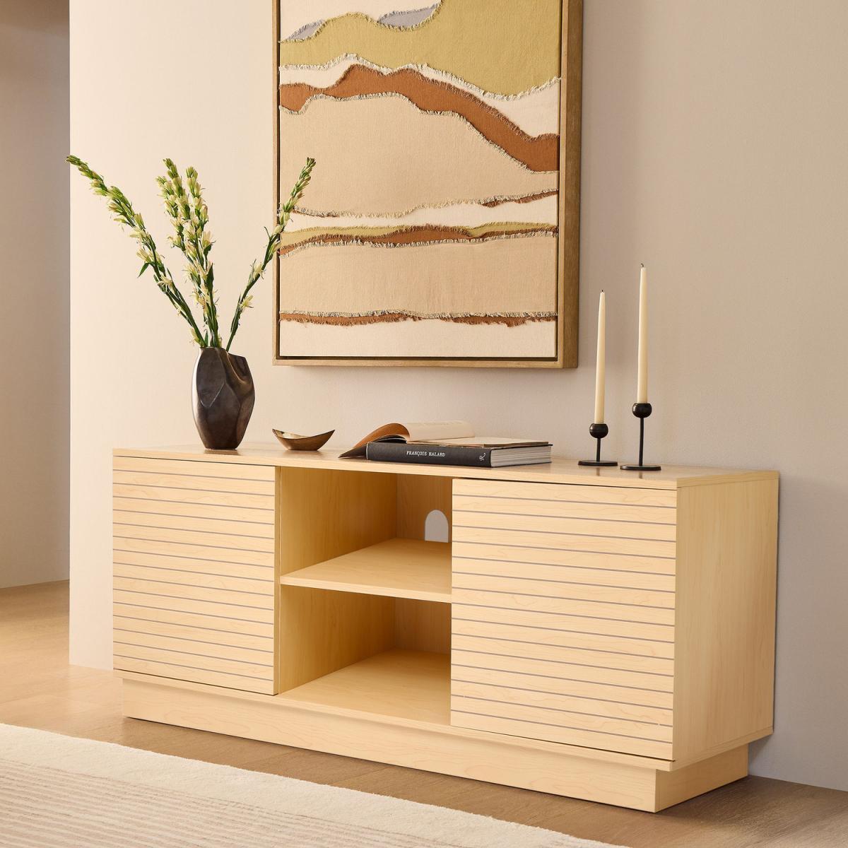 I’m a fan of this slatted TV unit for its clean lines and natural timber tone - it brings warmth without overpowering a room. It suits Scandi, Japandi or modern mid-century schemes and works equally well against a pale wall or a deeper accent hue. Practically, the two doors conceal media kit and cables, while the open shelves are perfect for styling small plants, books or a soundbar. To keep the look balanced, pair it with simple décor - think a low-profile vase, a framed print leaned against the wall and a couple of candles.