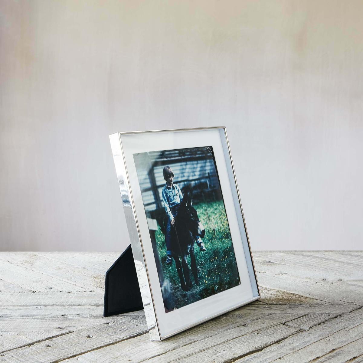An understated rectangular photo frame featuring a slim silver border and a white mount, perfect for your favourite family portraits.
