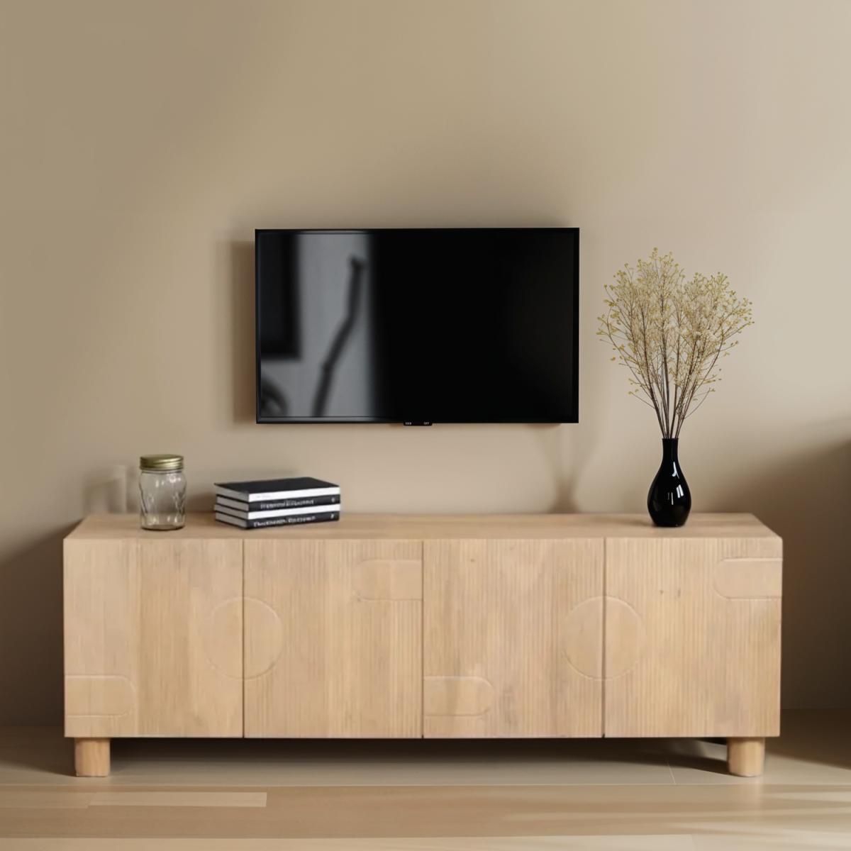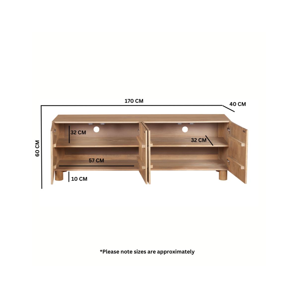 Crafted from high-quality mango wood, this TV cabinet offers durability and timeless appeal. The lower cabinet doors feature a unique fluted pattern, adding a distinctive touch of sophistication. Designed with ample space for media accessories, it keeps your living area organised and clutter-free. Protects and highlights the natural beauty of the wood for a sleek and long-lasting look. A stylish addition to contemporary and classic spaces, effortlessly complementing various décor styles. Elevate your living space with the Large Low Board TV Cabinet, a perfect blend of functionality and elegance. Crafted from premium mango wood, offering a spacious and stylish platform for your television and media accessories. The standout fluted detailing adds a sophisticated touch, while the water-based lacquer finish enhances the wood’s natural grain and ensures long-lasting durability. Ideal for modern and contemporary interiors, this low board provides ample storage, helping you maintain a sleek and organised space. With partial assembly required, it’s easy to set up and enjoy as a statement piece in your home. Dimensions:W170 x D40 x H60 cm Package dimensions:W177.8 x D46.99 x H57.15 cm Weight: 37 kg Colour: Brown Finish: Mango Wood Material: Wood Assembly required: Yes