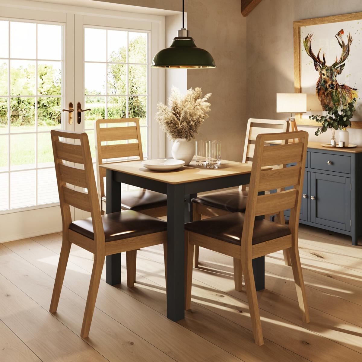Introducing the Square Oak Dining Table in 4 beautiful finishes, a perfect combination of style, durability, and versatility. Crafted from a blend of solid oak, oak veneer, and MDF, this dining table showcases a range of stunning finishes that adds a touch of elegance to any home decor. With its easy-to-clean surface and strong construction, this dining table is designed to withstand the demands of daily use while maintaining its timeless appeal. Enhance your dining experience with the Square Oak Dining Table. Its stylish design, durable construction, and easy-to-clean finish make it the perfect choice for both everyday meals and special occasions. Enjoy the versatility and timeless beauty of this dining table, which effortlessly combines functionality and aesthetic appeal in one stunning package. Chairs Are NOT Included.