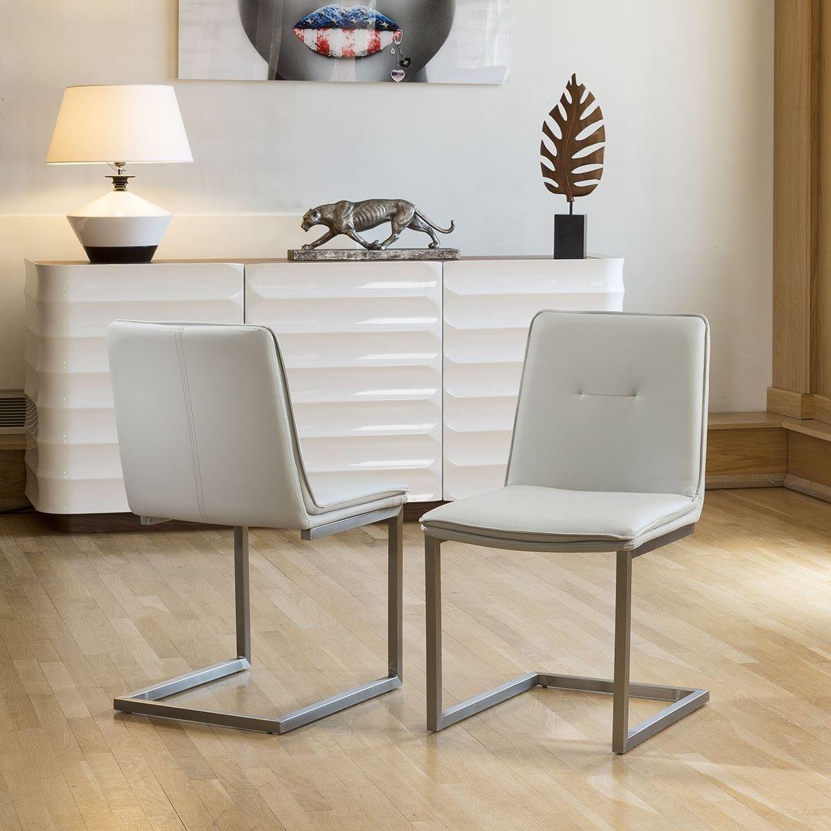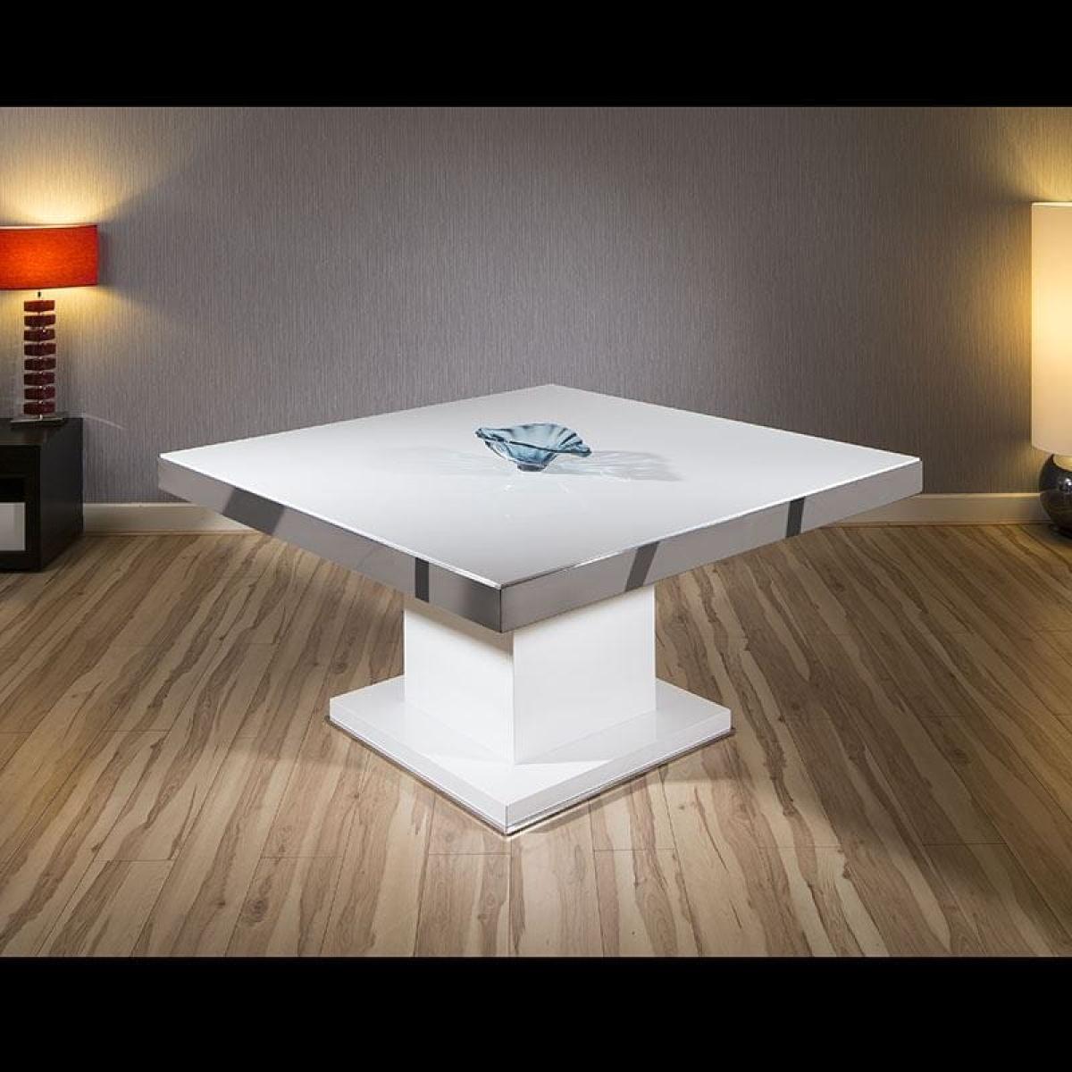 The Truly Stunning 939. T Square White Dining Table with 8 Low-back Ice Grey faux leather chairs. The high quality faux leather chairs features a stunning brushed stainless steel cantilever base. We have many other chair styles and colours and you are free to mix and match although some of the other chairs may incurr a premium. Special features on the table include a deep chrome trim around the glass table top, a mirror finish chrome stripe around the table base, central white gloss lacqured square stem. Beautifully crafted and will comfortably seat up to 10 - extra chairs available upon request. W150cm D150cm H73cm Set includes 1 x dining table and 8 chairs Mix and Match any of our tables and chairs