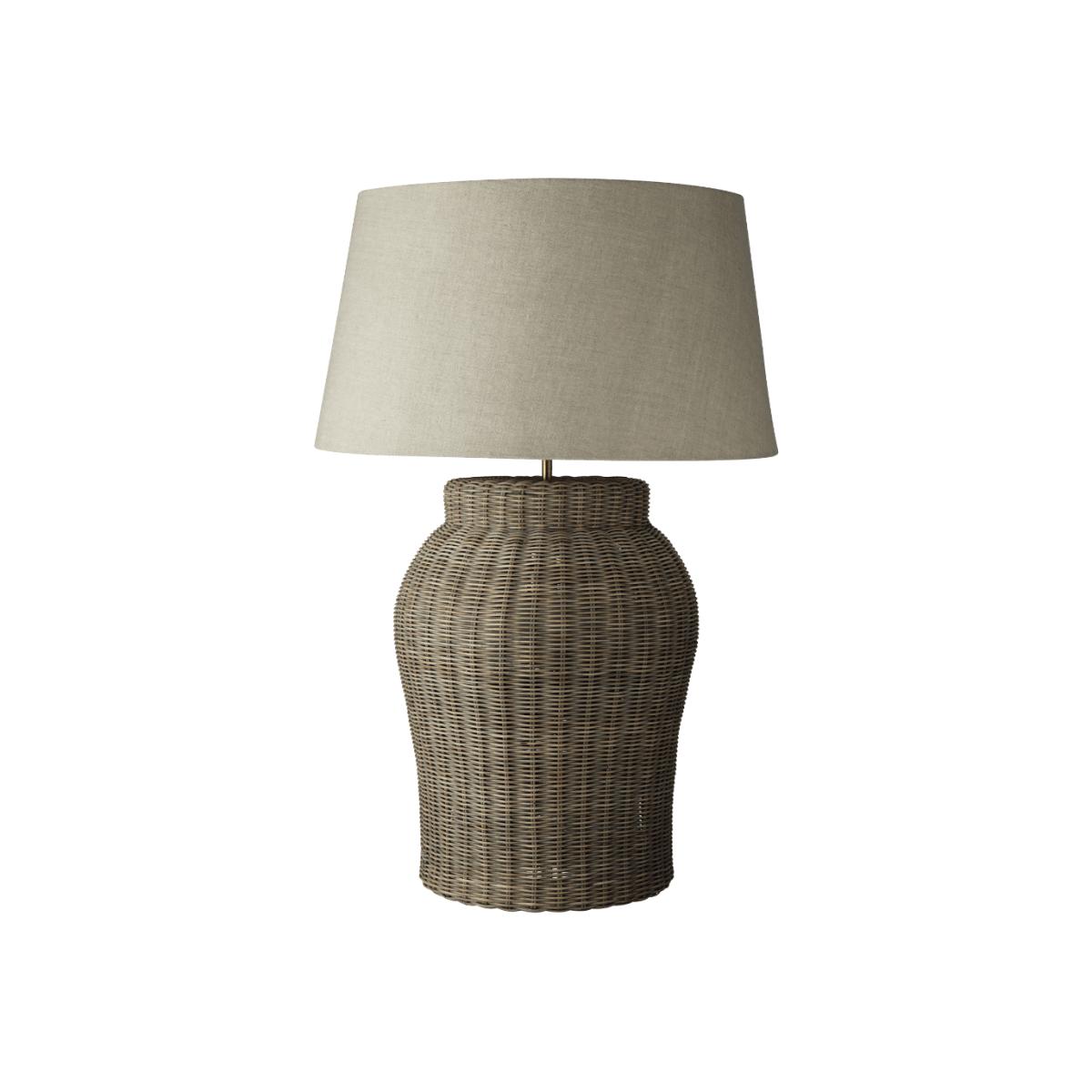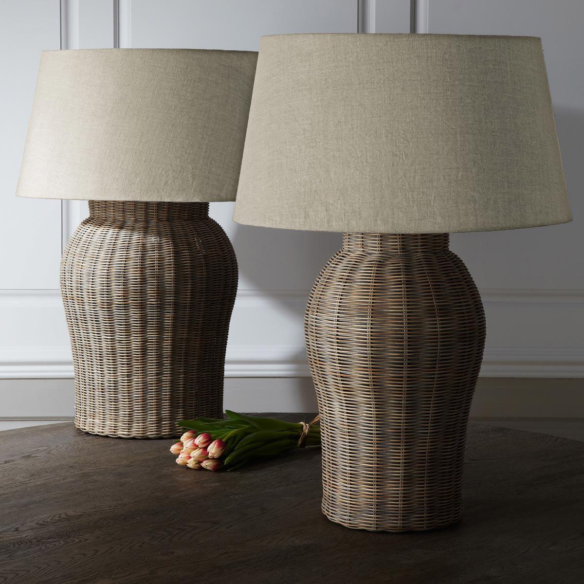 In closely woven rattan finished to a soft grey, our large Tanjore Lamp will blend beautifully with most schemes. Sizeable but not overwhelming, it is great on a desk, console table or side table. We recommend a 40-45cm diameter shade for use with this lamp.