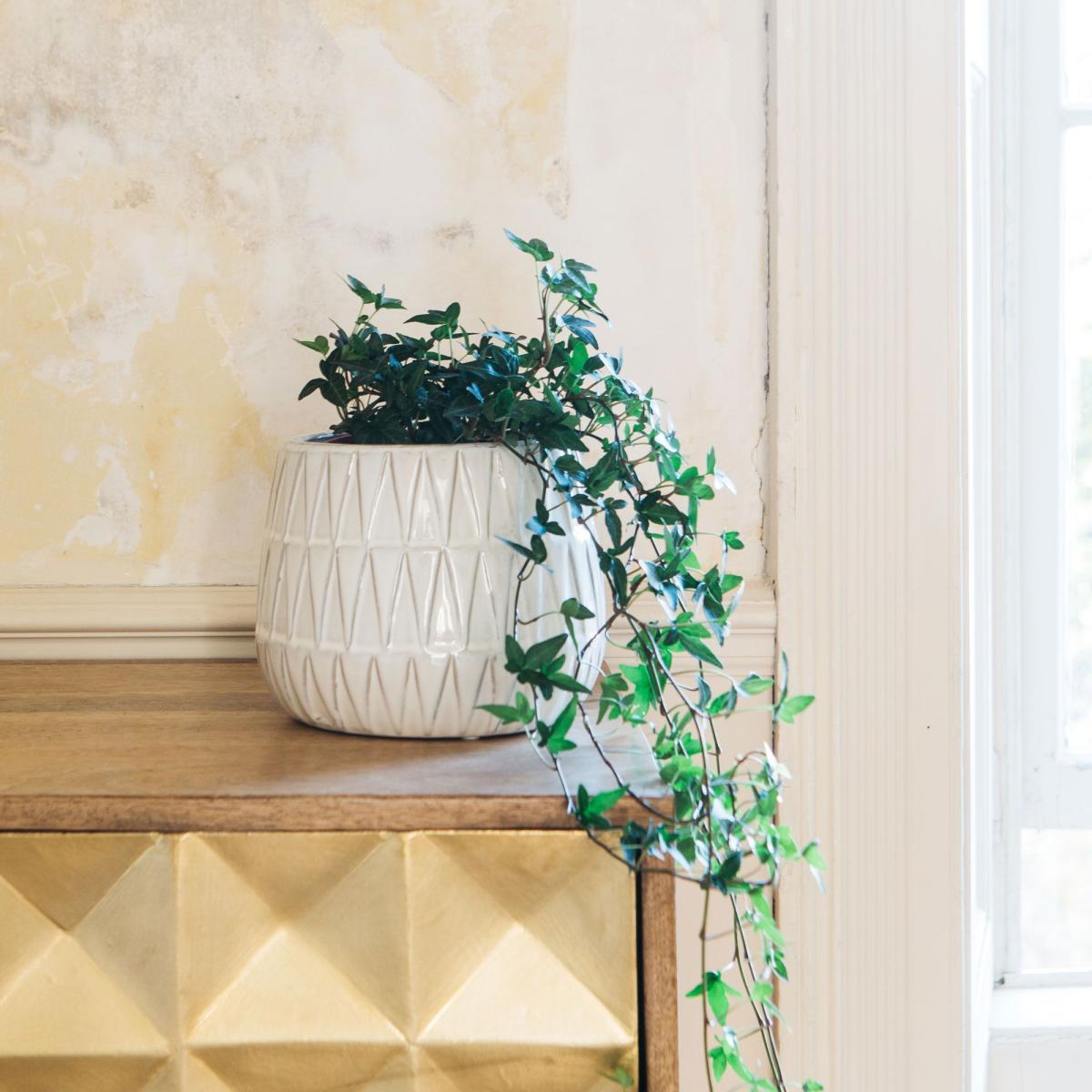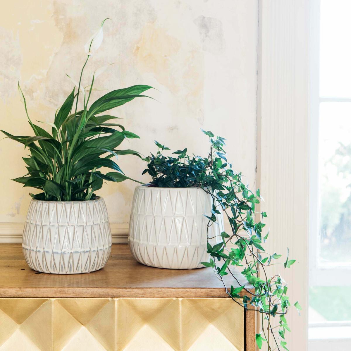 Adorned in a statement triangle pattern and glazed with a white finish, fill this stylish ceramic planter with fabulous foliage and it will command attention in your houseplant collection. Available in two sizes.