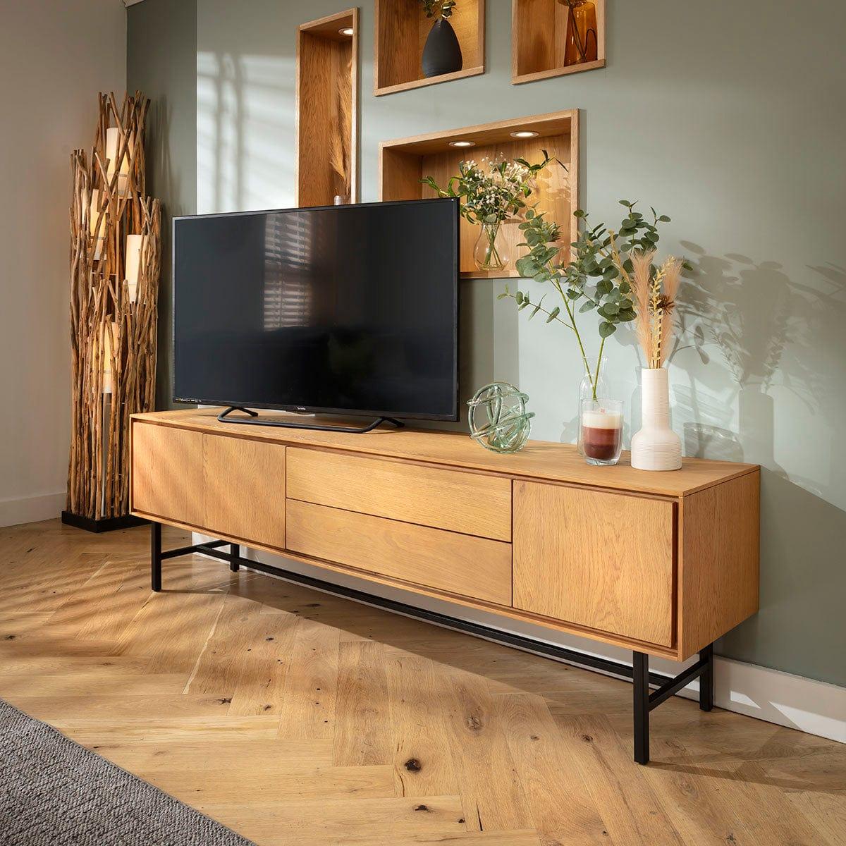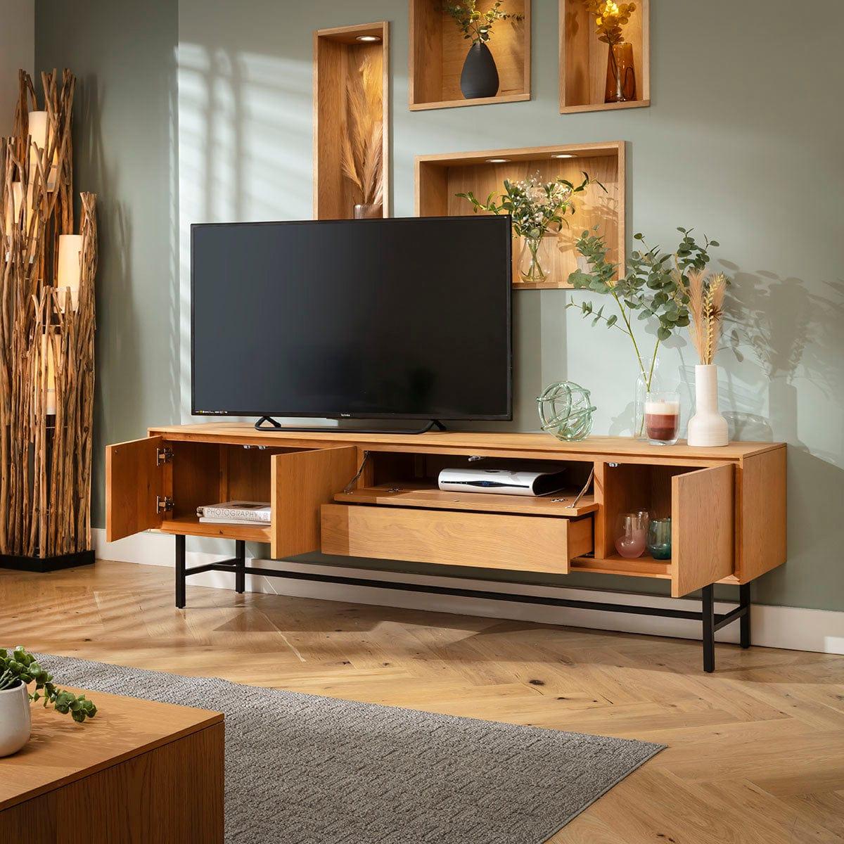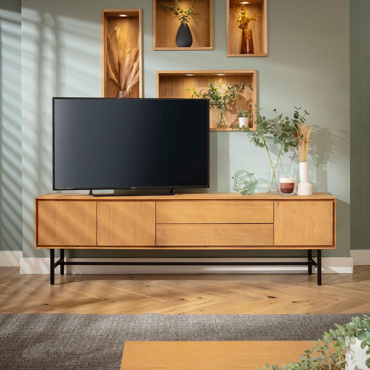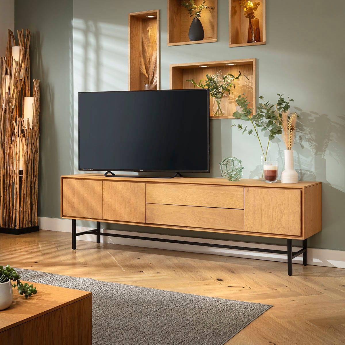 This large wooden TV unit combines modern style with practical storage, making it one of the most functional television stands available. Whether used as a freestanding media unit or wall mounted TV stand, this large design works beautifully in open spaces. This is a premium light wooden TV stand that doubles up as a wall hung TV cabinet - built to last. Crafted in high-quality light wood, this 205cm wide TV cabinet delivers sleek modern appeal. At 42cm deep, it arrives preassembled - simply attach the included metal legs, or use the integrated French cleat wall mounting system for a floating effect. Standing 60cm tall with legs, or 35cm without, this stylish TV unit also pairs with other furniture from the Grado collection. This wide TV stand maximises organisation with a 73cm wide, 35cm deep, 27cm high cupboard, a 72cm wide, 31cm deep, 8cm high drawer, a 76cm wide, 35cm deep, 11cm high flap-door compartment, plus a 35cm wide, 35cm deep, 27cm high single-door cupboard. Designed for large spaces, this wooden TV unit combines style and practicality, offering a media unit that feels spacious. W205cm D42cm H60cm French cleat wall hanging bracket included Supplied preassembled, you’ll simply attach the legs
