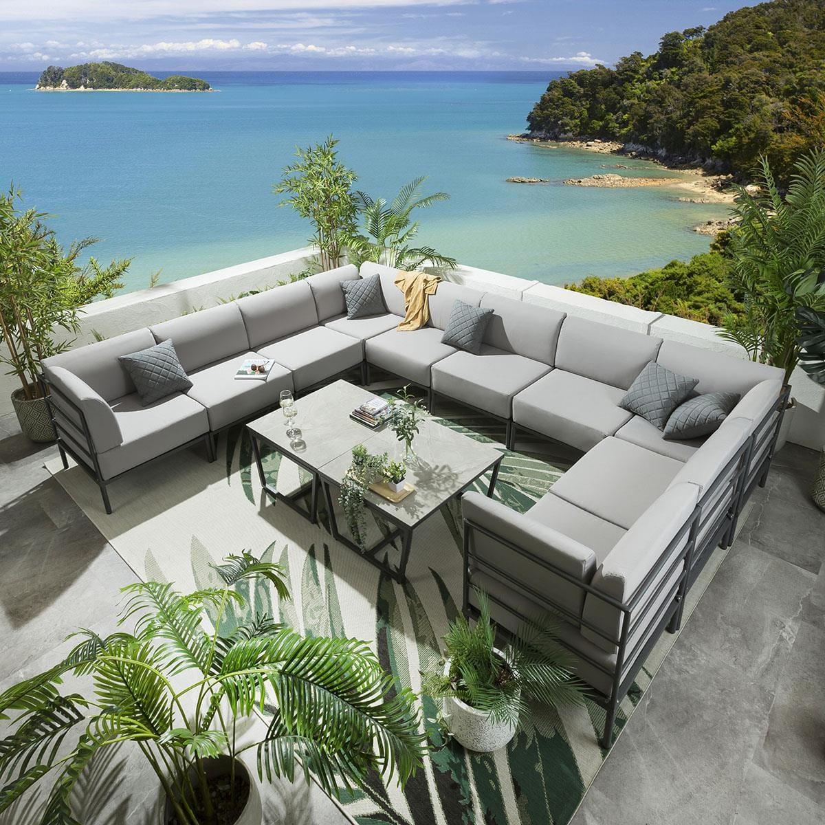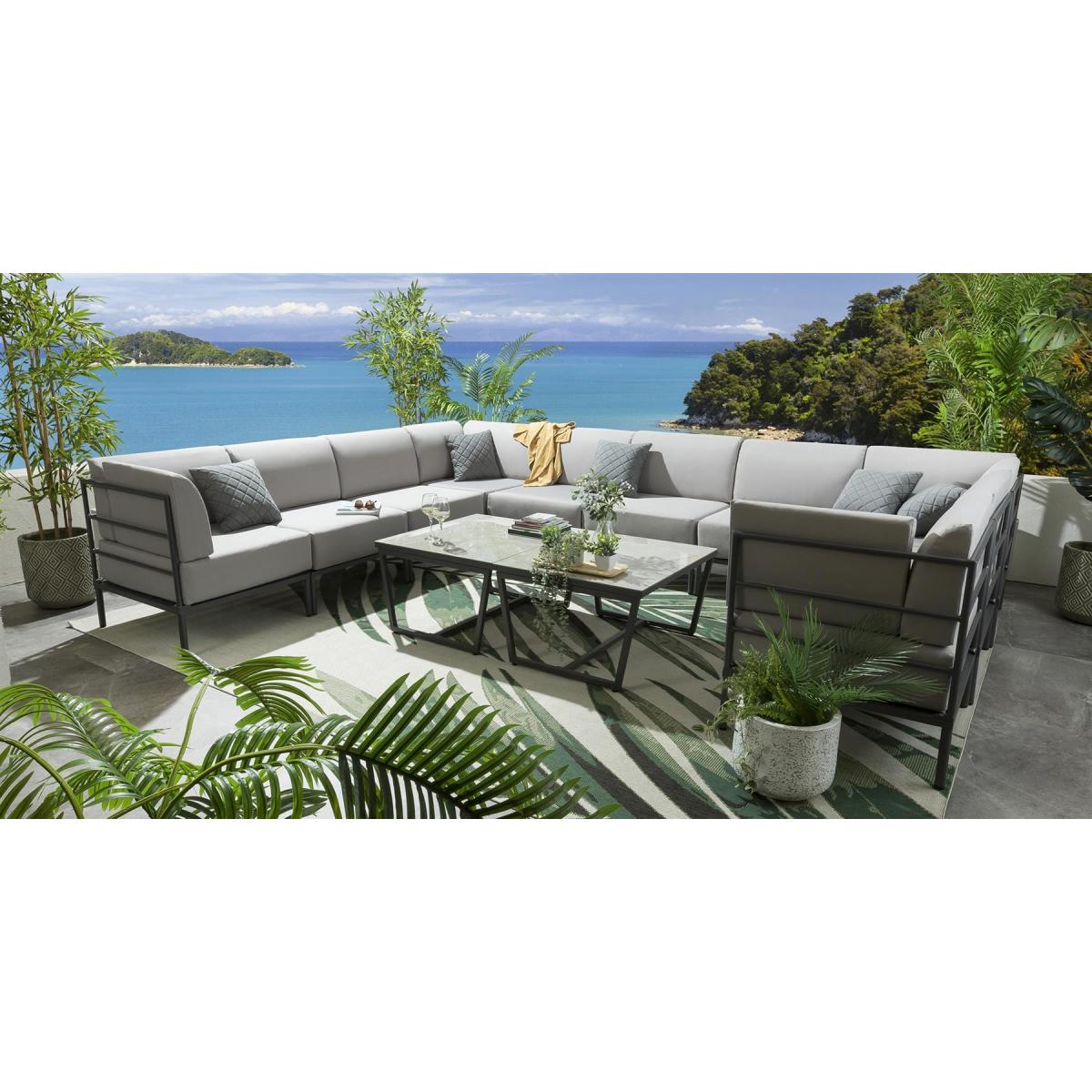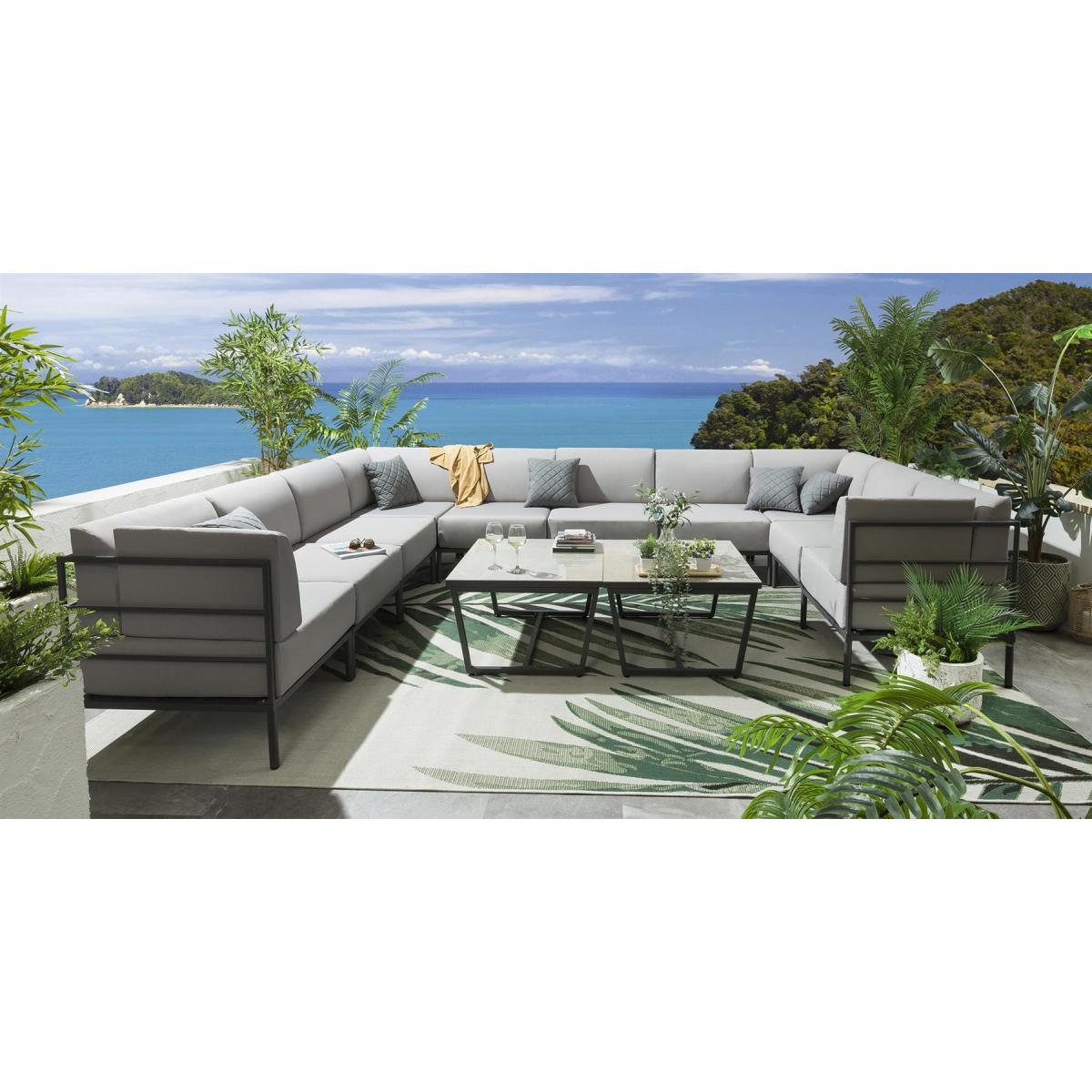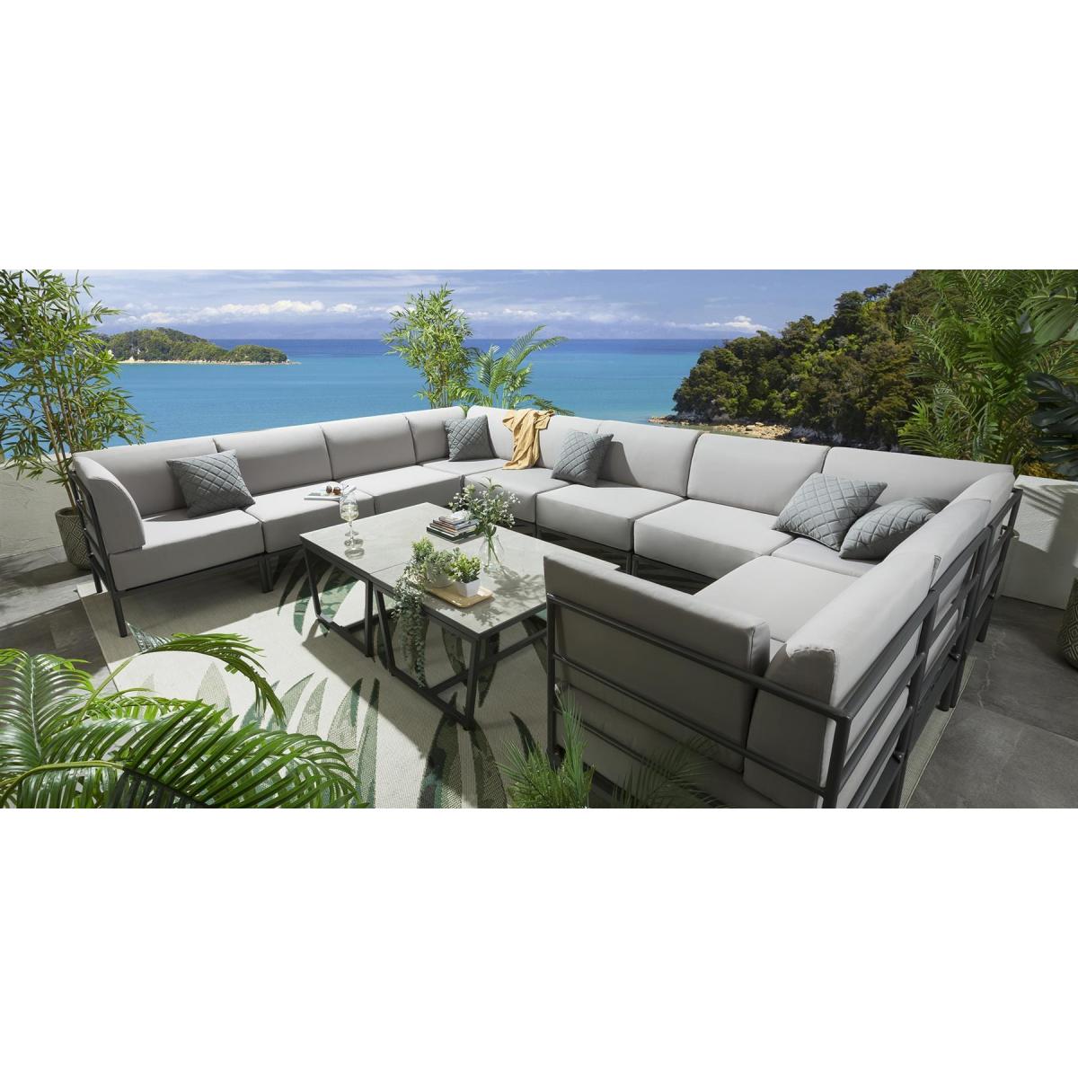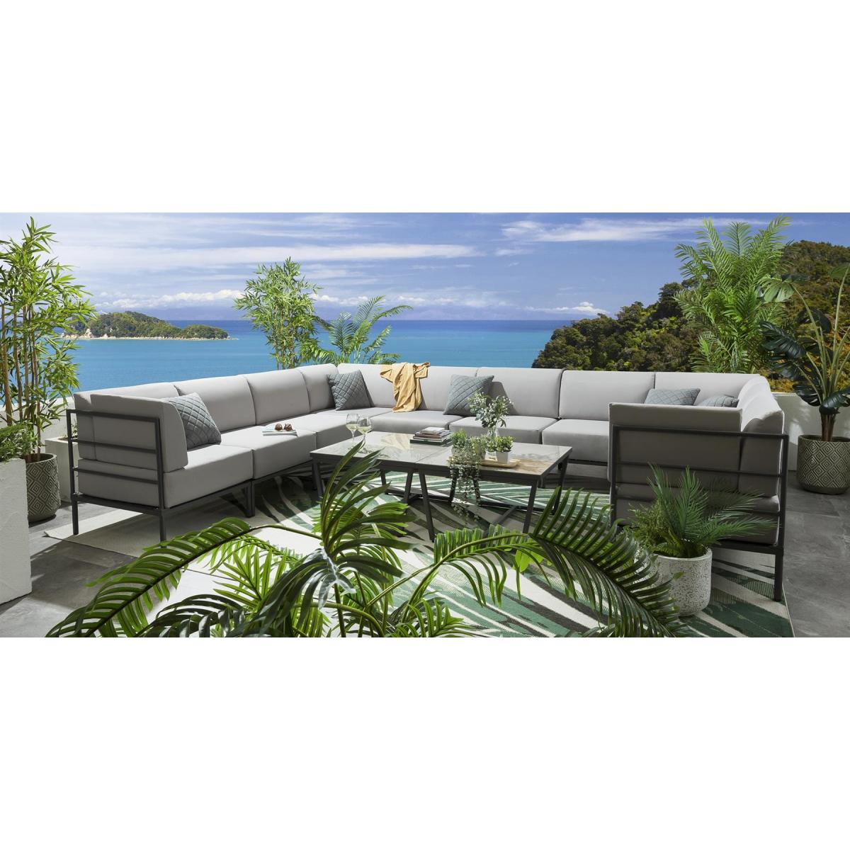 Add a touch of outdoor luxury to garden with the Alfie Large U-Shape Corner Garden Sofa. The sofa cushions are covered in a premium outdoor silver coloured fabric. Crafted with a fully modular design, the possibilities are infinite as you curate a personalised outdoor sofa arrangement to complement your patio. The robust frame, crafted entirely from aluminium and outfitted with premium stainless steel fittings, withstands the most arduous weather conditions, ensuring durability for years to come. The Alfie garden sofa range also features a matching coffee table, embellished with a real ceramic top that is resistant to scratches, adding a touch of glamour to any outdoor oasis. Relax in the garden and indulge in the exquisite Alfie outdoor sofa collection, a masterpiece years in the making. Our dedication to perfection has resulted in an unparalleled garden sofa that exudes opulence and sophistication and at great value. The outdoor sofa collection features comfortable foam cushions that can be removed and stored away when not in use. The sofa set also includes clips to attach the modular pieces together in your desired configuration. W360cm D288cm H73cm Fully modular design: this set includes 4x corner sections, 6x middle sections Coffee Tables are NOT included