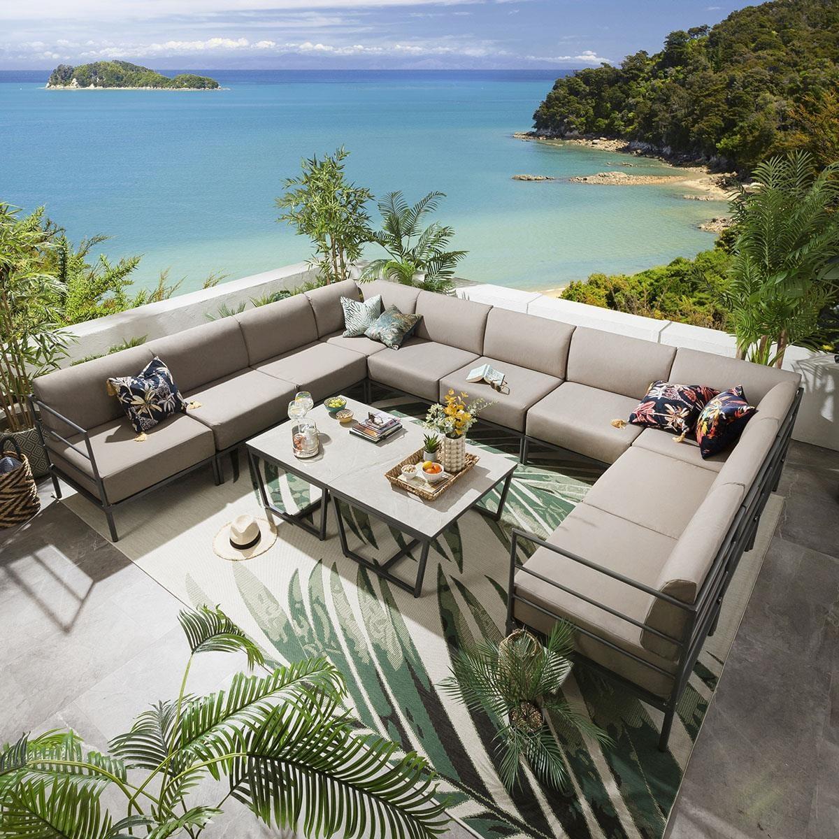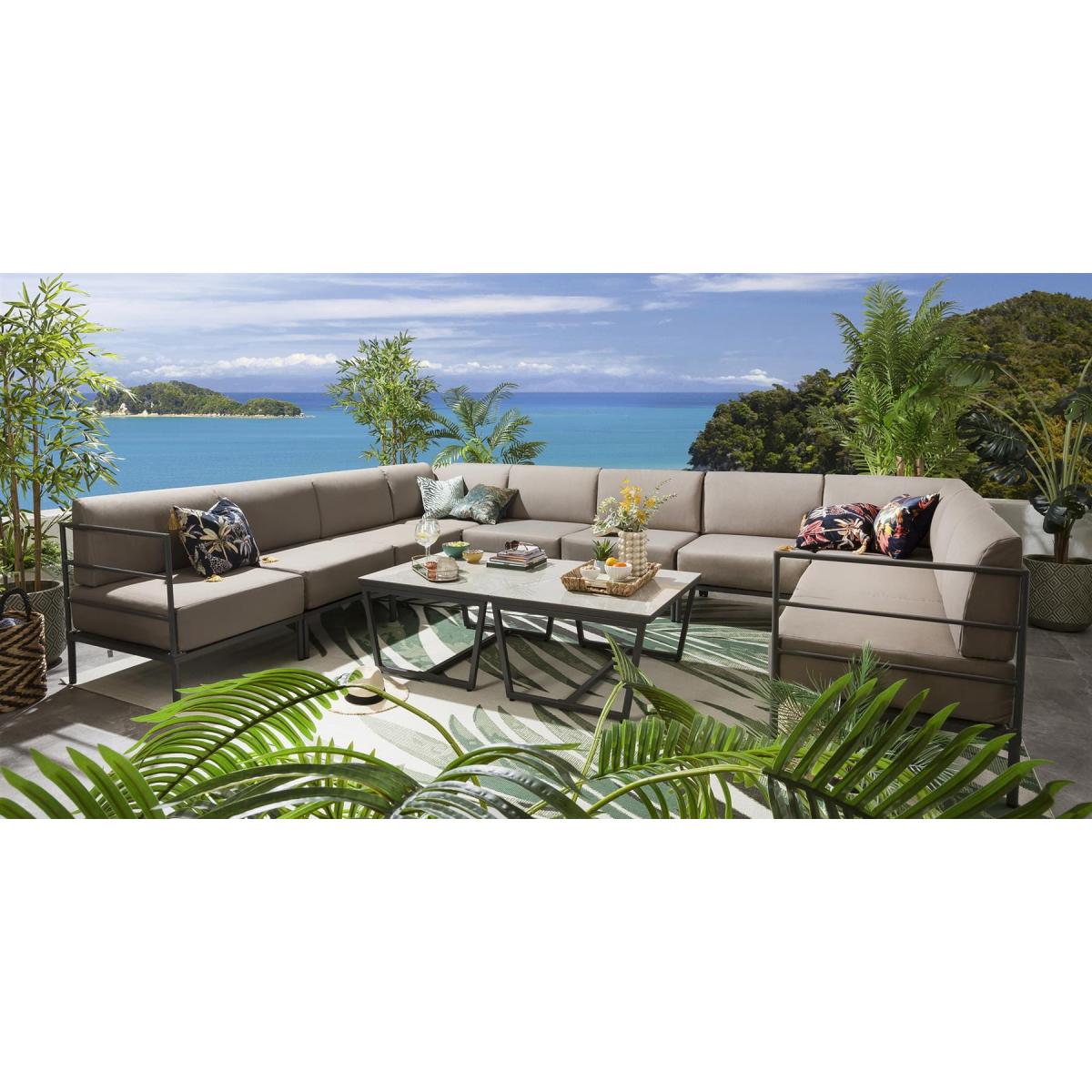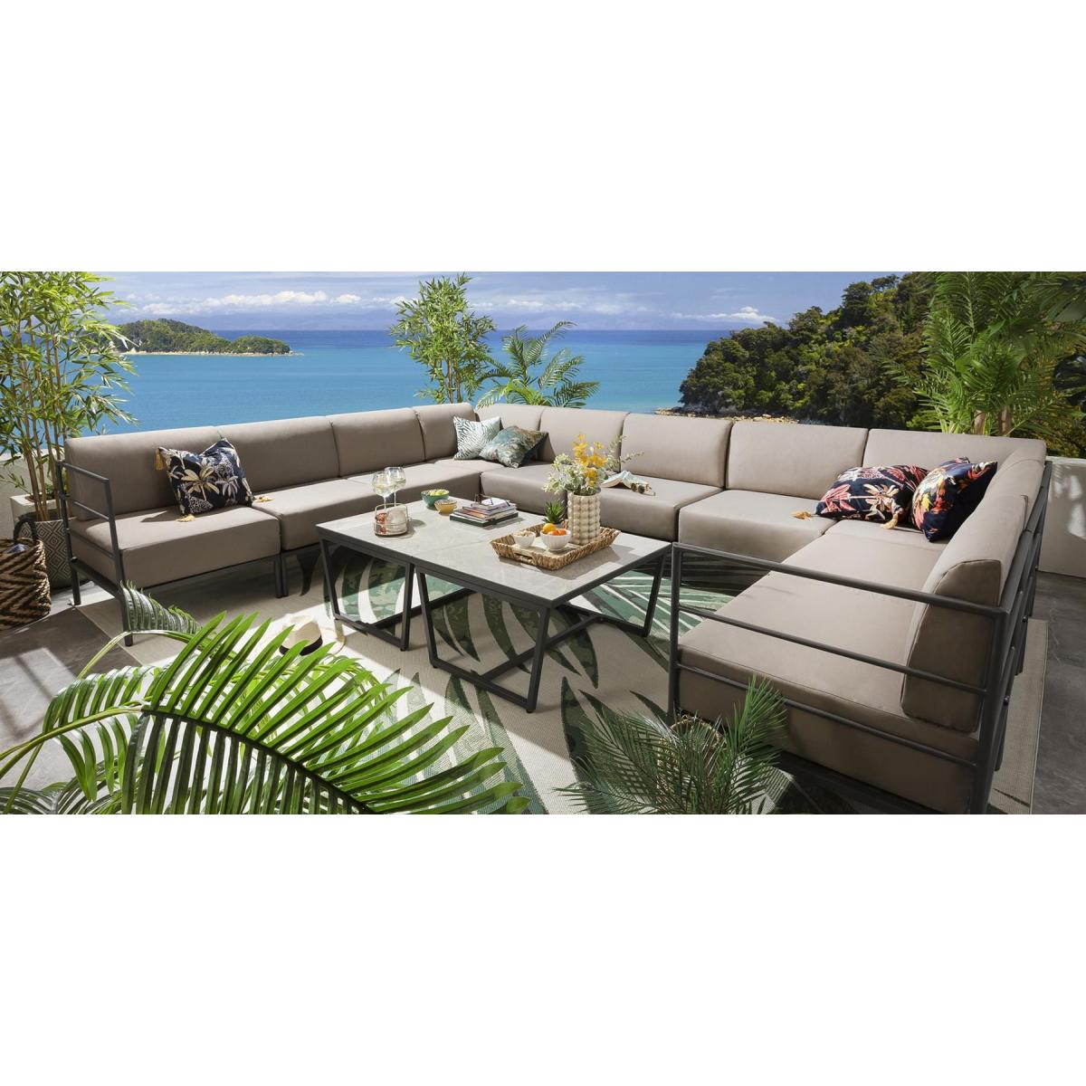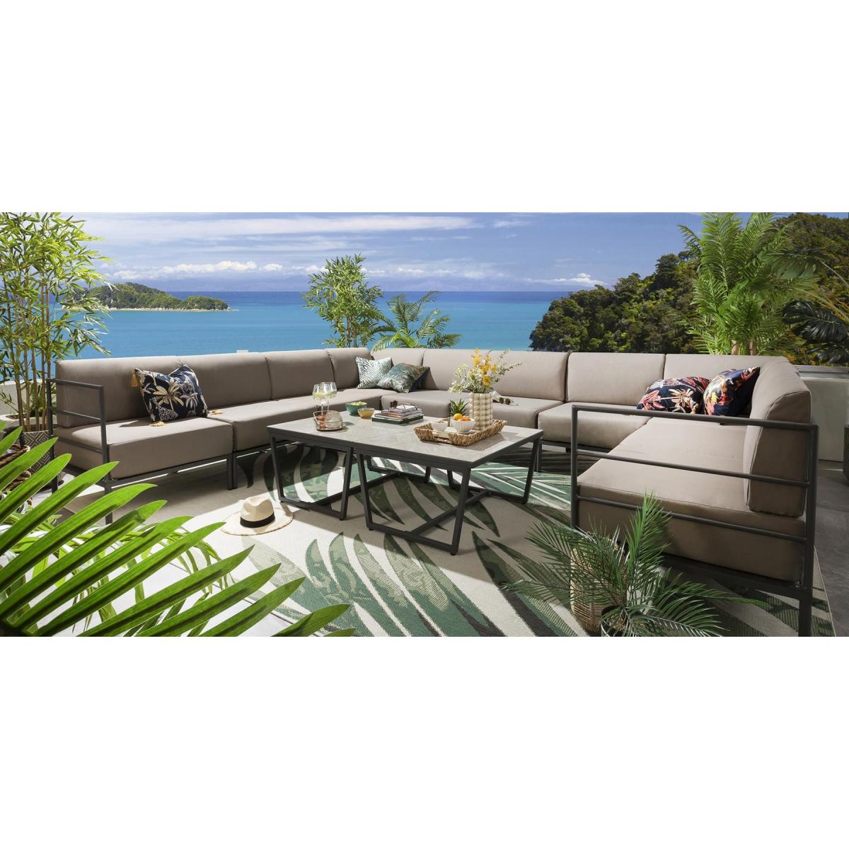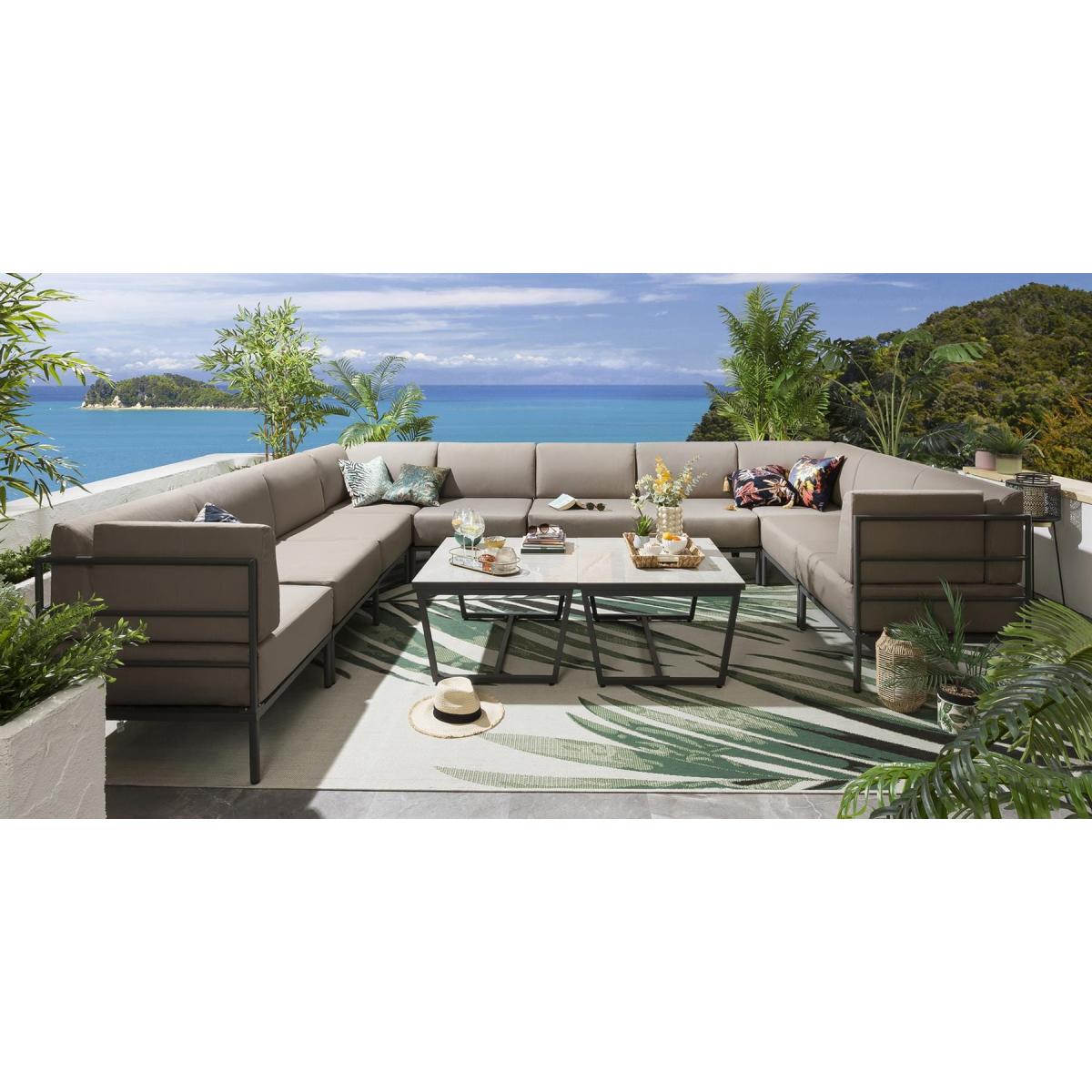 Add a touch of outdoor luxury to garden with the Alfie Large U-Shape Corner Garden Sofa. The sofa cushions are covered in a premium outdoor coffee coloured fabric. Crafted with a fully modular design, the possibilities are infinite as you curate a personalised outdoor sofa arrangement to complement your patio. The robust frame, crafted entirely from aluminium and outfitted with premium stainless steel fittings, withstands the most arduous weather conditions, ensuring durability for years to come. The Alfie garden sofa range also features a matching coffee table, embellished with a real ceramic top that is resistant to scratches, adding a touch of glamour to any outdoor oasis. Relax in the garden and indulge in the exquisite Alfie outdoor sofa collection, a masterpiece years in the making. Our dedication to perfection has resulted in an unparalleled garden sofa that exudes opulence and sophistication and at great value. The outdoor sofa collection features comfortable foam cushions that can be removed and stored away when not in use. The sofa set also includes clips to attach the modular pieces together in your desired configuration. W360cm D288cm H73cm Fully modular design: this set includes 4x corner sections, 6x middle sections Coffee Tables are NOT included