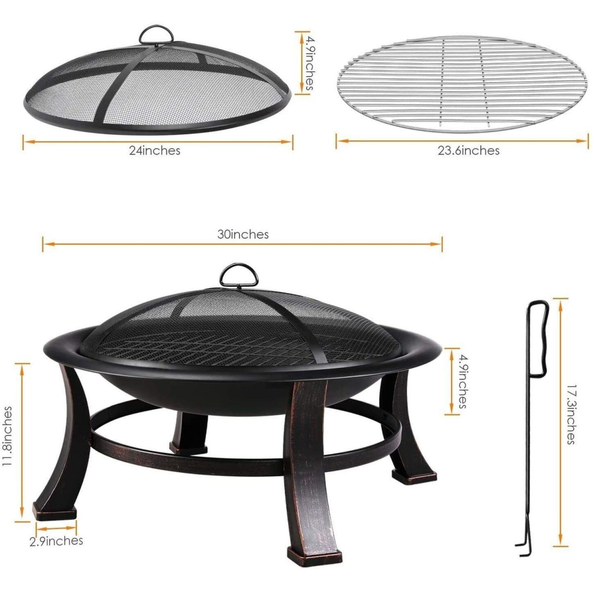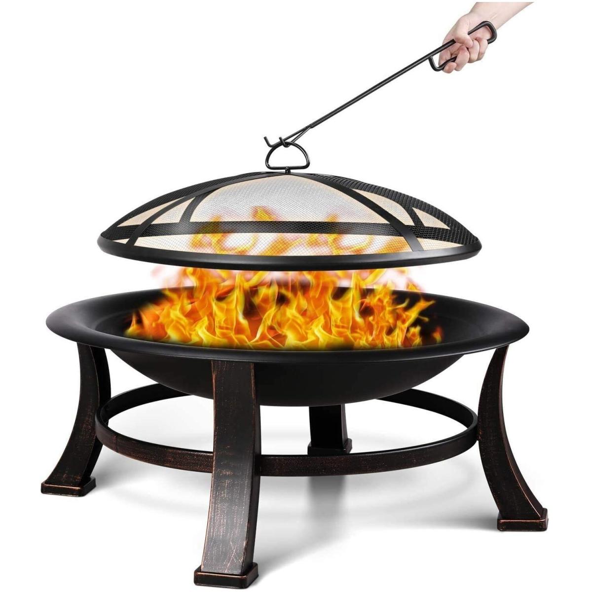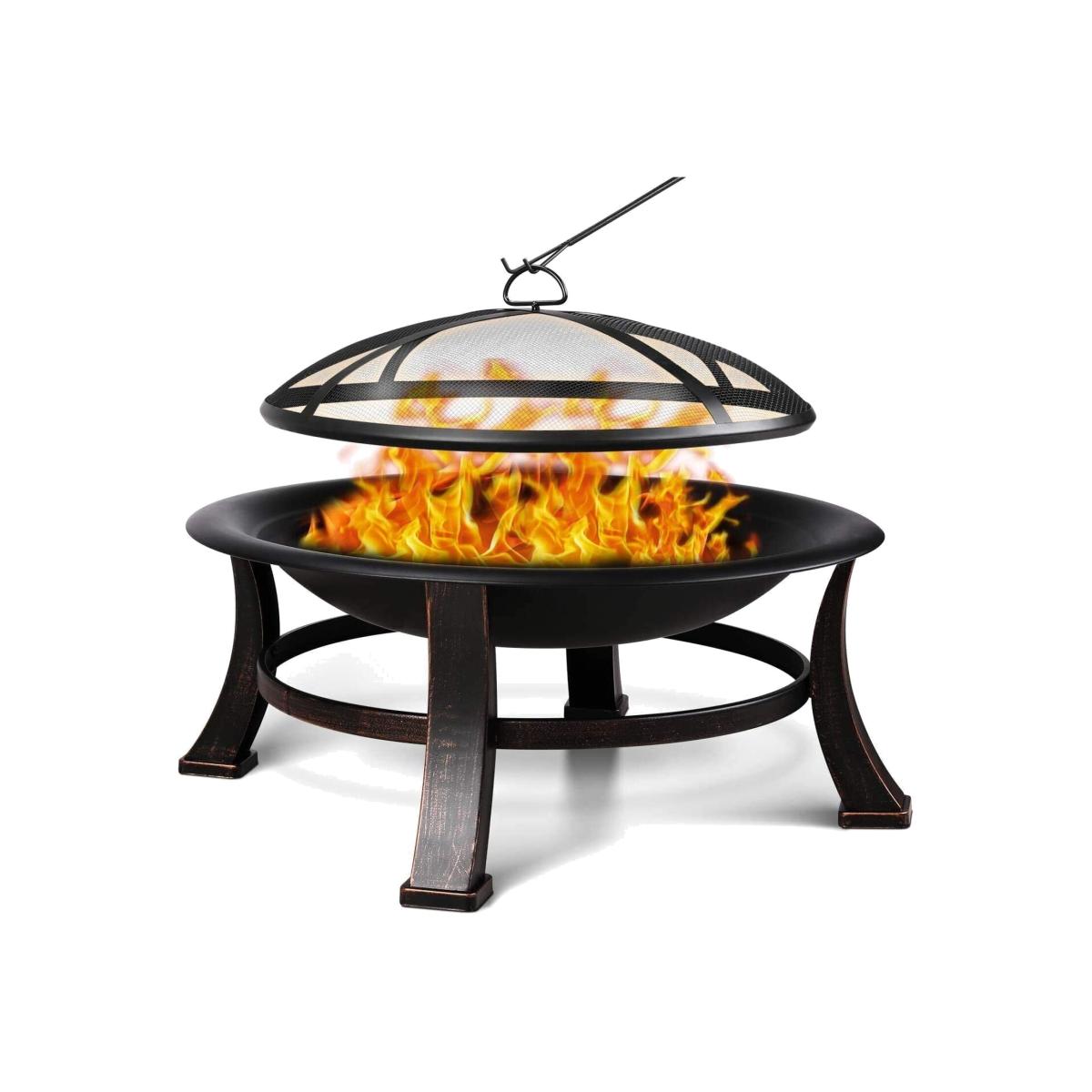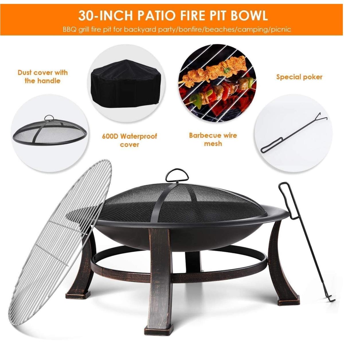 Retro frame design, with round fireplace with heat resistant black coating, iron brazier (heat resistant temperature up to 500 Degrees, easy to use with charcoal, logs and wood), The large brazier can meet the requirements of multiple bonfire party and multi-person barbecue party, giving you a classic bonfire experience. This fire pit is equipped with a barbecue grill. Equipped with practical spark protection, it can safely surround the fire and prevent sparks and foreign bodies from flying. There is also a poker, which can be used to remove the safety net when it is too hot. Black, high temperature resistant, sturdy and durable, rustproof. The fireplace structure consists of a compact and durable support ring and four table legs, which makes the fire pit very stable and durable. The large capacity charcoal bowl can hold more charcoal or wood. Quick assembly and disassembly. The main body of the brazier and the grill can be quickly assembled by simply connecting the 4 feet of the base and the support ring. This garden fire pit is perfect for summer barbecues and cold winter nights, providing warmth and creating a warm atmosphere. With 600. D waterproof protective cover:The garden basket is equipped with a 600. D high-density waterproof cover, which can perfectly protect the bowl from dust, leaves and rain.