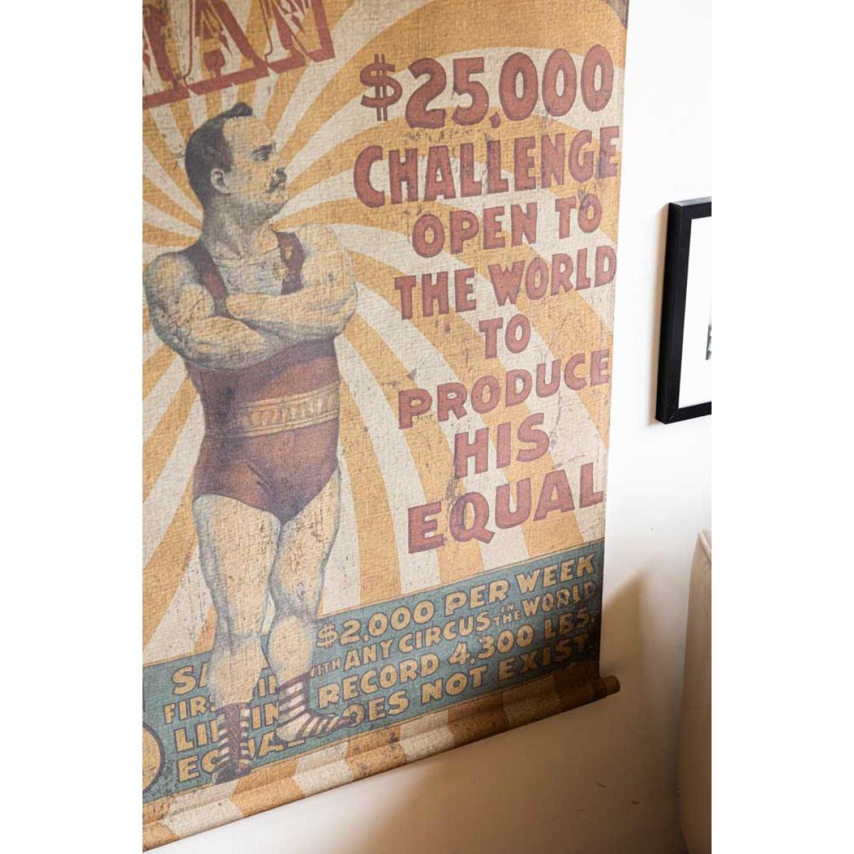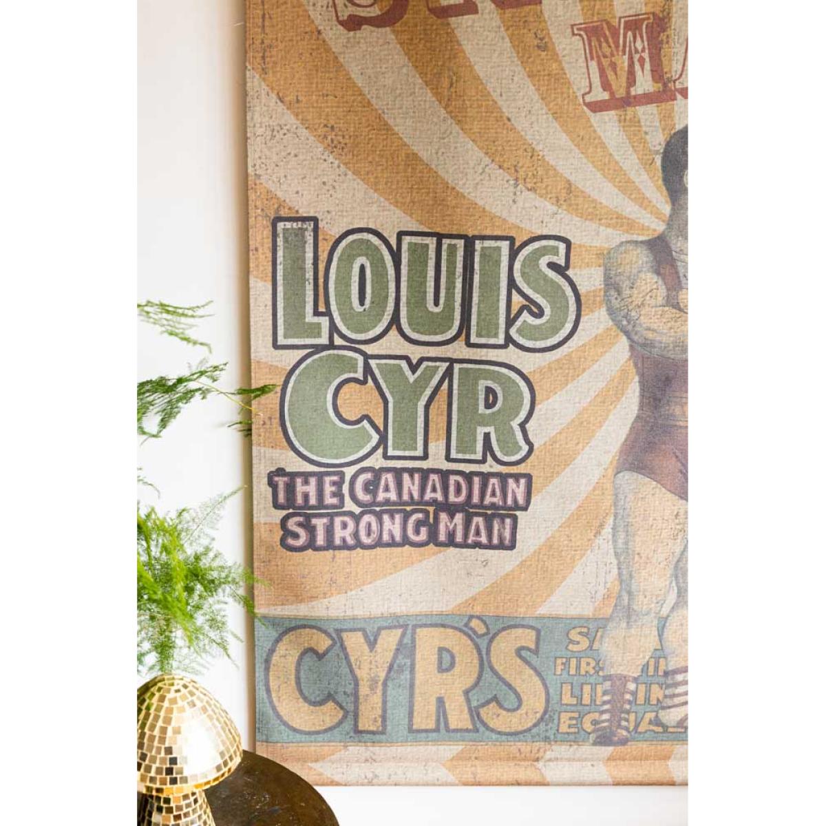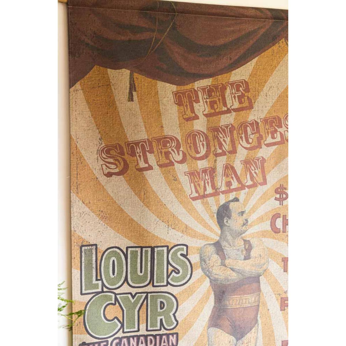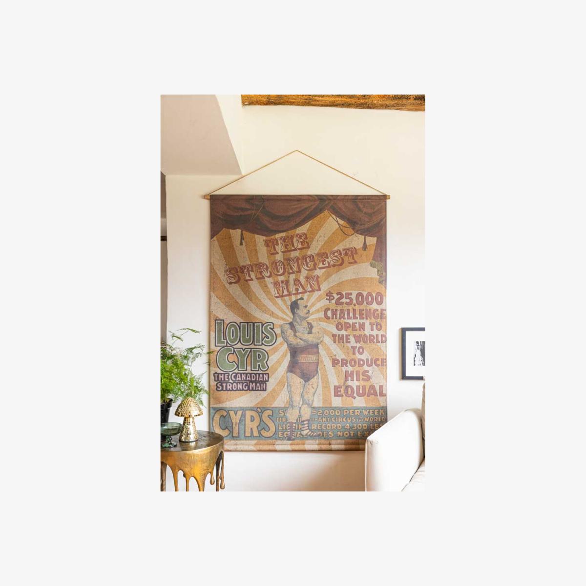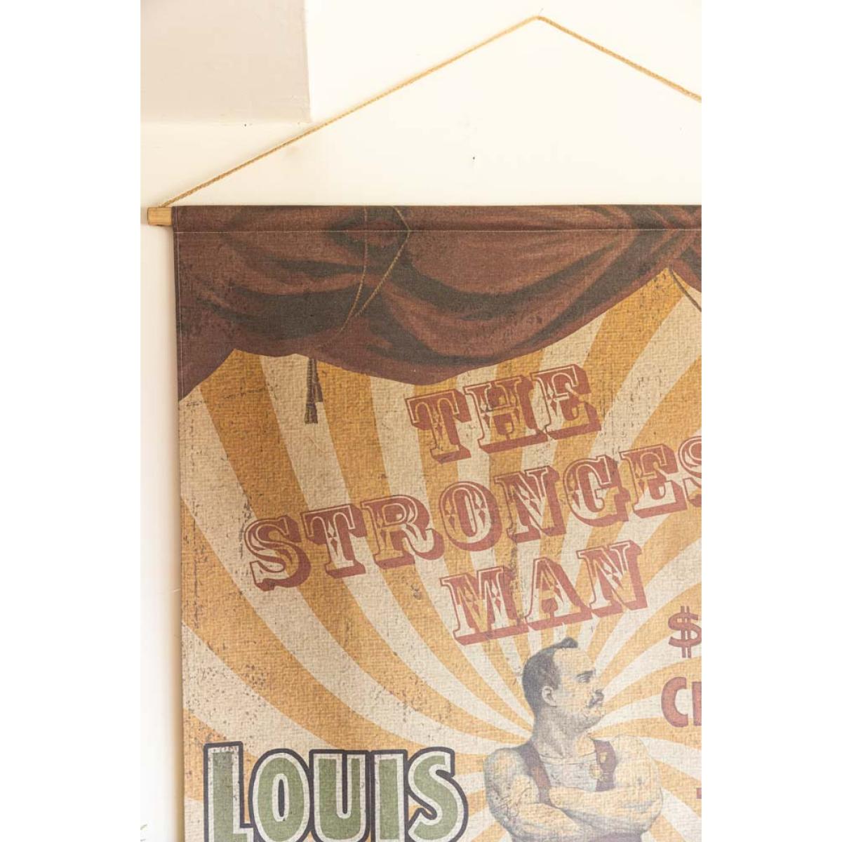 <!--td --> Make way for the star of the show with our Large Vintage-Style Strongest Man Wall Art! This bold, brilliant art print is pure circus nostalgia, featuring the ultimate strongman striking a pose in his classic old-school getup – set against a striking white and yellow spiralling backdrop, with grand curtains parting to reveal the main man. The worn, weathered finish gives it that perfect antique shop charm, like a hidden gem from the golden age of the circus. It’s dramatic and totally one-of-a-kind – the kind of wall art that flexes some serious personality. This vintage-style wall hanging piece is absolutely perfect for injecting those playful vibes from the circus bygone era straight into your home. Plus, who doesn’t want the world's strongest man in their living room? - Large Vintage-Style World's Strongest Man Wall Art - Measures: W106cm x H145cm - Materials: Canvas & Wood