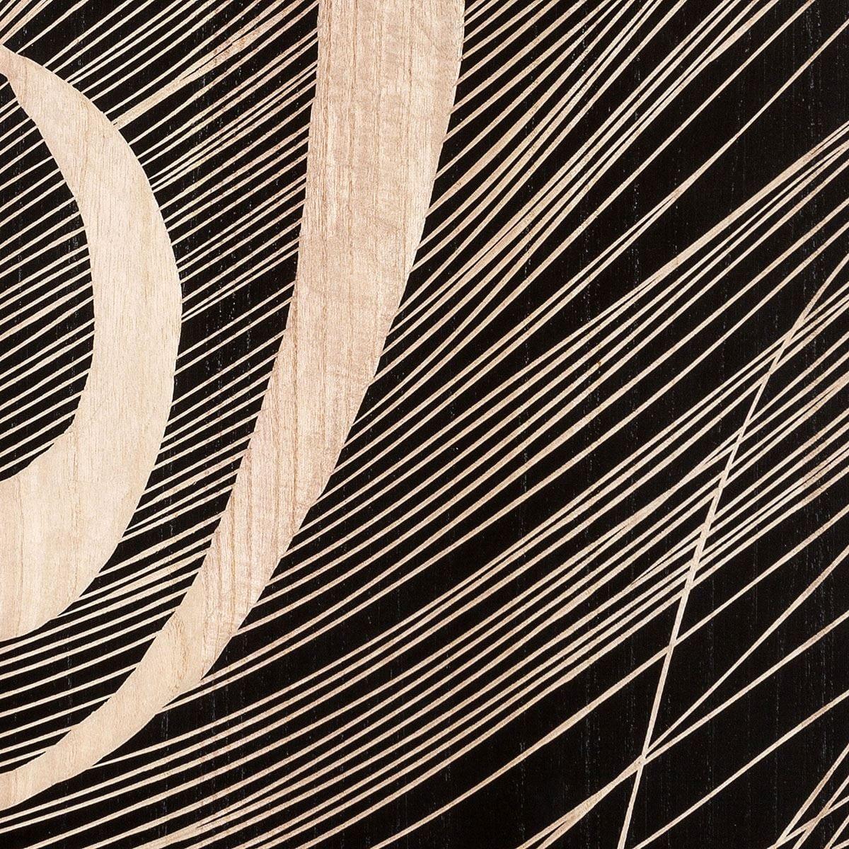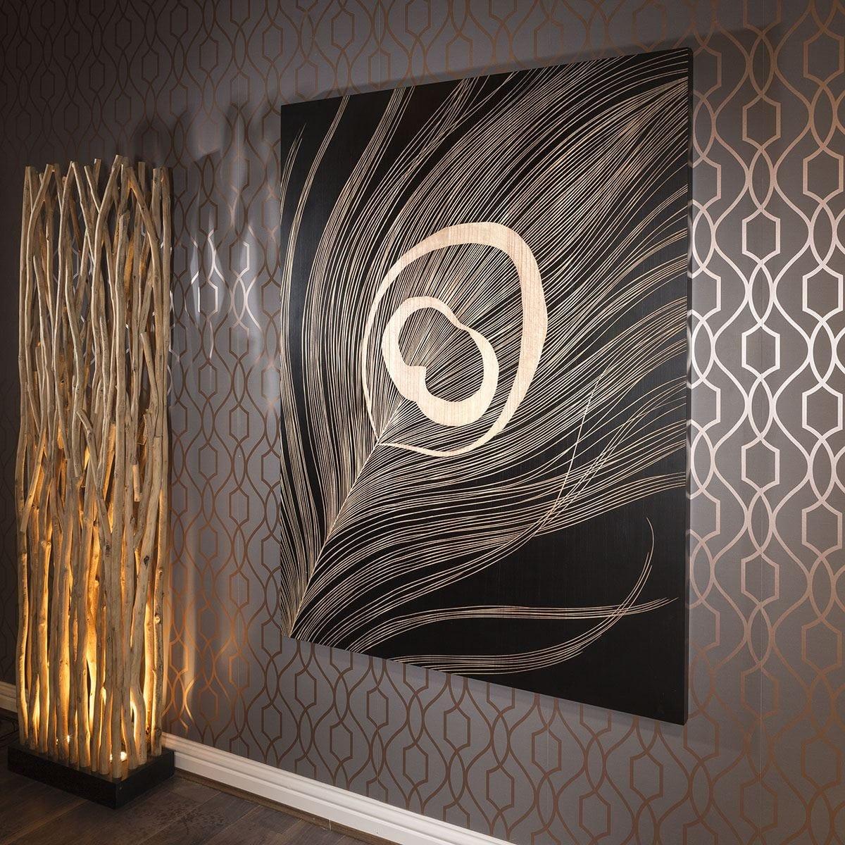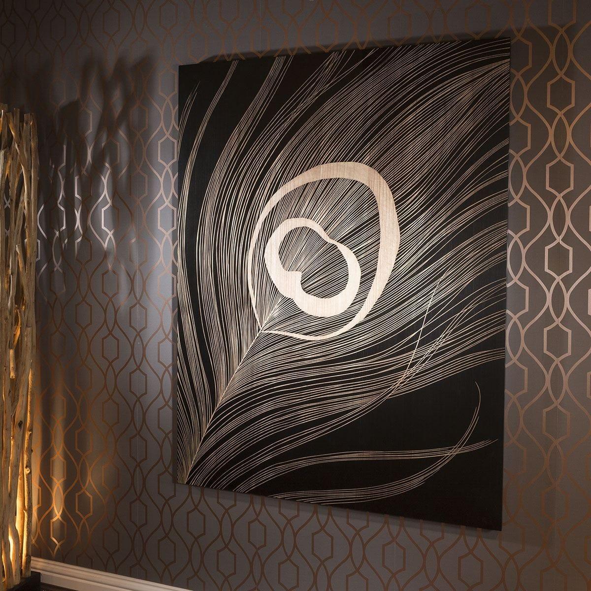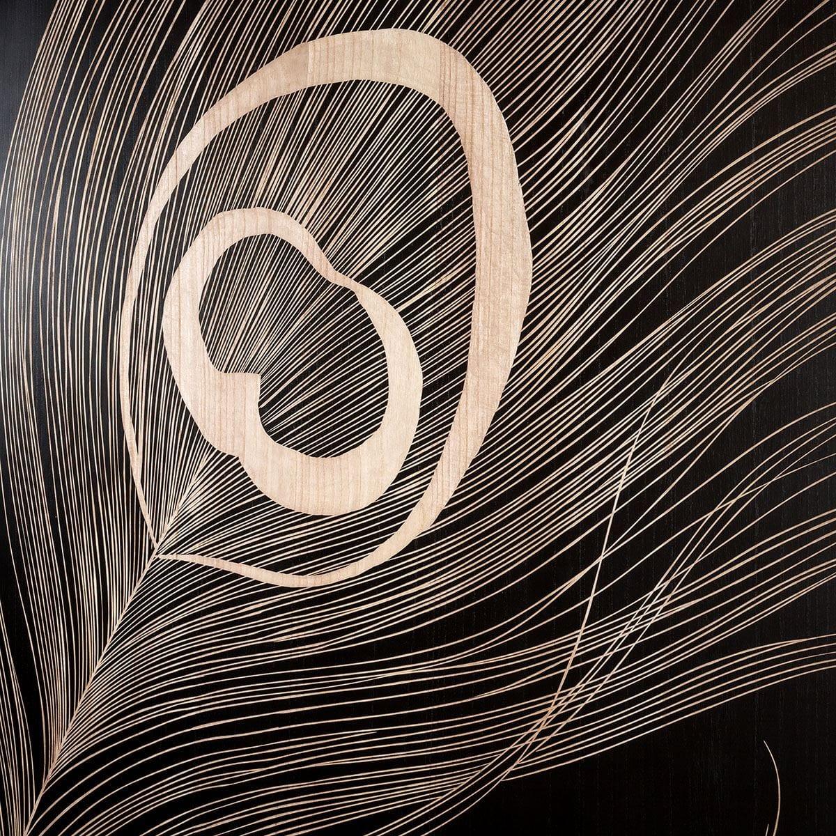 Stunning black and white image of a peacock feather on paulownia wood. The solid wooden board is first stained mat black, then the feather is painstakingly hand carved into the wood to reveal the delicate golden beauty of the wood below. Hanging clips are included which can be easilty moved to enable horizontal mounting but wall fixings are not included. W120cm D4cm H160cm Hand Carved Quatropi Modern Home Accessories