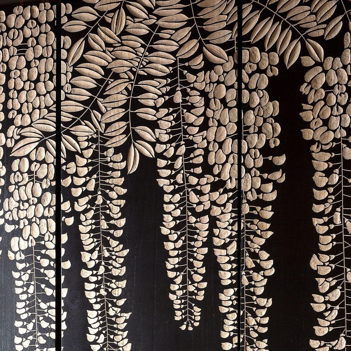 Stunning four panel art work on paulownia wood with a wisteria flower design. The wisteria is painstakingly hand carved into the wood one strand at a time to reveal the delicate beauty of the golden wood below. Hanging clips are included but wall fixings are not.