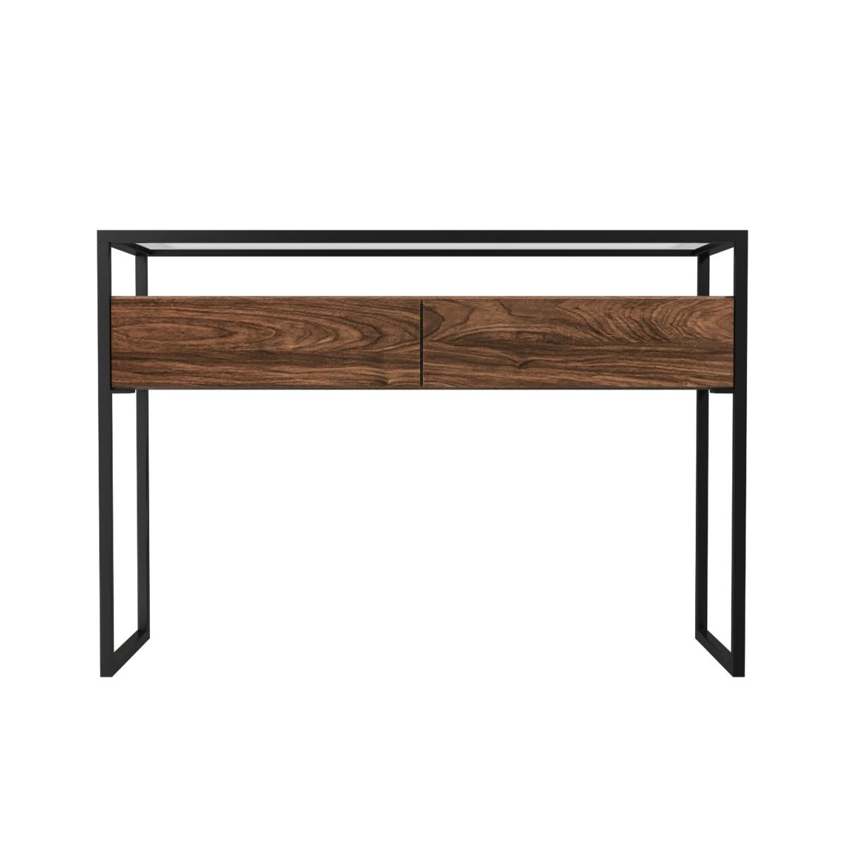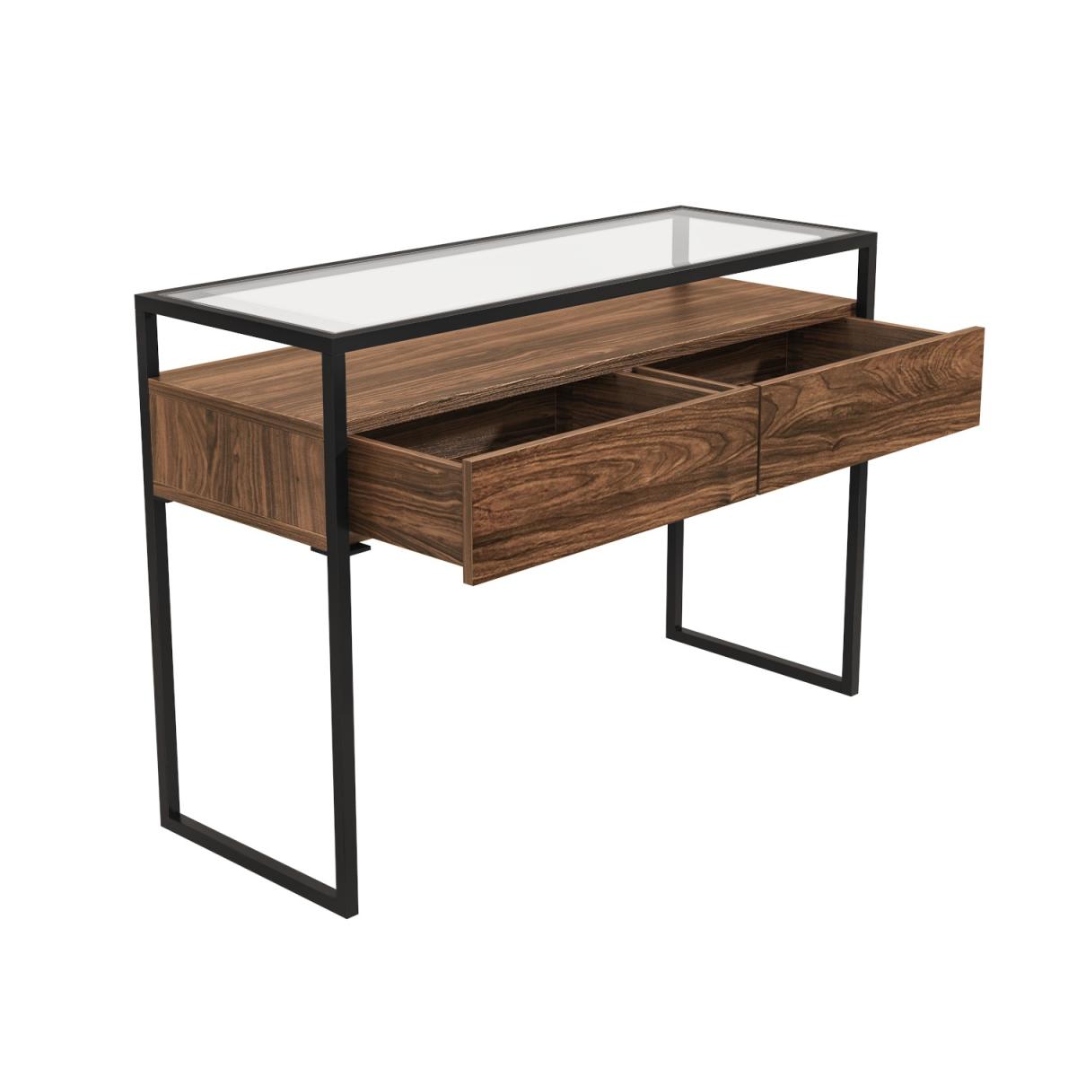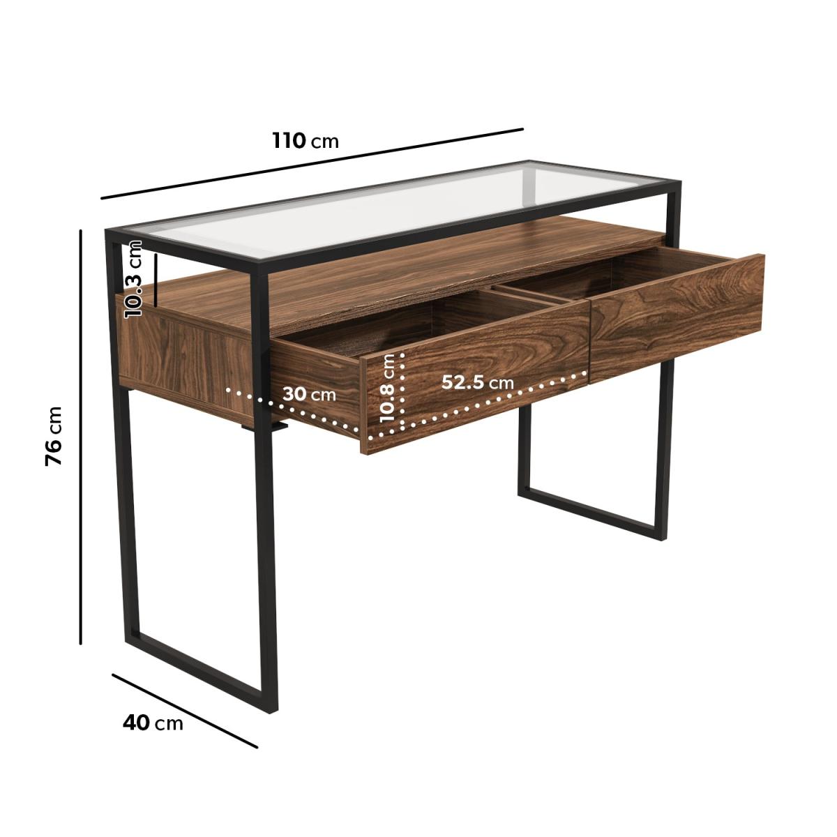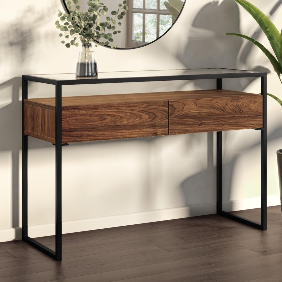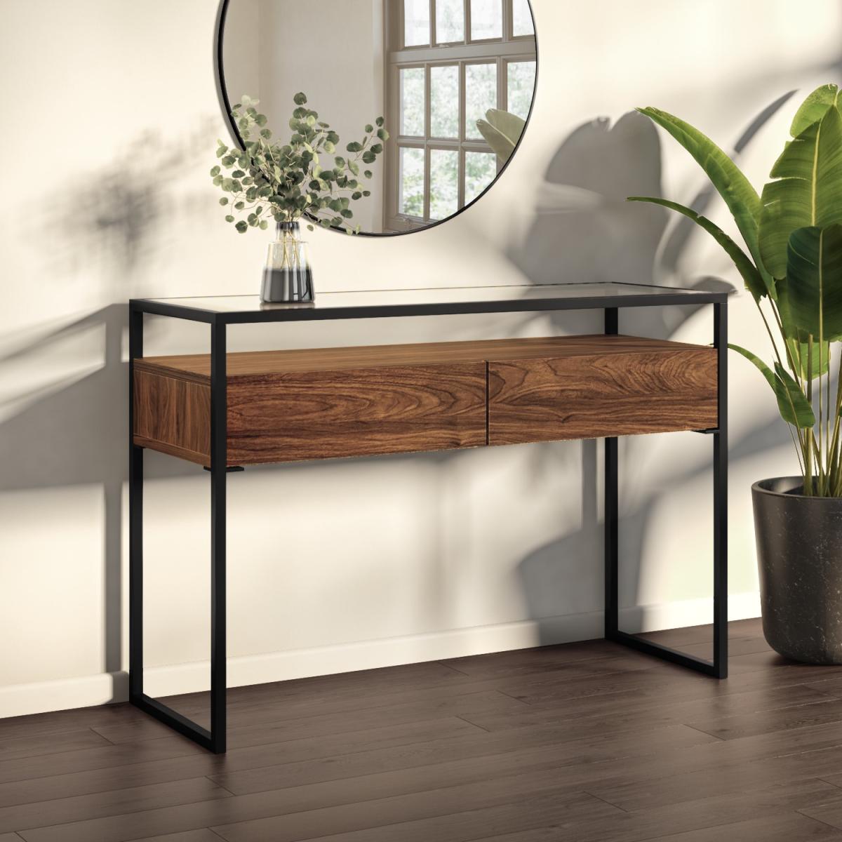 Walnut effect console table with a glass top Split-level storage with two shelves and two drawers Open & closed storage is great for hallway essentials Durable and sturdy construction with a metal frame Stylish and practical this modern unit wipes clean Need to know Weight: 30kg Maximum load weight: 100kg Colour: Brown Finish: Paper foil Material: MDF, metal and tempered glass Assembly required: Yes