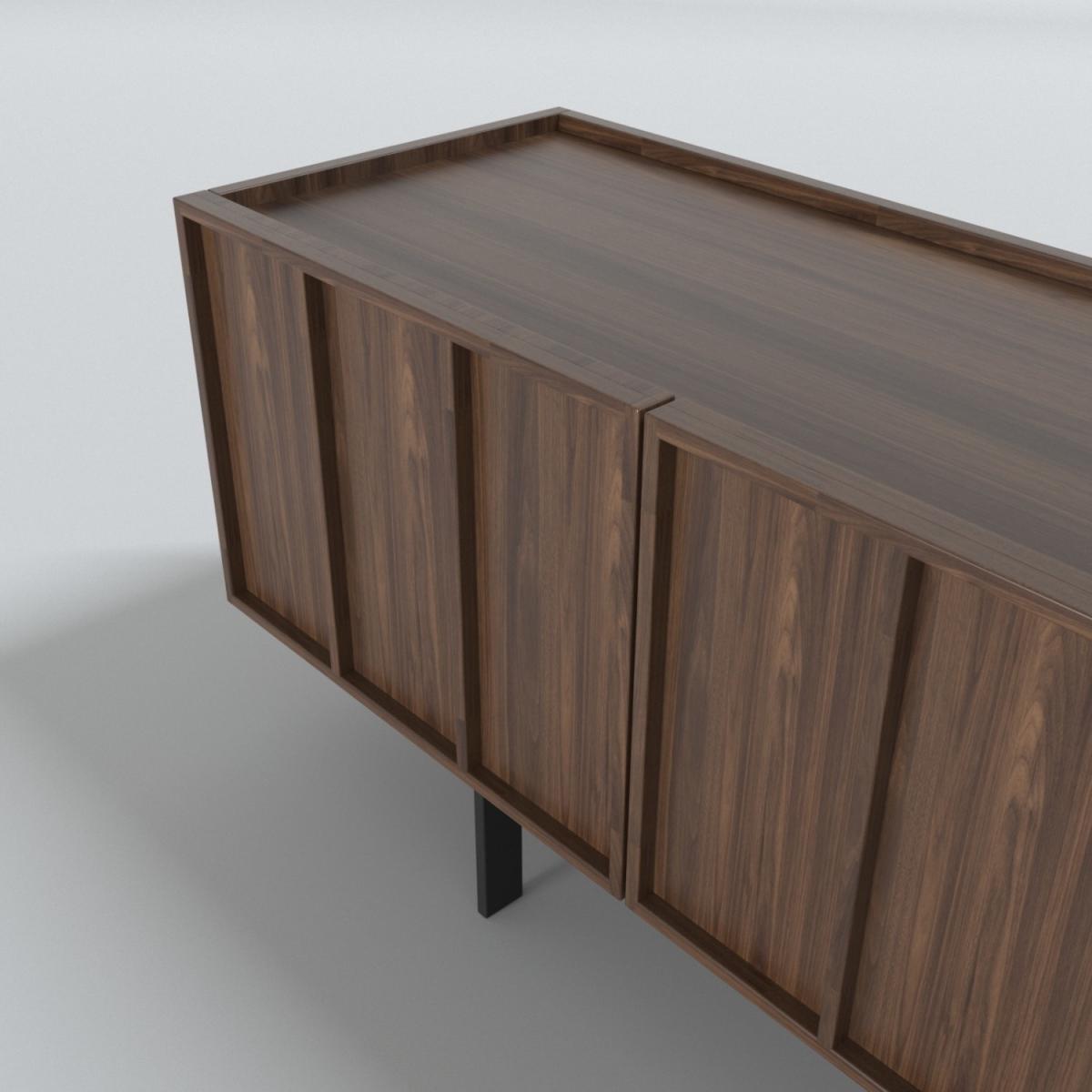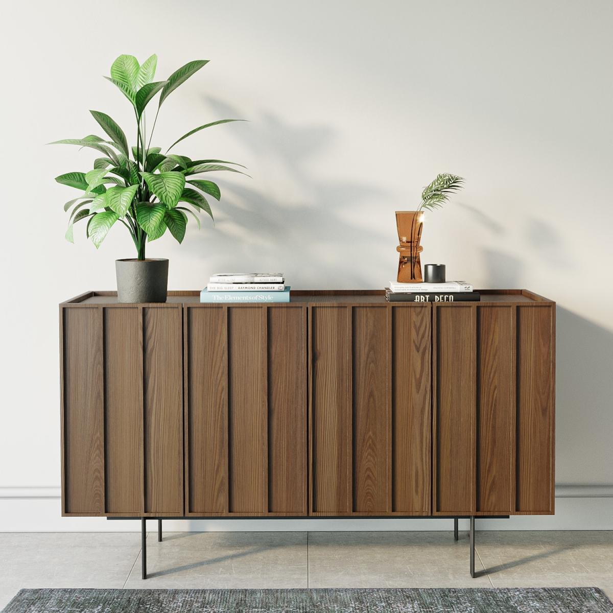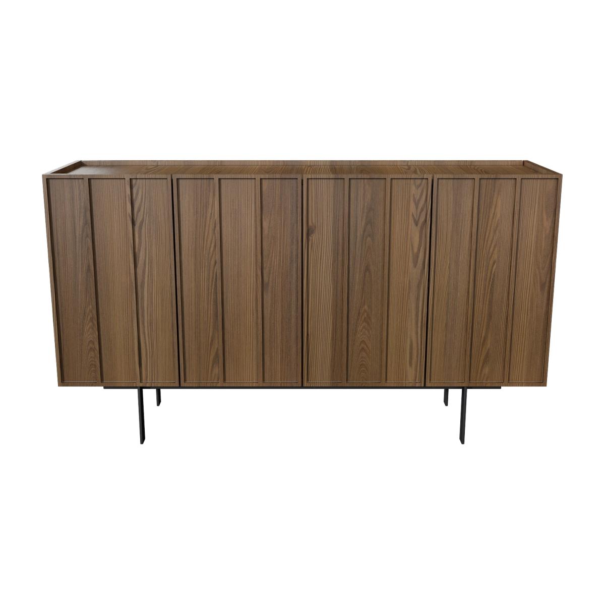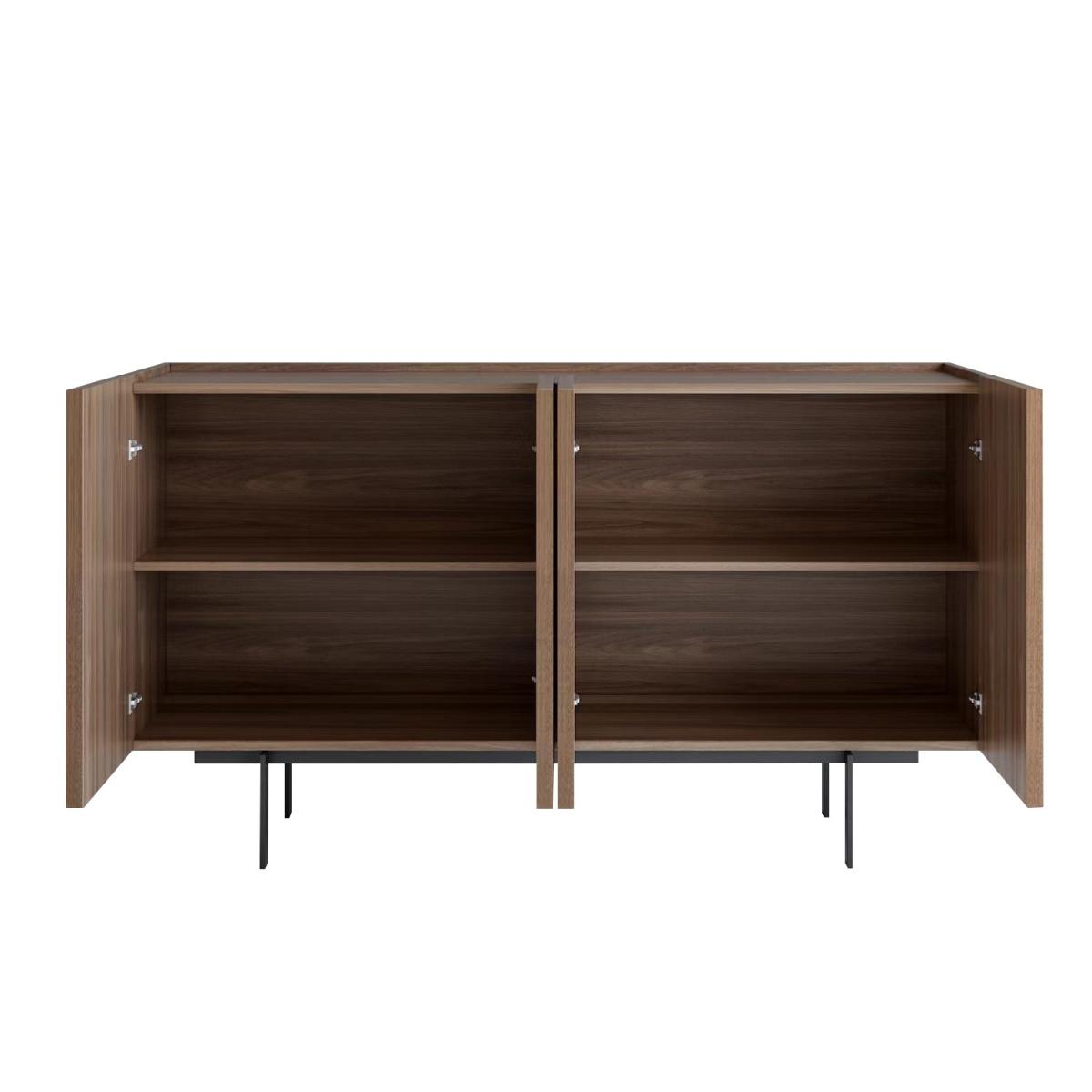 Features we love Statement piece with eye-catching walnut finish. Generous storage space for your dining room essentials. Modern on-trend design with stylish linear detailing. Large surface area for displaying any decorative items. Black metal legs complement the inlaid cupboard doors. Matching items available in the Helmer range. Need to know. Dimensions. H85 x W150 x D40cm Internal shelves dimensions. H18 x W72 x D37cm Weight. 56kg Colour. Walnut Finish. Walnut veneer Material. Walnut veneer backed with MDF plywood drawers with black powder-coated metal legs and premium German hardware Assembly required. Yes - attaching the legs..