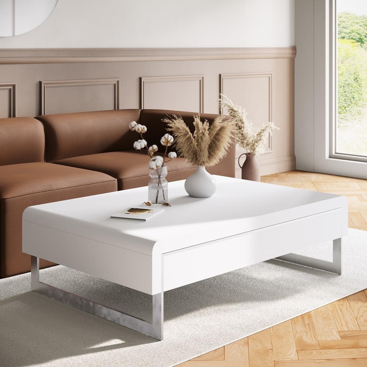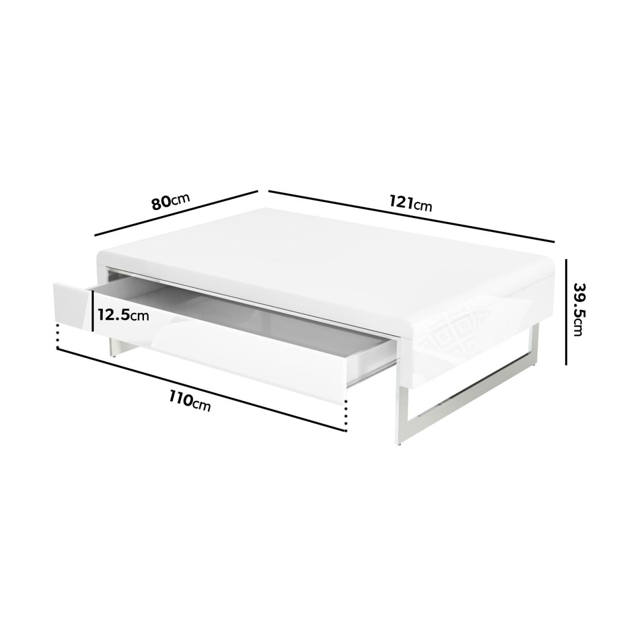 Features we love Clean and contemporary design, perfect for updating your space with a modern touch The perfect spot to stand your drink, snacks or put up your feet Chrome legs and open underneath creates an illusion of space At just 39.5 cm tall, this coffee table won't obstruct your view Stunning high-gloss finish gives it a natural shine and it's super easy to wipe clean All about me Modern and simple, there's nothing about this coffee table that you won't love. Its large, square design makes it the perfect centrepiece for your seating area. Stainless steel legs create the illusion of an almost floating top while also allowing more light into the room. The contemporary high gloss finish looks fantastic and is so easy to maintain. Need to know Dimensions:H39.5 x W121 x D80 cm Package dimensions:H14 x W135 x D93.8 cm Internal dimensions:H12.5 x W110 x D40 cm Maximum load weight: 10kg Product weight: 26.7kg Material: MDF and stainless steel Finish: White high gloss Assembly required