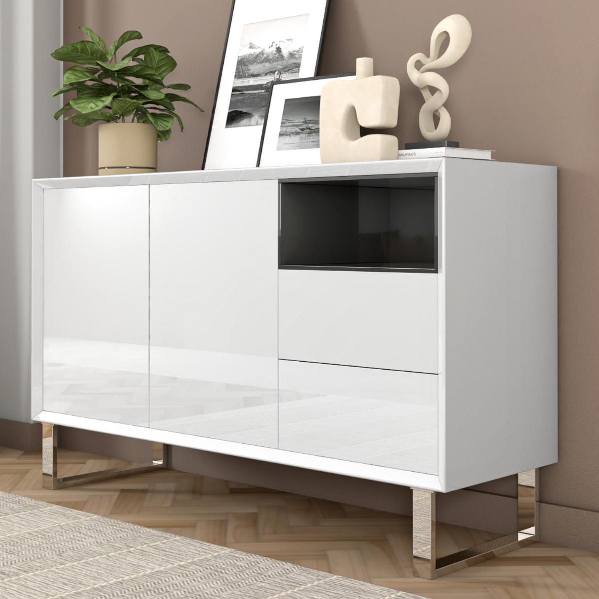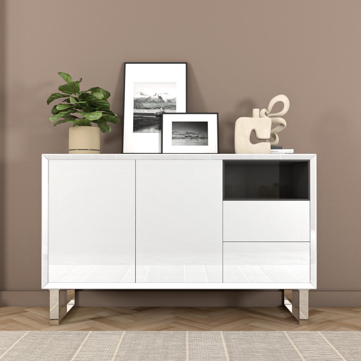 Features we love White high-gloss sideboard with stainless-steel legs. Features 2 push to open doors 2 push to open drawers with 5 compartments. The perfect focal point for a contemporary dining room. Inlaid grey compartment adds a stylish focal point. High-quality construction with mitre edge detailing. Need to know. Dimensions. H75 x W120 x D40cm Weight. 51kg Colour. White Finish. High-gloss Material. MDF and metal Assembly required. Yes..