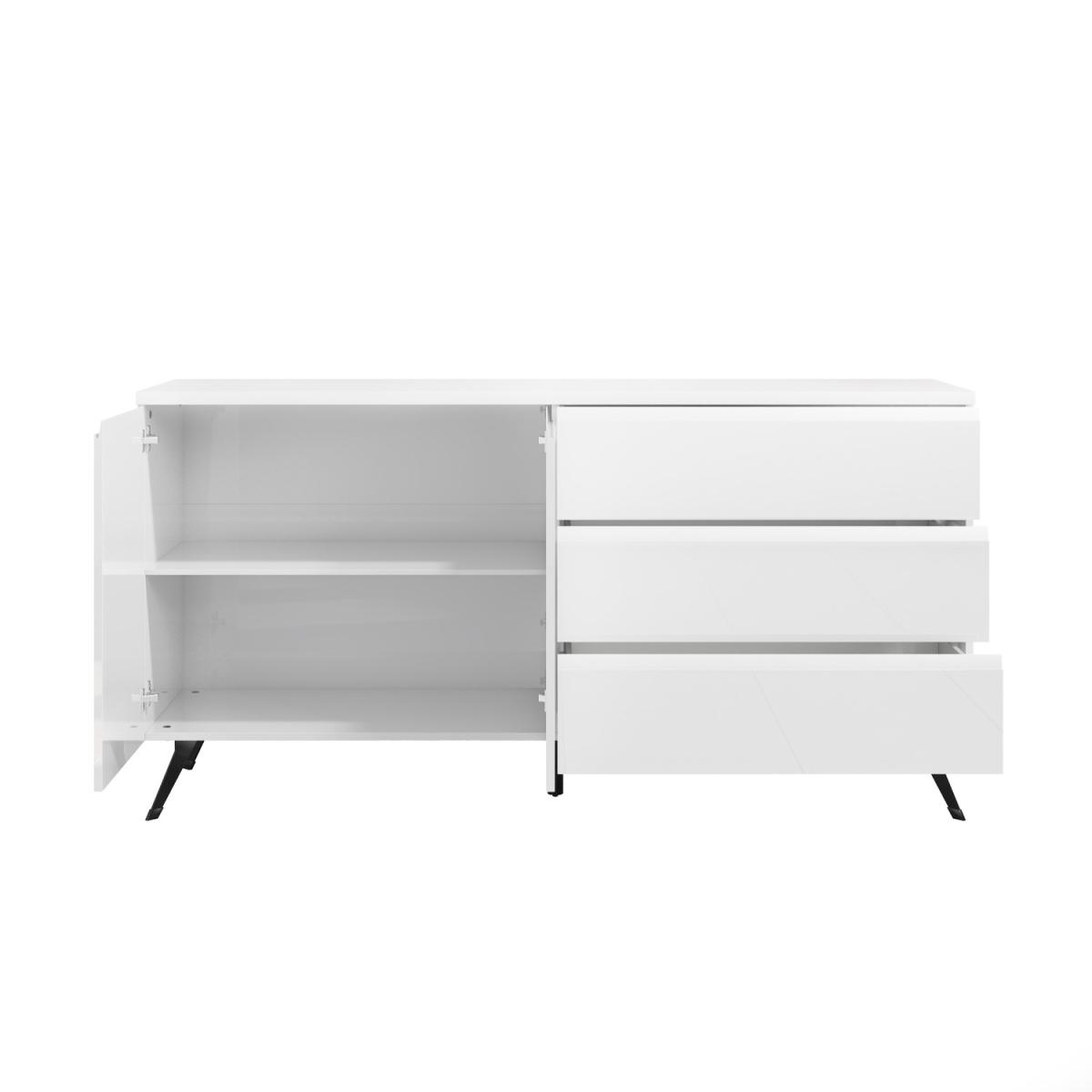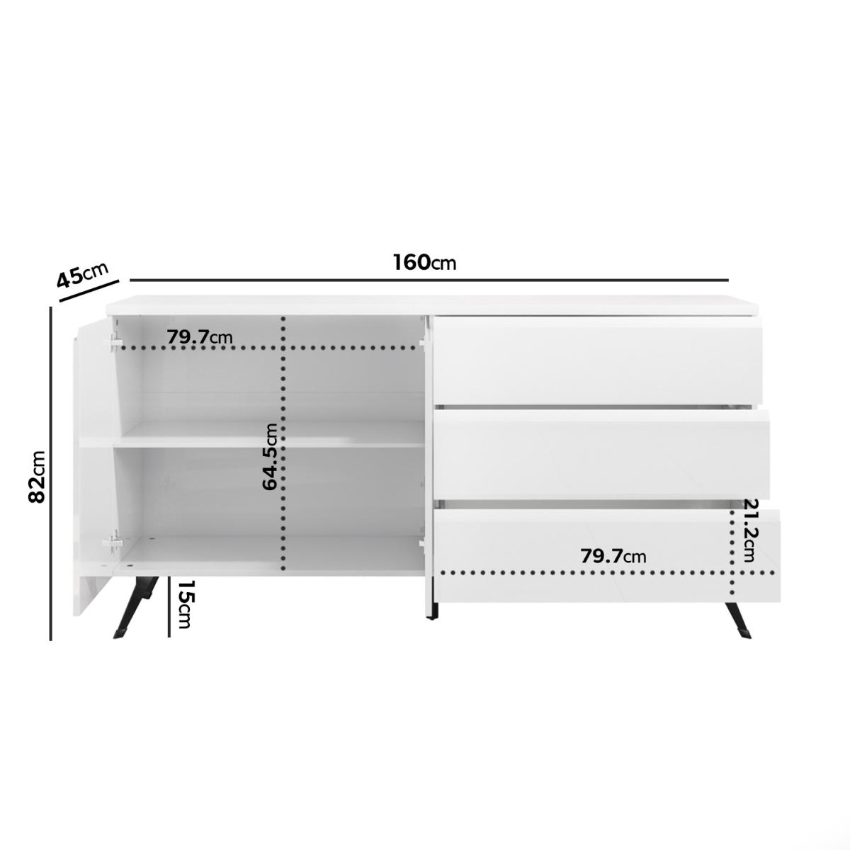 Features we love The white high gloss finish complements the black legs. Clean crisp lines add a distinct contemporary style Sleek storage solution creates a minimalist feel. The perfect addition to enhance your dining room. Matching pieces available in the Rochelle range. Need to know. Dimensions. H82 x W160 x D45 cm Drawer dimensions. H21.2 x W79.7 x D36.8cm Number of drawers. 3 Number of shelves. 2 Colour. White Tabletop Finish. High gloss lacquered MDF Leg finish. Polished powder coated metal Material. MDF and metal Assembly required. Yes..
