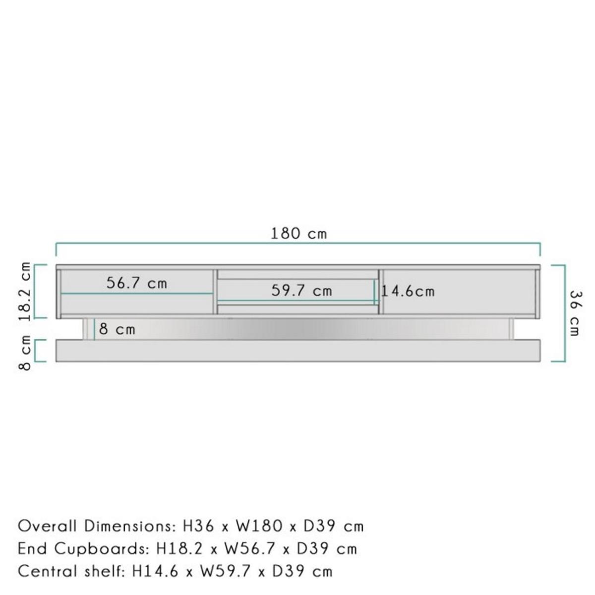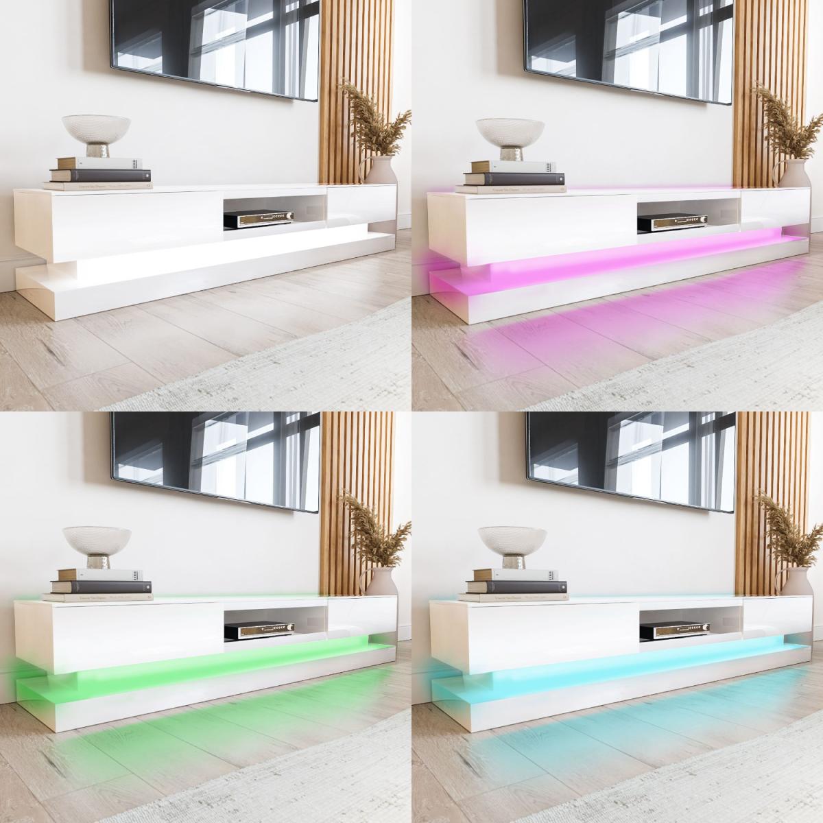 Instantly rejuvenate your space with this stunning TV unit. It features a wide yet narrow design that's perfect for supporting flat screen TV's up to 70" without taking up vital floor space. It even comes with soft feet pads to prevent any damange to your hardfloor. Plus, it comes with plenty of storage space provided via the two soft close drawers and a central shelf, which comes with wire tidy holes to the rear, so you can thread through any cables discreetly out of the way. What sets this TV unit apart from the rest is its contemporary RGB LED lighting. With a wide variety of colours and effects to choose from you can have some real fun with this unit. Select a colour to set the mood, autumnal colours for a cosy night in or fresh vibrant colours for a friendly gathering, the choice is yours. The lighting simply plugs into the mains, using little energy and comes with a remote control so you whiz through all the options from the comfort of your sofa. The TV unit will be delivered flat packed to ensure you get it through all your doors and into the room of your choice, so some self-assembly is required. And as this is a larger item, we would recommend two people for a safer and quicker process.