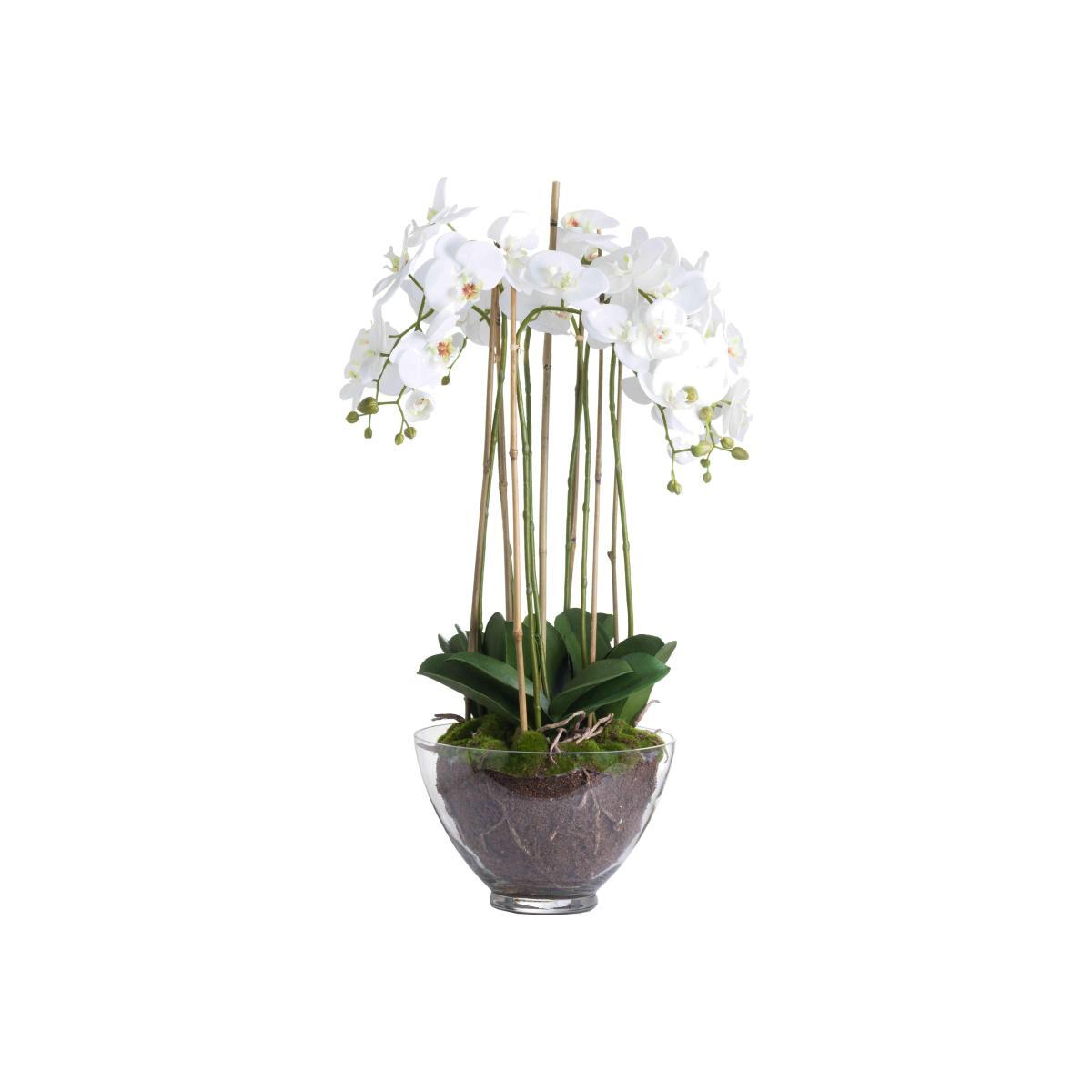 Add some elegance to your interior with these beautiful faux white orchids in a glass pot. With their realistic look and see-through pot, they make a fantastic addition to any dining or console table. Why you'll love it. Sophisticated faux white orchids in a glass pot. Realistic design that adds a warm touch to any space. Stunning see-through glass pot. The perfect centrepiece to any table. What you need to know. Made from glass and plastic. Dimensions. Height: 88 cm (35 in). Width: 70 cm (38 in).