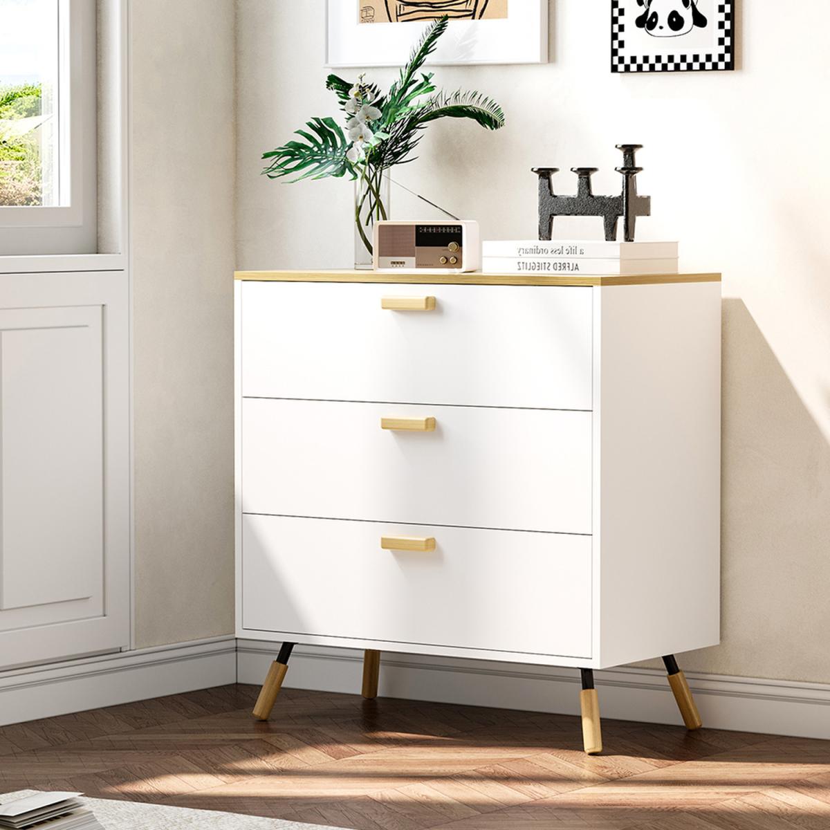 Designed to enhance storage in any room of your home, this chest of drawers offers wide and deep drawers with wooden handles for smooth and quiet operation. Whether placed in the living room, bedroom, or dining room, this versatile piece proves to be an invaluable addition. The natural wood-textured tabletop introduces a modern vibe, while the frame creates a clean, minimalist silhouette. Supported by a sturdy structure and four splayed legs, this chest of drawers is built for durability and long-term use.