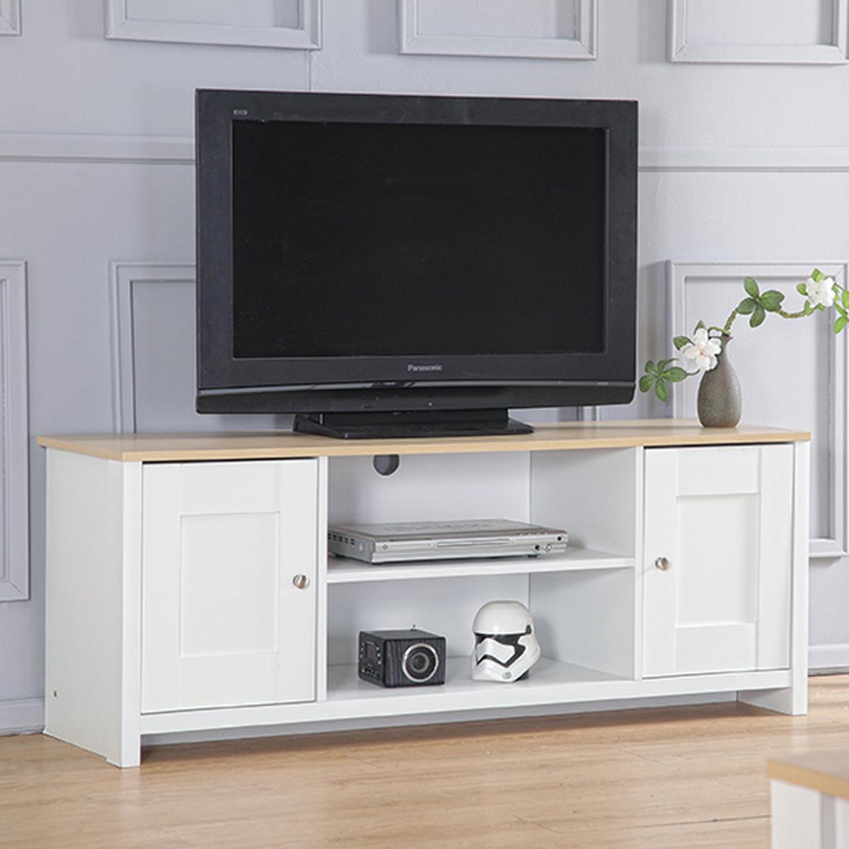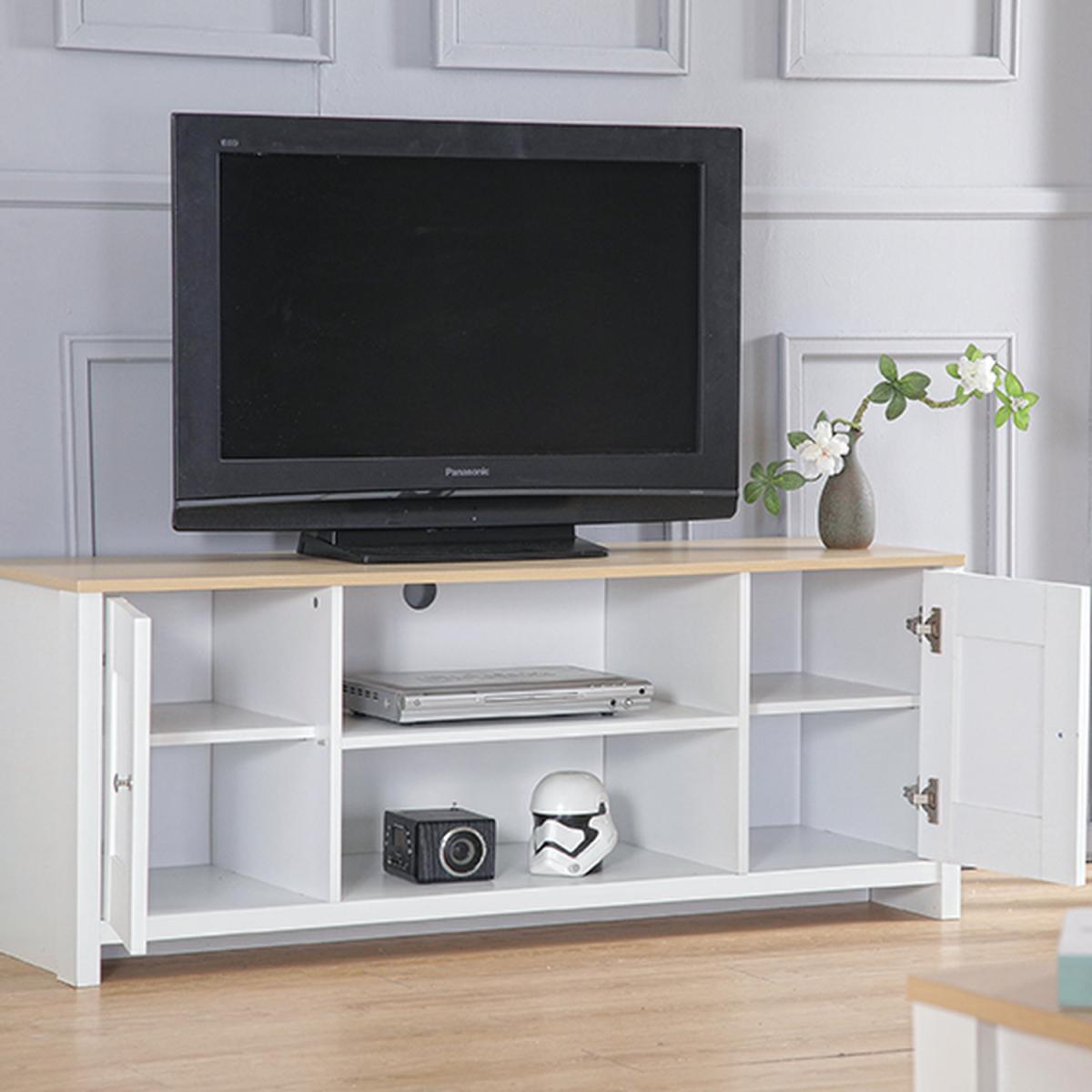 His modern stylish large TV unit is available in a soft grey or white finish with a contrasting oak effect top. The TV unit provides space for your home entertainment equipment, and 2 cupboards for extra storage space. Ideal for a room where understated elegance is the goal.
