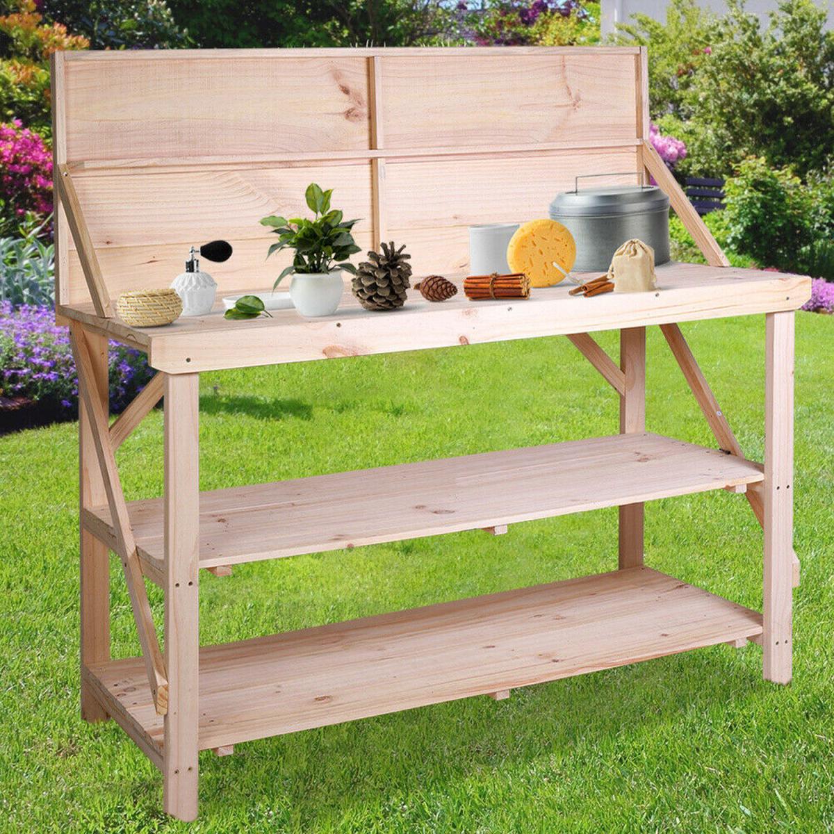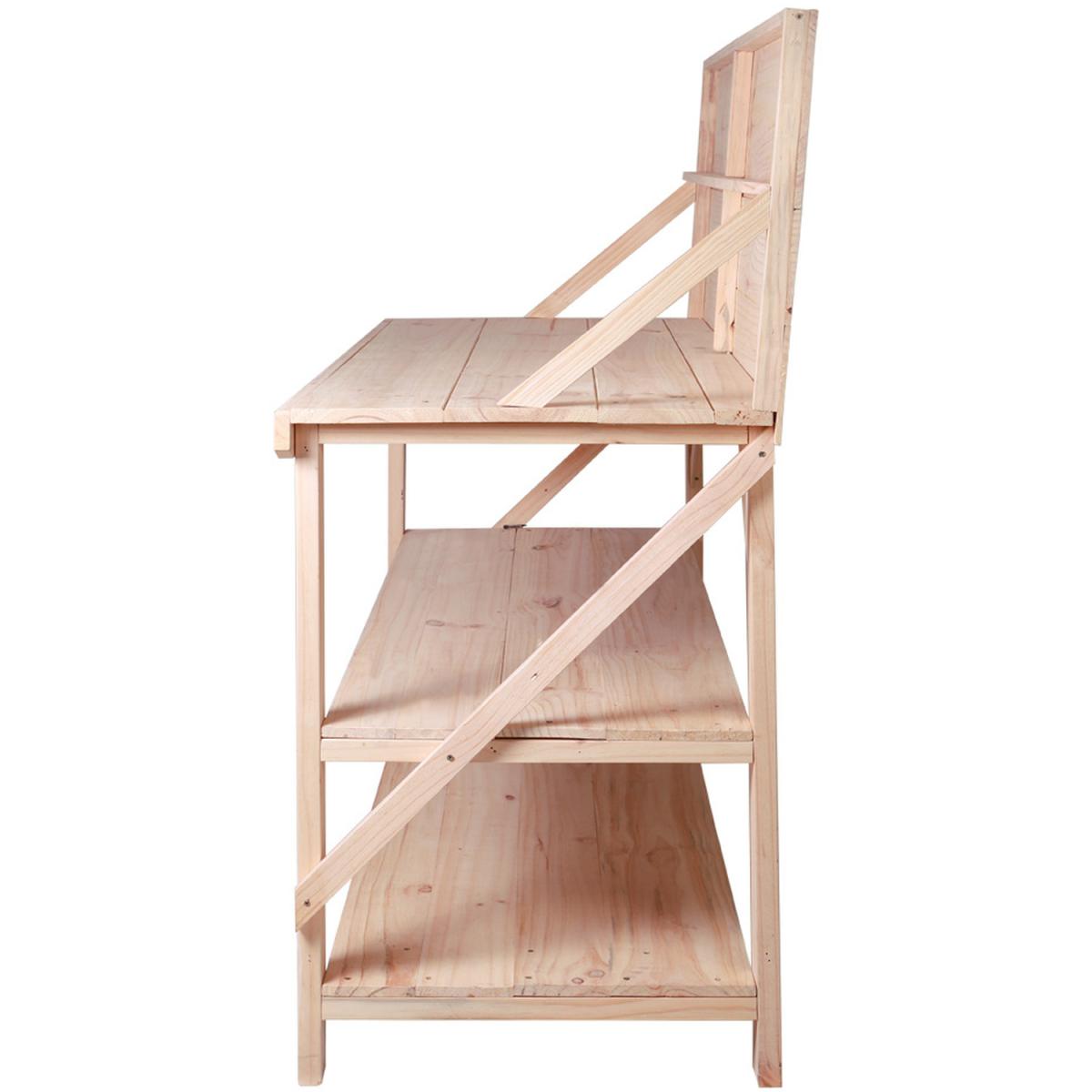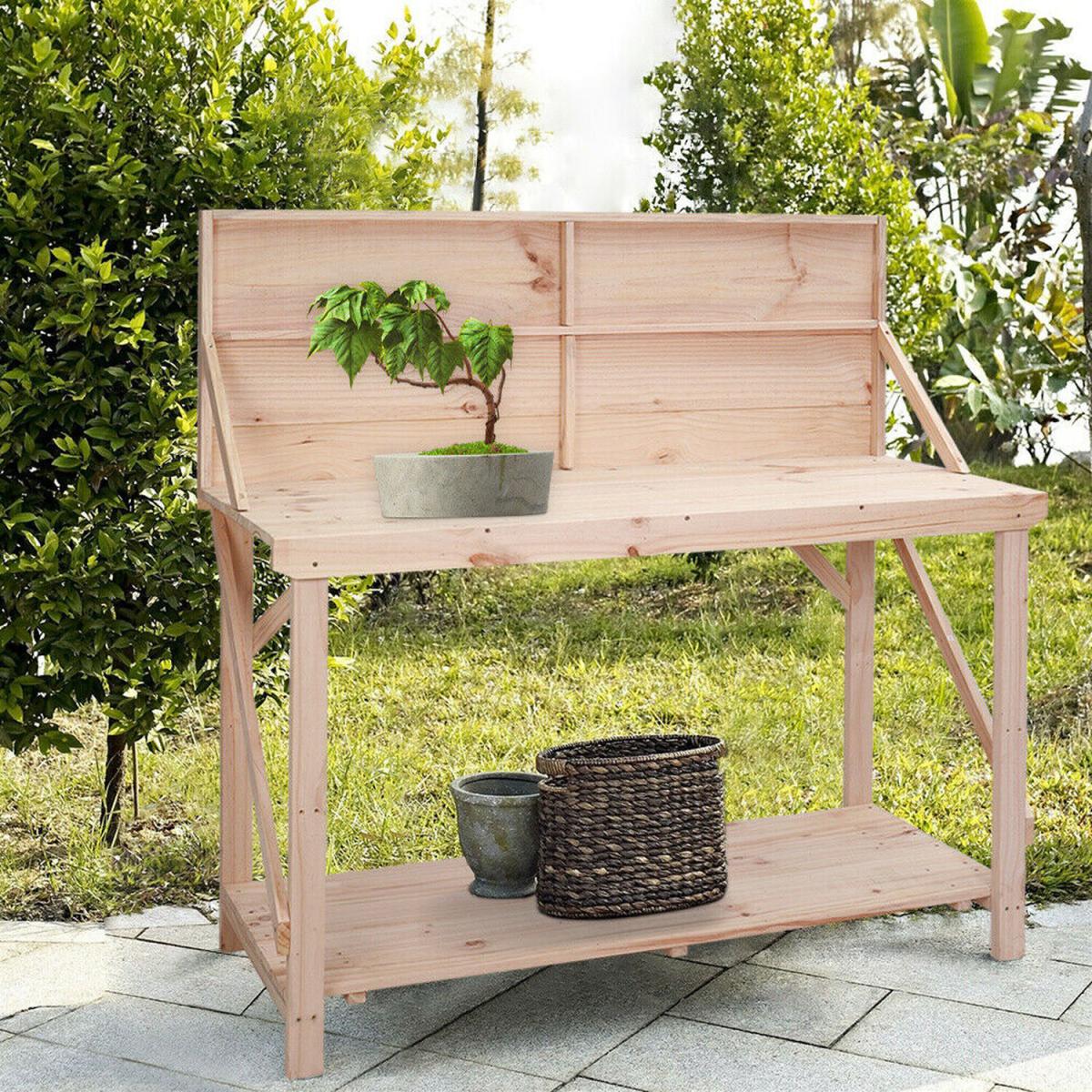 The perfect place to pot plants, trim florals and keep gardening supplies on hand, this potting bench is essential for any green-thumbed goddess. It includes a working surface, two open space below for storage. Crafted from hardwoods, it offers a weather-resistant design that stands up to fading and rain, plus a natural brown finish. Assembly for this product is required.