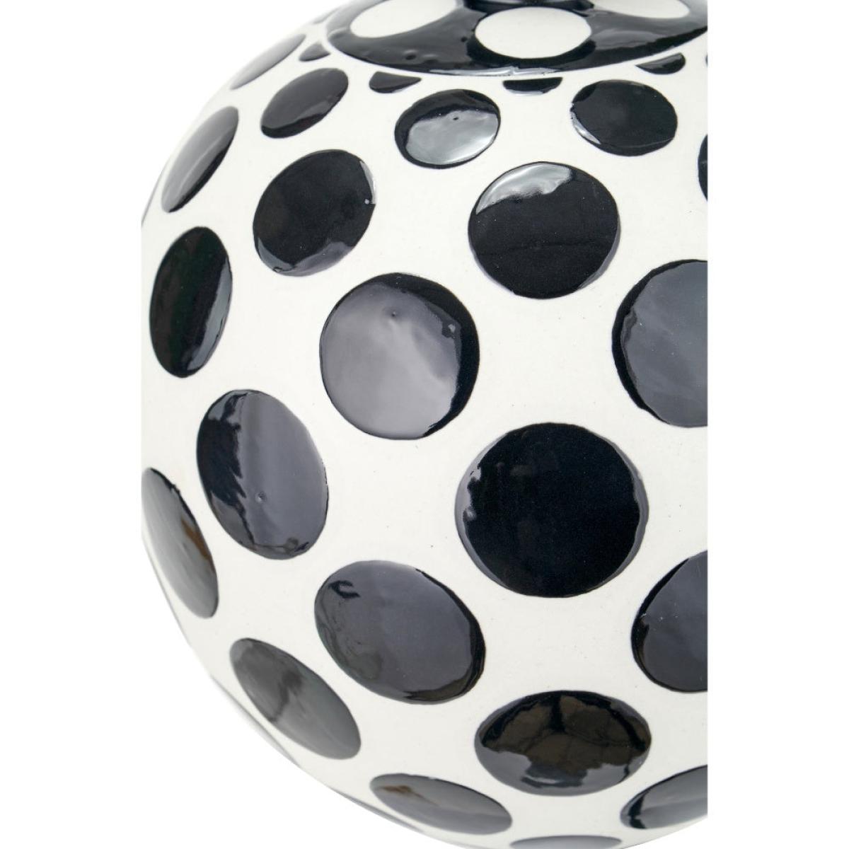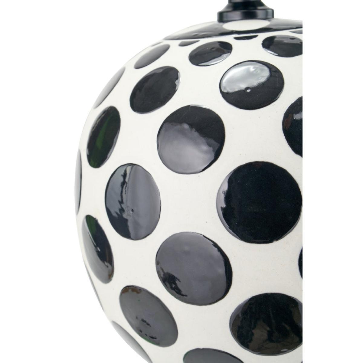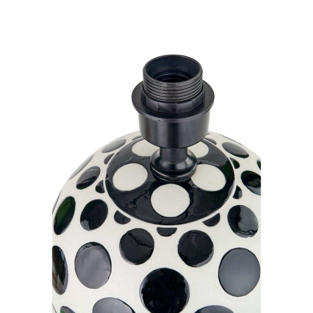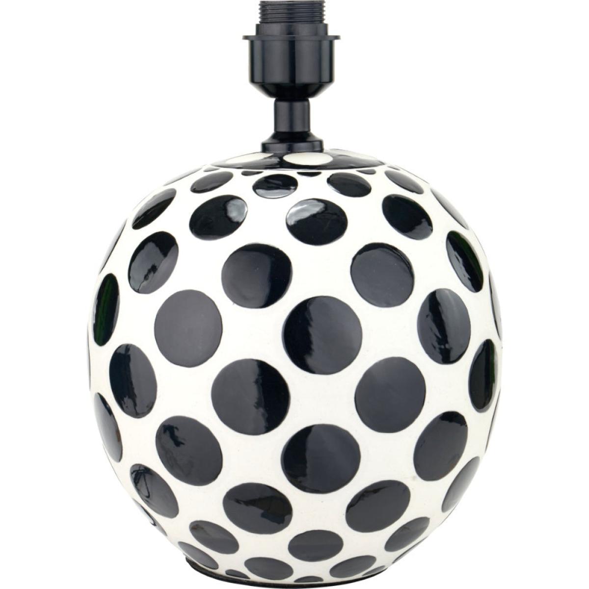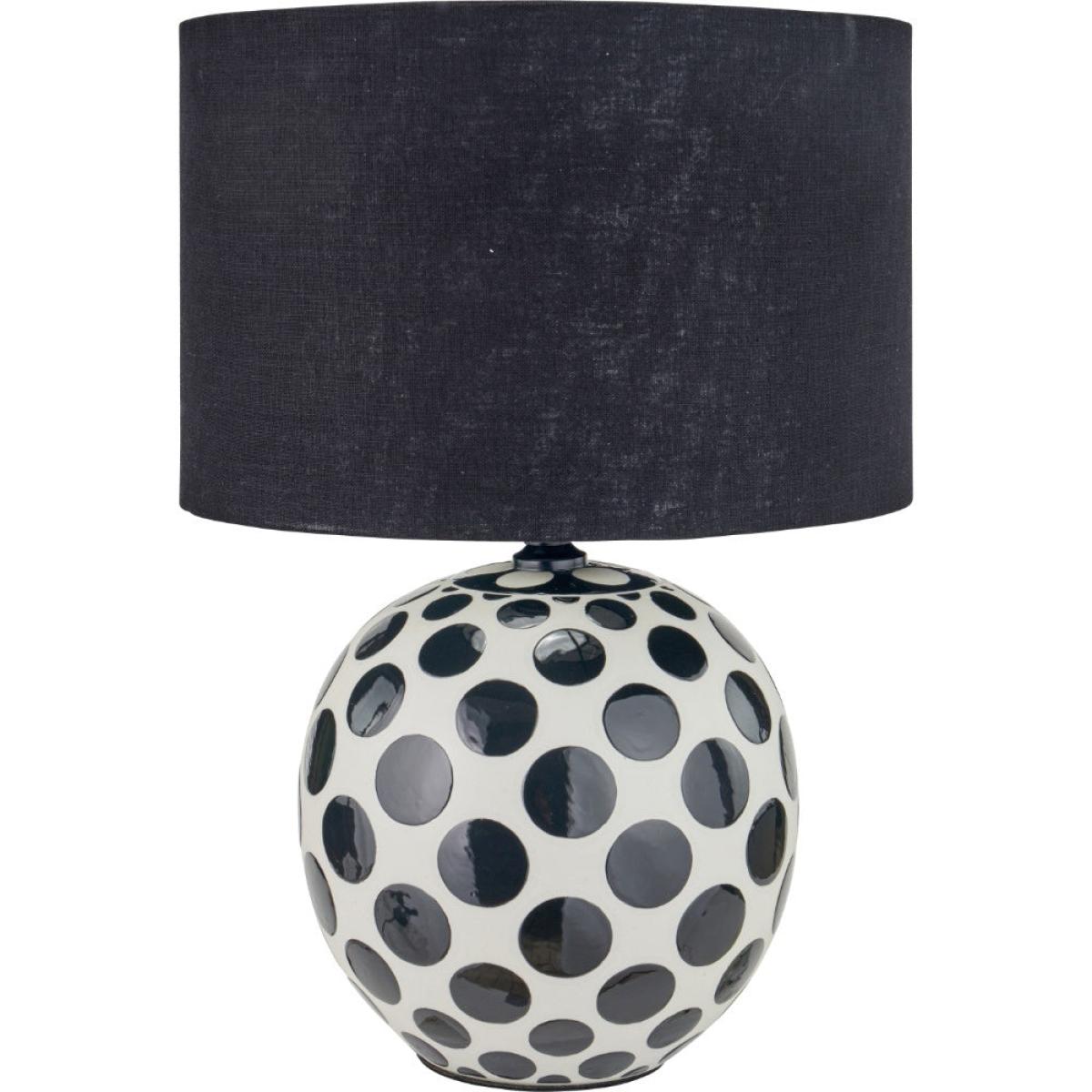 Introducing our stylish Larisa ceramic table lamp base, a true statement piece. The perfectly proportioned sphere shape is adorned with a contemporary monochrome spot design. Teamed with a modern black cylinder linen lamp shade that is self-lined, while the open weave material allows the light to filter through. Shade Dimensions: H23xW35xD3. 5 cm Lamp Base Dimensions: H34xW25xD2. 5 cm Requires 1x 10-12W LED ES27 lightbulb