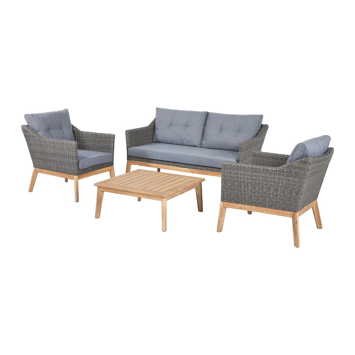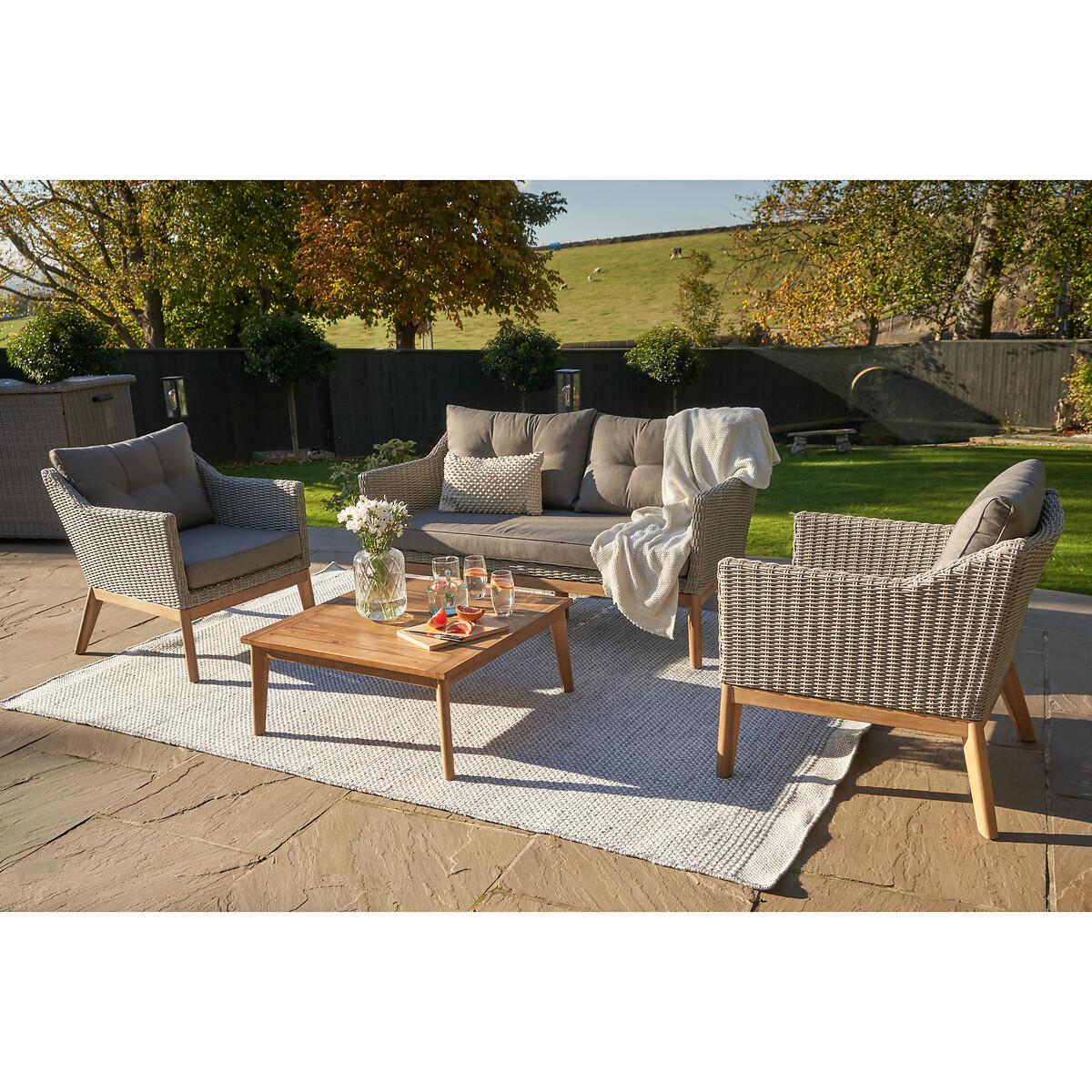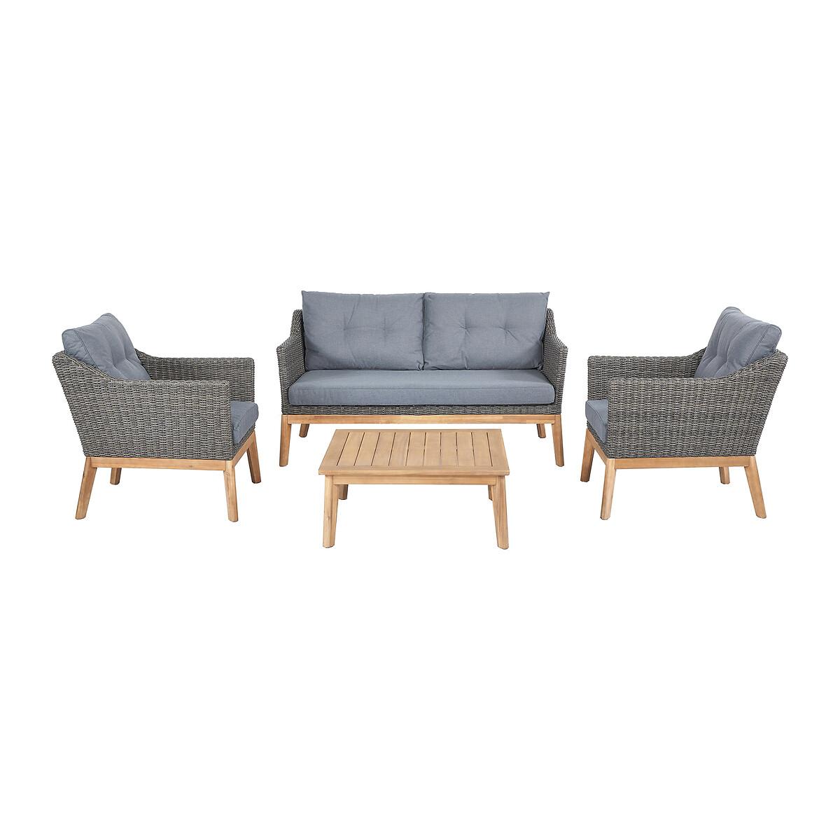 Please note: this product cannot be delivered to all Offshore Islands, Northern Ireland or Republic of Ireland - postcodes starting with; AB, BT, DD, IV, KW1-14, PA21-38, PH, TR17-27 & ALL ROI.The Larissa Lounge Set offers a chic combination of synthetic rattan with quality wood detailing in a stylish Kubu Grey. With a raised seating style, set on tapered legs, and high back cushions, this set gives you a supportive and stylish alternative to a lower lounging style set. The set comprises of a 2 seater sofa, 2x arm chairs and a central coffee table, ideal for relaxed drinking and dining alfresco style. This stunning, outdoor lounge set in neutral tones is crafted from a synthetic half round rattan weave ensuring a modern look, and durable weather resistant finish. This outdoor dining set also features an acacia wood table and matching chair legs, which ensures it's high-quality and robustness. Acacia wood is an environmentally friendly choice as it is a quick-growing wood, tough and long-lasting, making it an excellent choice for outdoor furniture. Each comfortable cushion with stylish grey hue polyester cover, is season proof and fire retardant, ensuring that all details of this set are of the highest quality. We suggest using a cover to protect your set while not in use to maintain its quality. Product Dimensions: Chair: 82x70x79cm. Sofa: 80x154x35cm. Table: 80x80x35cm Parcel 1 Packaged Dimensions: 85cmx85cmx10cm Weight: 10kg Parcel 2 Packaged Dimensions: 159cmx89cmx53cm Weight: 30kg Parcel 3 Packaged Dimensions: 89cmx74cmx53cm Weight: 20kg Parcel 4 Packaged Dimensions: 89cmx74cmx53cm Weight: 20kg. Composition:Polyester 40%, PU wicker 20%, Acacia wood 20%, Aluminium 20%Please note this item is a large piece of furniture that will require some self assembly. Please ensure you have space to receive delivery. This product will be dispatched by one of our trusted suppliers. You’ll be contacted by their selected courier about your delivery. PACIF01