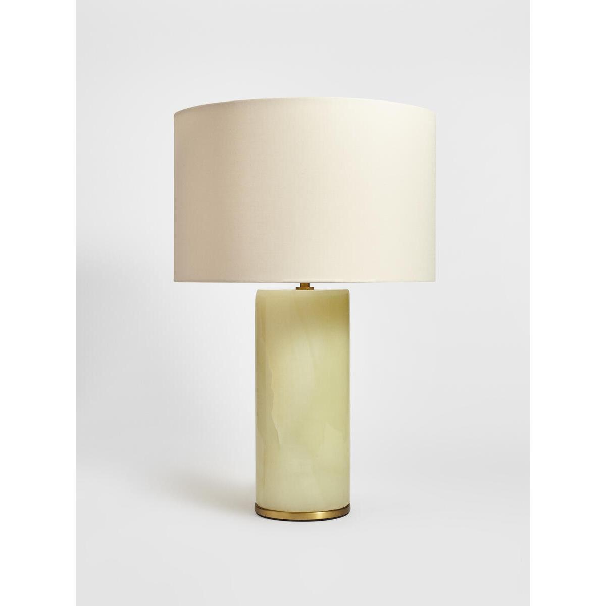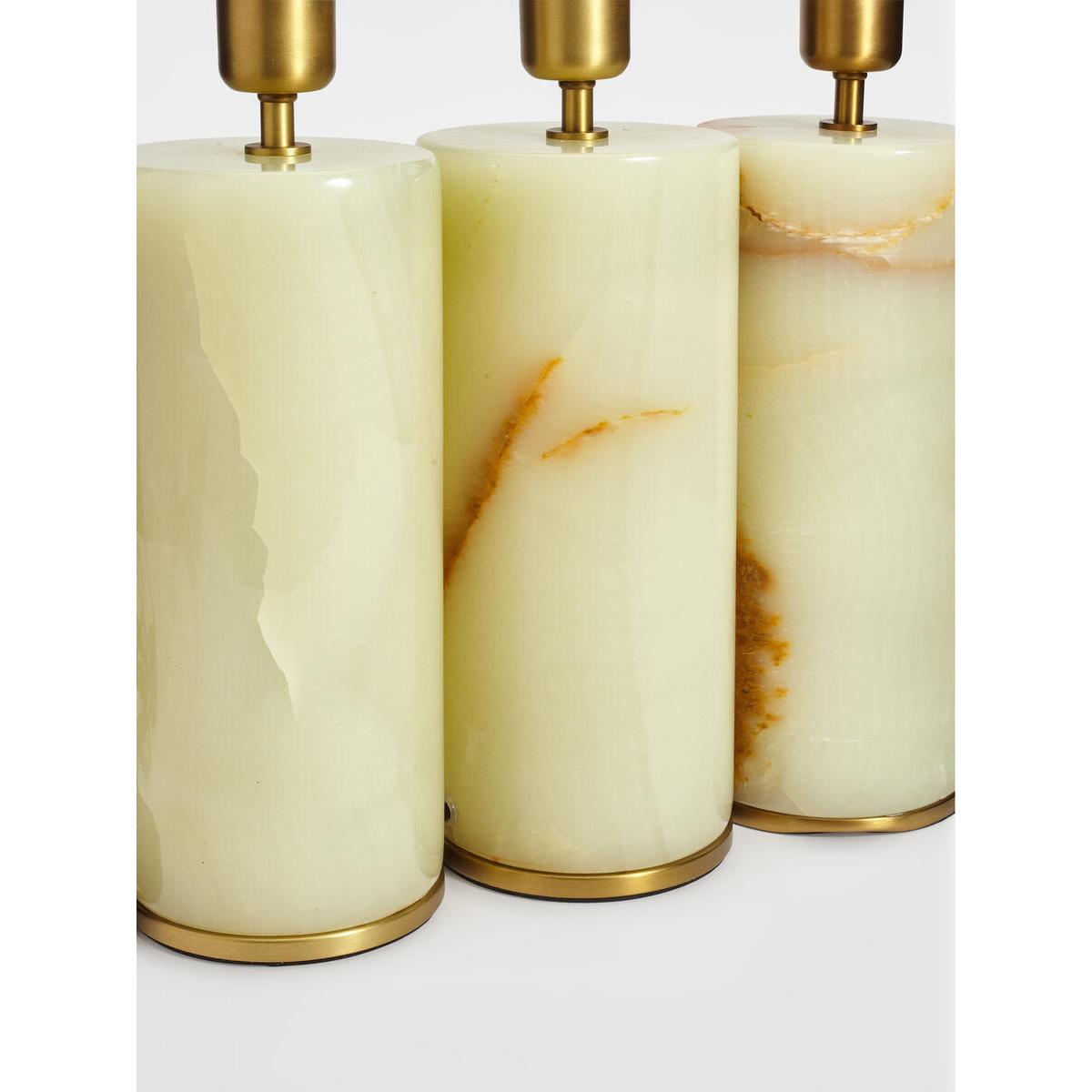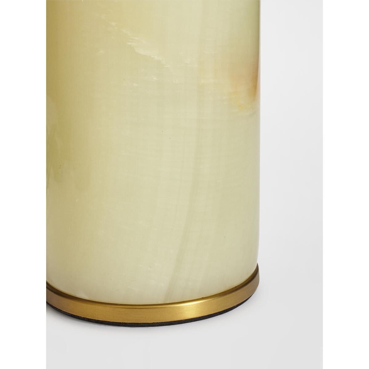 Crafted from oynx, which has natural colour variations in the stone, the Larissa table lamp is inspired by the textures seen throughout 180 House. Topped with a cream linen shade, use this lamp to create warmth in a hallway, bedroom or living area. Table lamp with cylindrical onyx base Brass detail Dimmable Cream linen shade included Requires one x E27/ max 60W bulb Inspired by 180 House