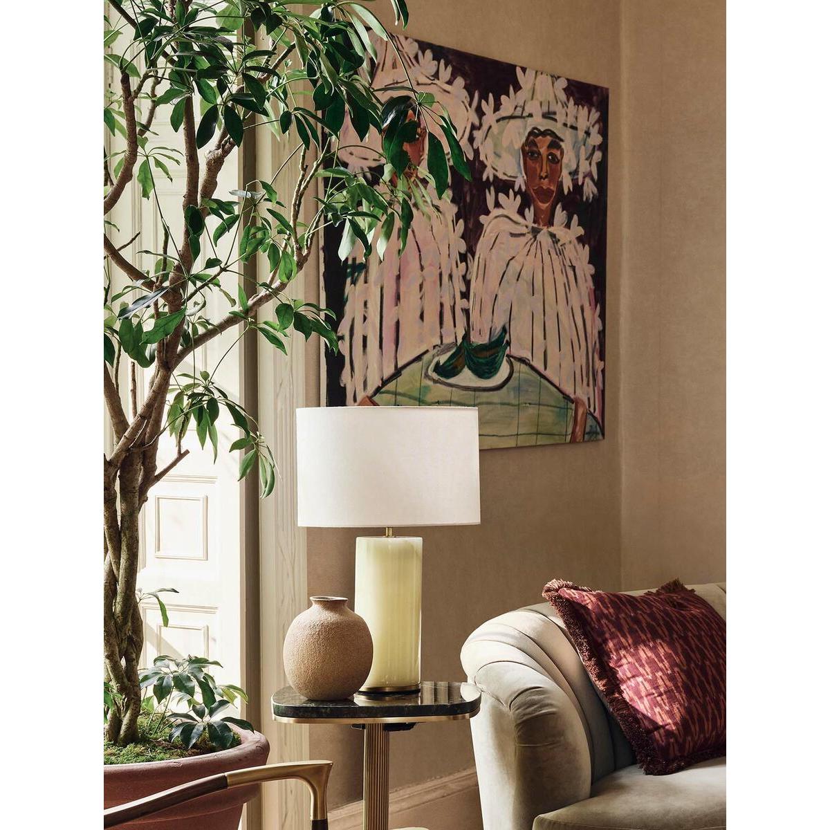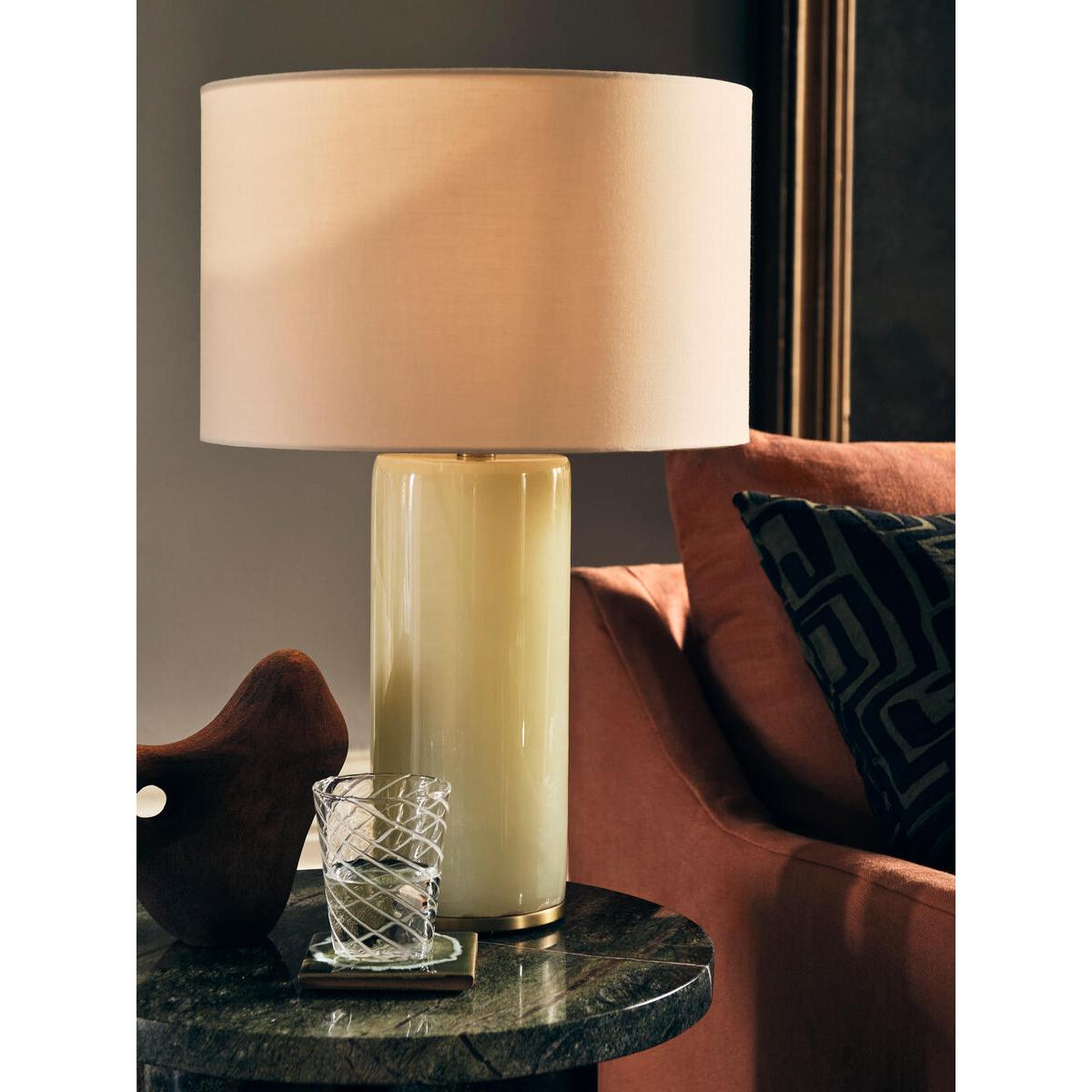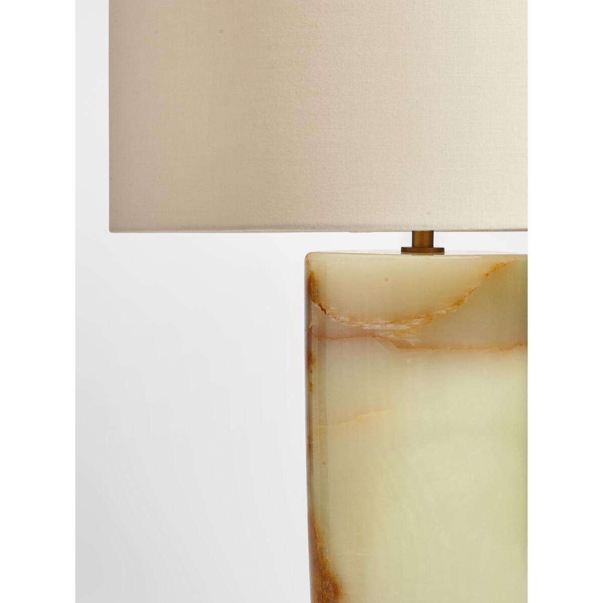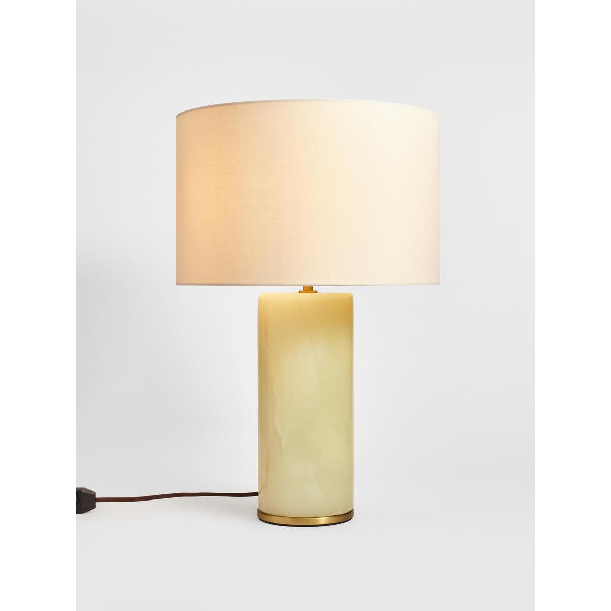 Crafted from oynx, which has natural colour variations in the stone, the Larissa table lamp is inspired by the textures seen throughout 180 House. Topped with a cream linen shade, use this lamp to create warmth in a hallway, bedroom or living area. Table lamp with cylindrical onyx base Brass detail Dimmable Cream linen shade included Requires one x E27/ max 60W bulb Inspired by 180 House