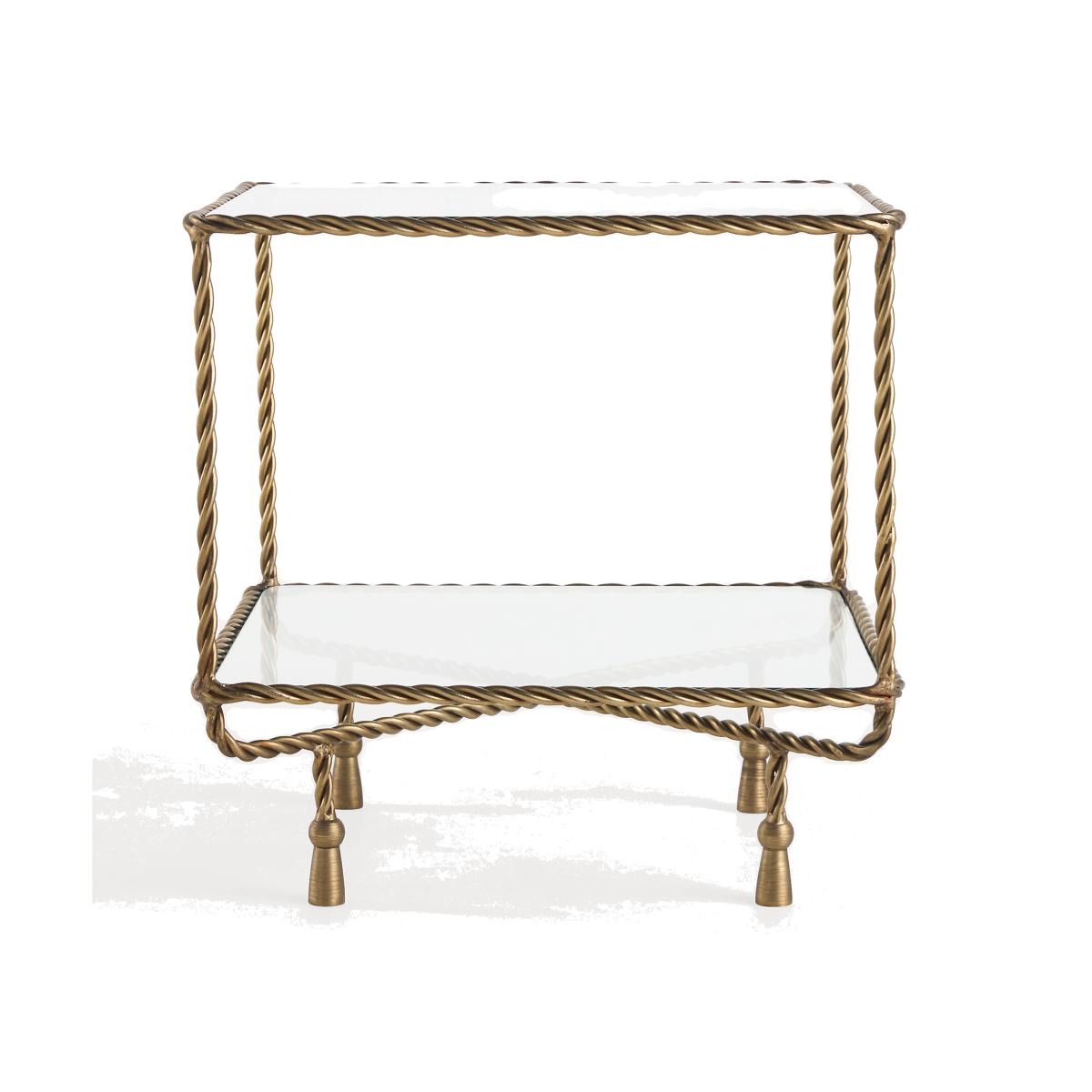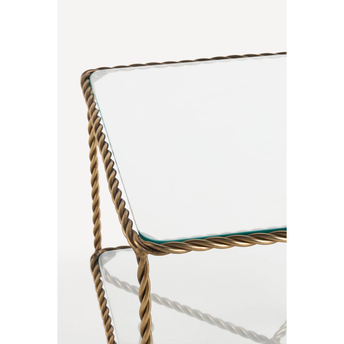 Complete with an elegant antique brass frame, this glass side table adds a polished touch to modern spaces. * Glass side with iron frame and antique brass finish * Wipe clean with soft cloth. Avoid using chemical cleaners * This piece is intended for indoor use * No assembly required * Imported