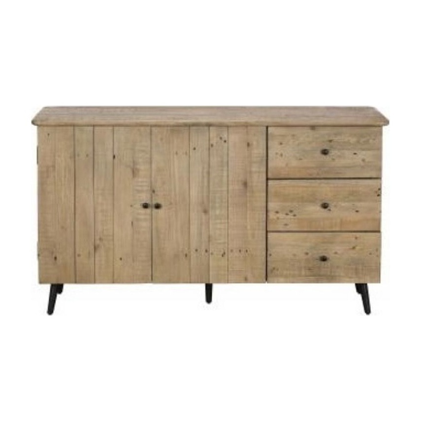 I love this sideboard for its rustic, reclaimed wood finish, which adds warmth and texture to a variety of interiors. It works particularly well in both modern farmhouse and eclectic spaces where a natural, handcrafted feel is desired. Its wide surface makes it perfect for displaying decorative items, while the storage drawers and cupboards keep clutter hidden, promoting practicality. Styling tips include pairing it with soft textiles, vintage accessories, or greenery to enhance its organic appeal. It’s also versatile enough to sit in the dining room for crockery storage or in a living space as an understated media unit. Keep accessories minimal on top to let the wood’s character shine through, and consider mixing metals or matte finishes for a curated look.