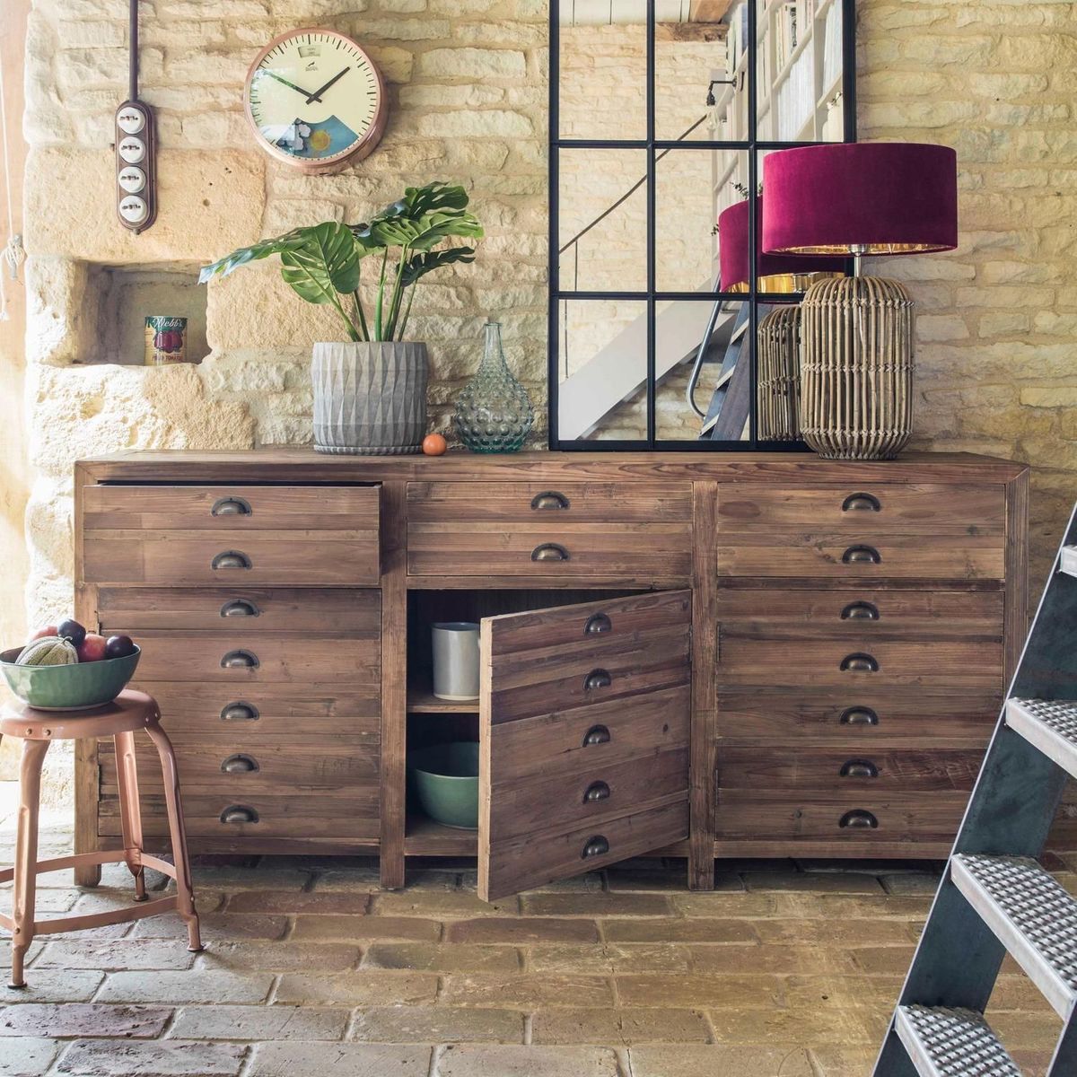 Add some factory chic to your kitchen with our deceptive three door, three drawer Larkin pine sideboard. Made in solid pine it has a distinct draftsman chest design with a host of half moon brass handles. This is clever, functional storage at its most stylish. H90. 5 x W200. 5 x D50. 5cm. Constructed from recycled pine. Brass handles. Features three drawers and three cupboards.