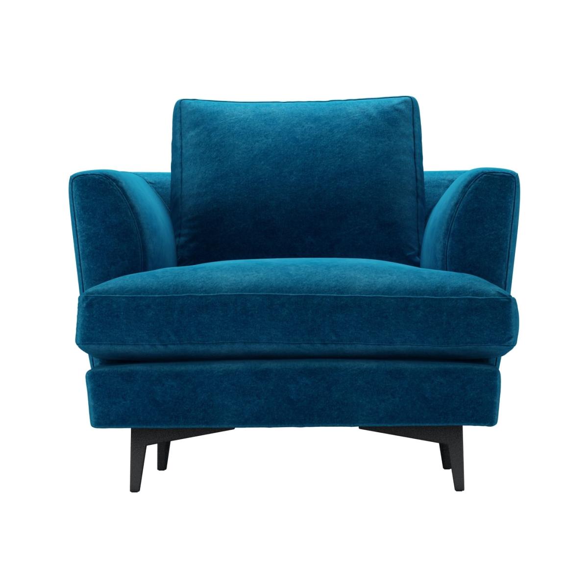 I love this armchair for its striking colour and plush texture, which instantly adds a touch of luxury to any space. The Scuba Smart Velvet gives it a contemporary yet timeless appeal, making it versatile for both modern or eclectic interiors. It works especially well as a statement piece in a living room or a cosy reading nook. For styling tips, pair it with neutral tones to let the blue pop or mix with complementary colours like warm mustard or soft pinks. Practical touches include keeping accessories minimal to focus on the fabric’s richness, and using a textured or patterned cushion to add depth without overwhelming its elegant silhouette.