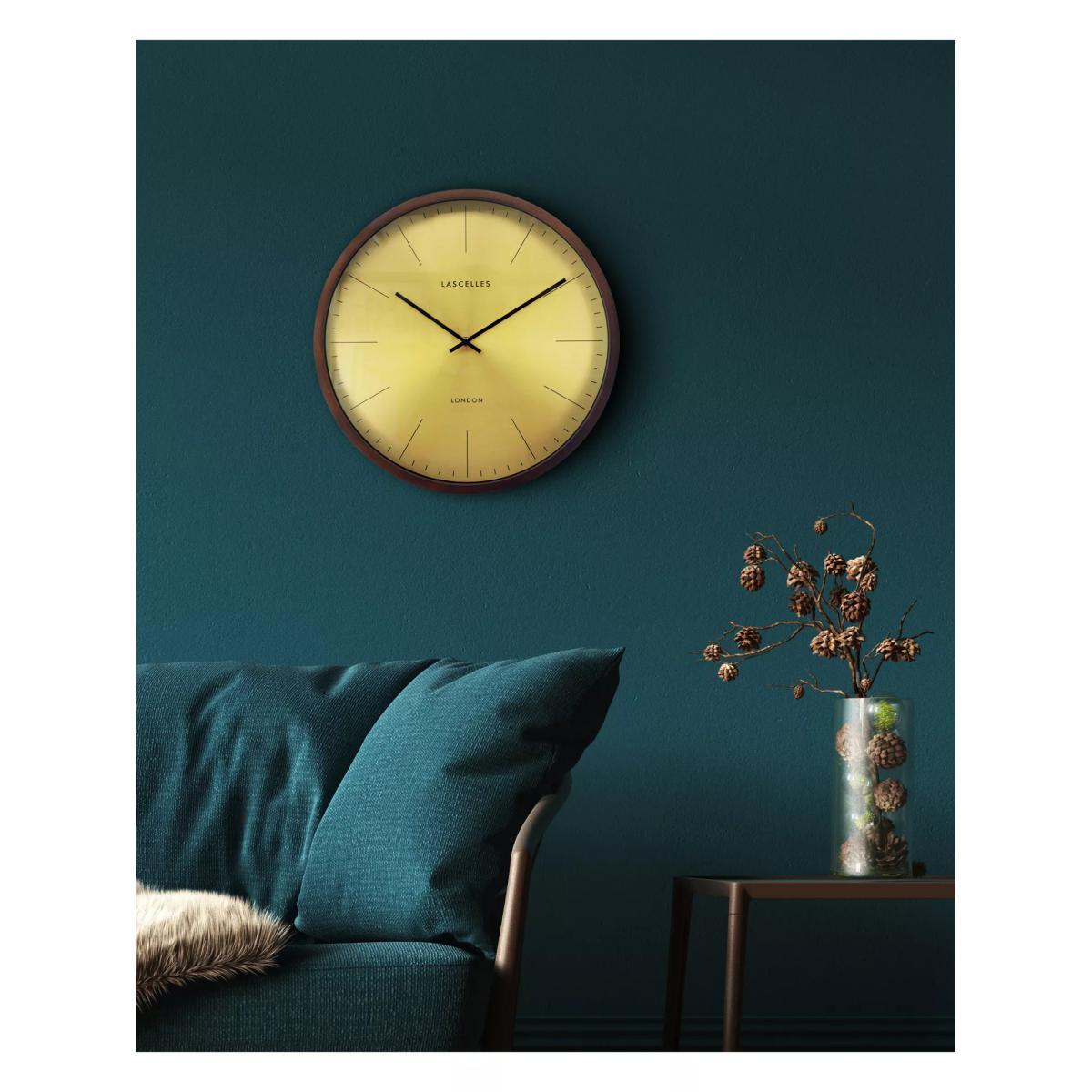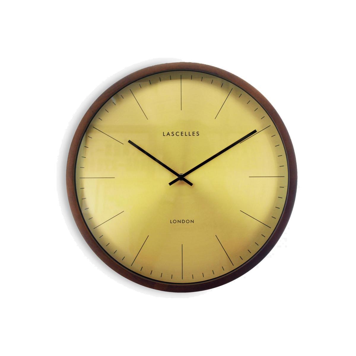 A dark wood casing and gold metal dial bring warm tones to this contemporary Lascelles wall clock. It's finished with minimalist hour markers and baton clock hands.