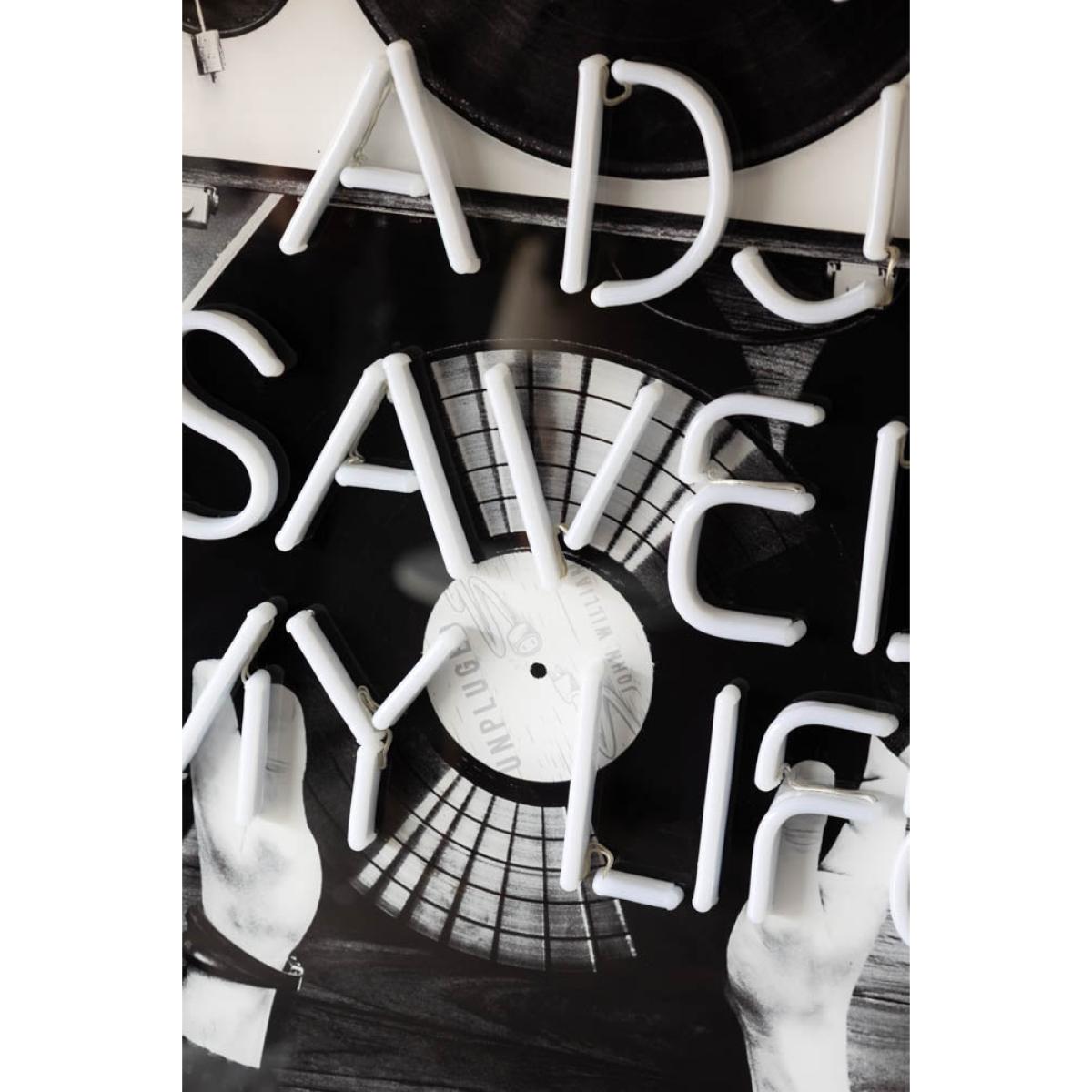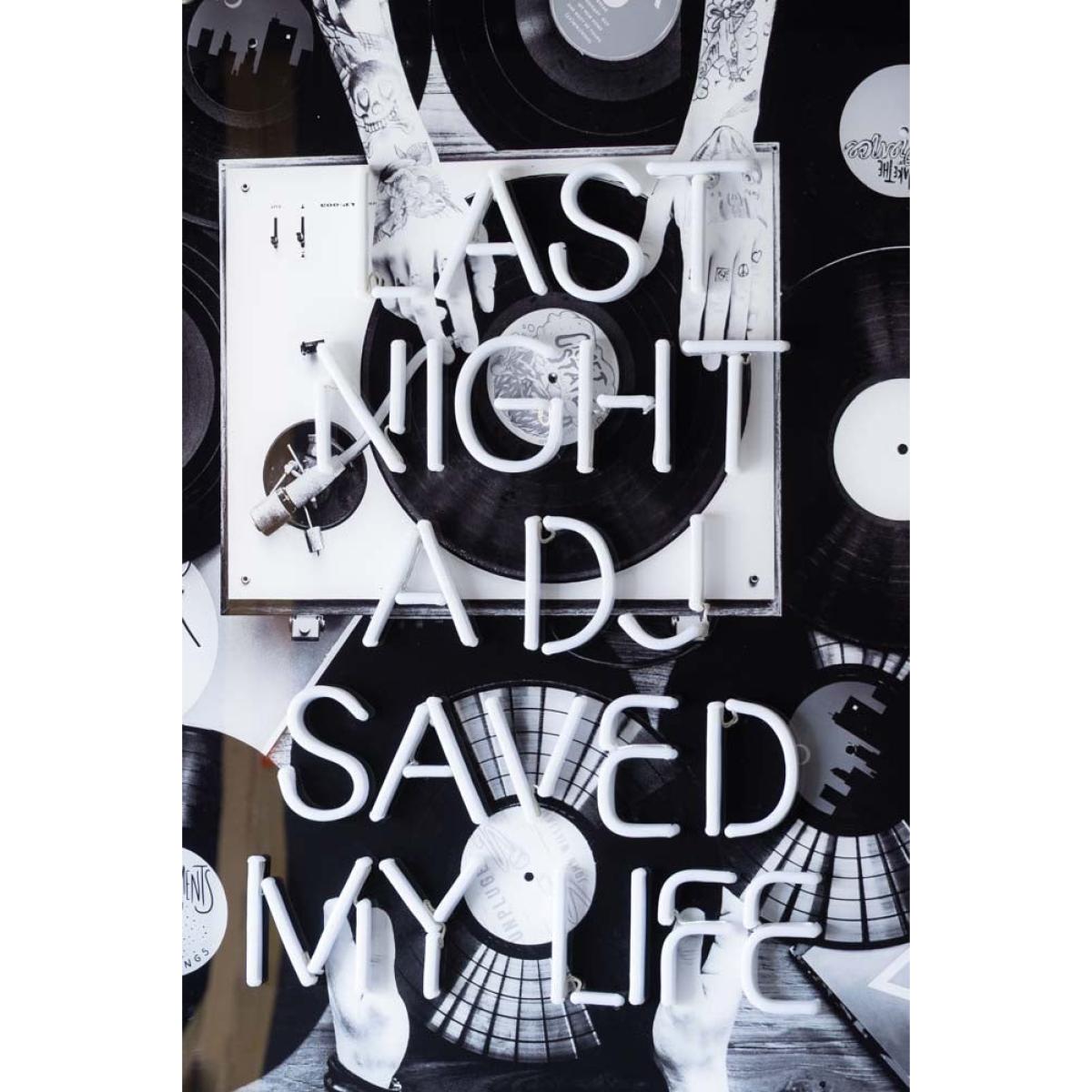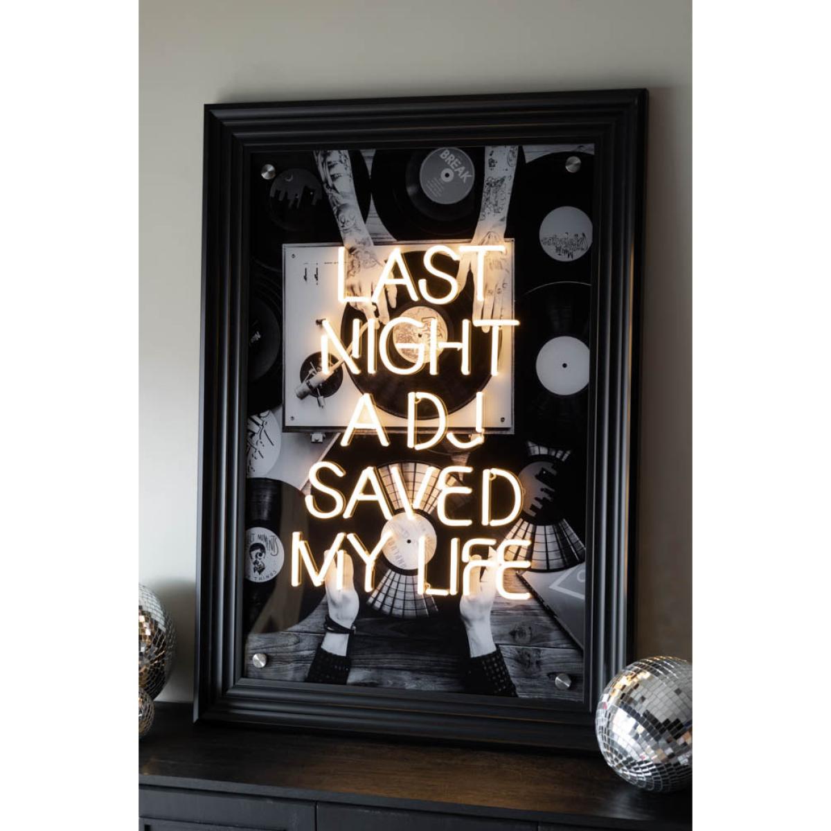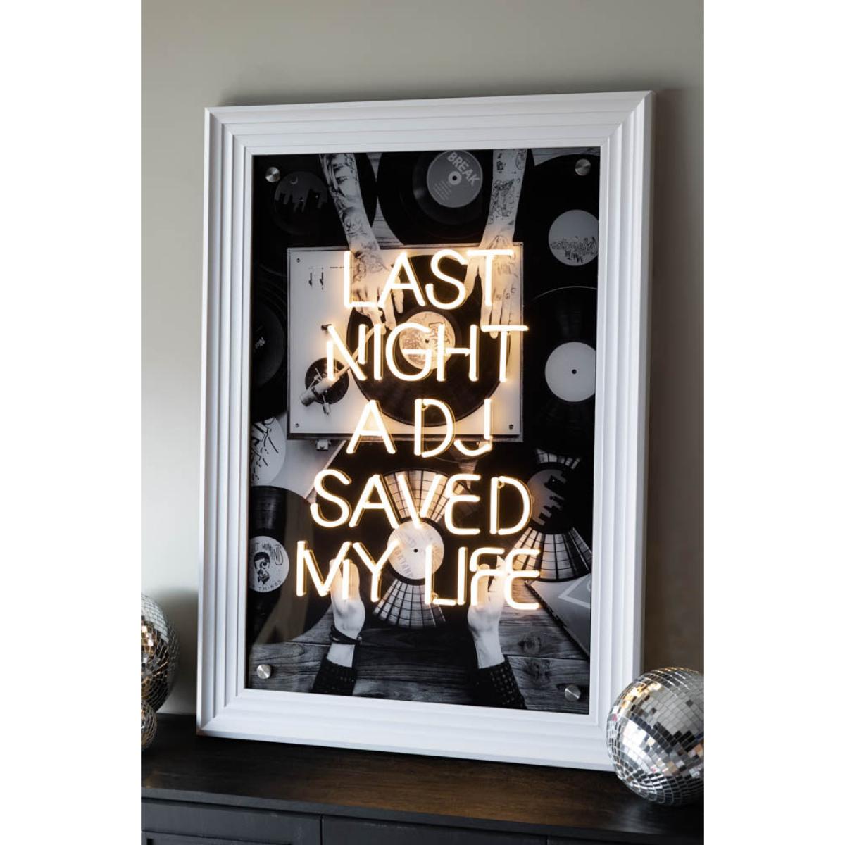 Turn up the vibes and light up your space with this banger of a wall light. The Last Night A DJ Saved My Life Framed Neon Wall Light is an absolute party starter. With a black-and-white retro DJ vinyl setup as the backdrop, and those iconic lyrics glowing in punchy LED neon, this neon wall lighting brings all the throwback energy with a modern twist. Available in a sleek black or crisp white frame, these wall lights for living rooms are made to steal the spotlight in living rooms, studios, or wherever you want to inject a little dancefloor magic. This framed wall art is fun and nostalgic, and it’s basically an invitation to press play and feel good. - Last Night A DJ Saved My Life... Framed Neon Wall Light - Measures: W60cm x H90cm - Materials: Acrylic - Comes with an adaptor plug, wall fixings and remote control