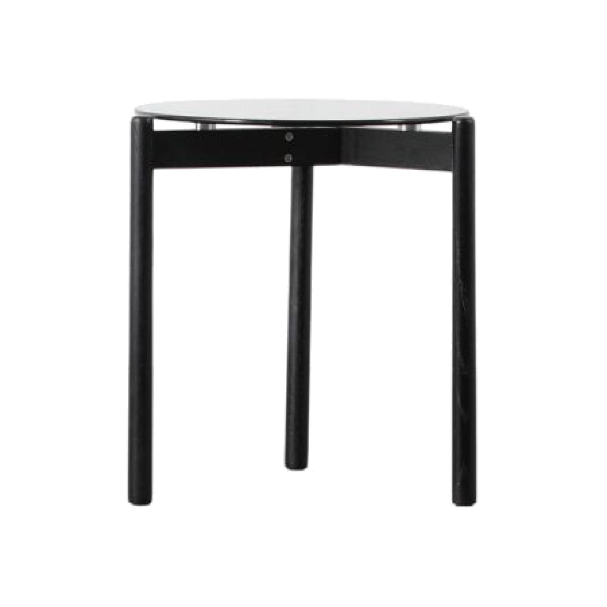 Lovely black side table offering a stunning contemporary style. It features a beautifully designed solid oak base with a black finish combined with a tempered smoked glass top. Material: Tempered Glass. Colour/Finish: Black.