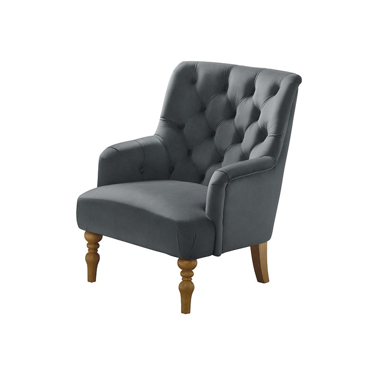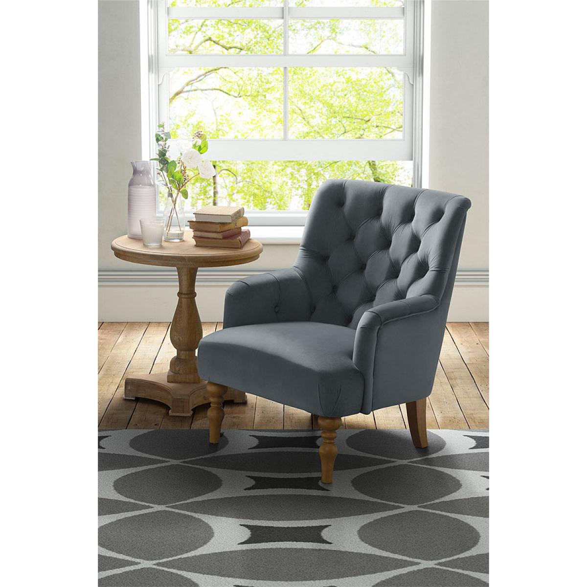 I’m a fan of this grey armchair for its clean lines and classic button-back detail, which sit neatly in both modern Scandi schemes and more traditional settings. The muted tone makes it easy to layer with soft throws or a patterned cushion, while its turned-wood legs add a touch of warmth. For styling, position it beside a slim floor lamp and a small side table to create a cosy reading nook, or use two either side of your sofa to frame your living space.