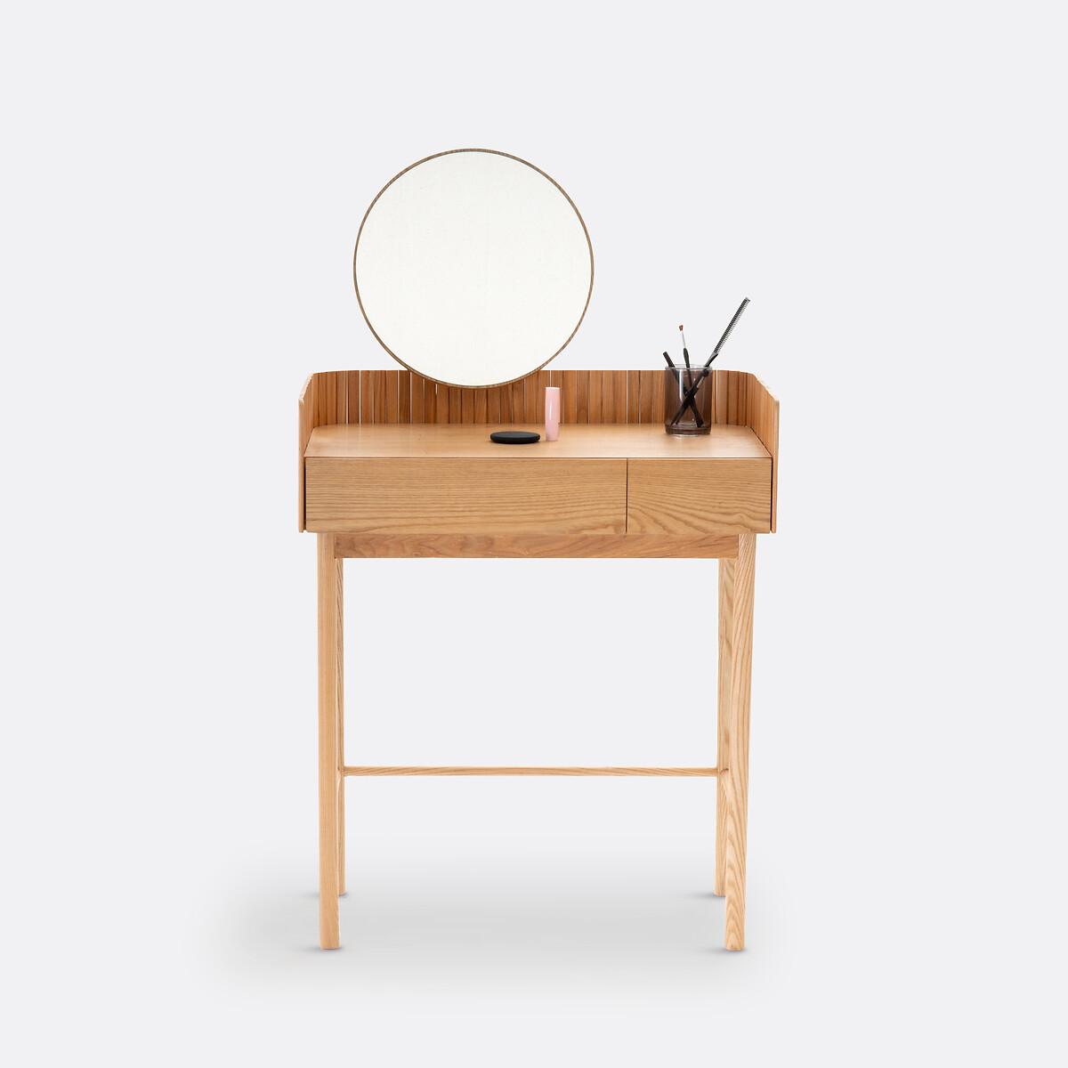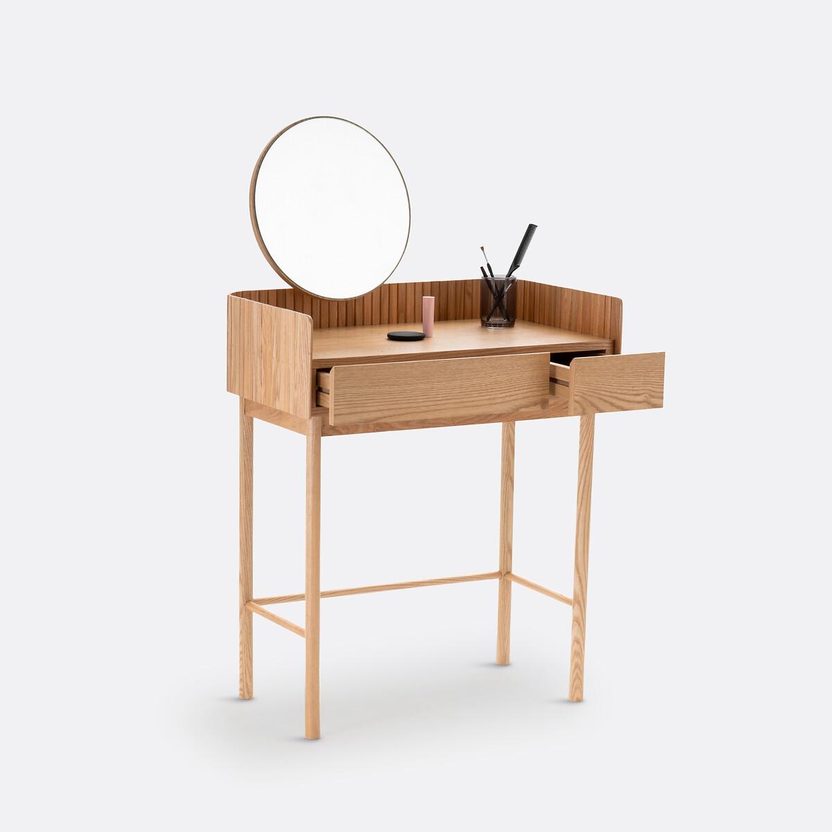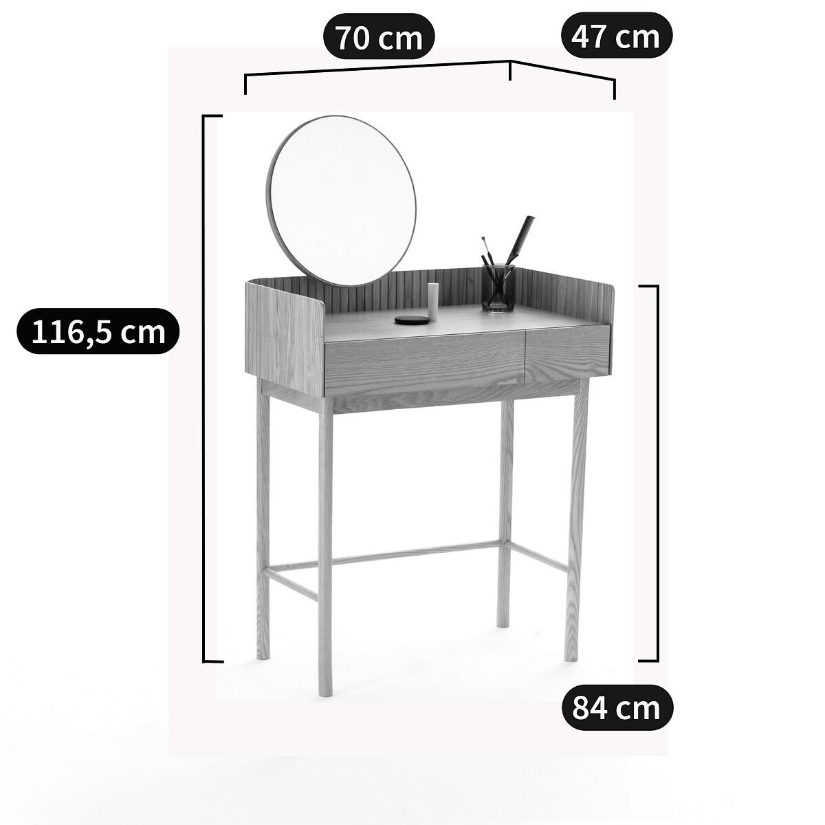 The Elixia slatted ash dressing table perfectly combines functionality, curves and solid ash. Product Details • 2 drawers • In solid ash and ash veneer MDF, nitrocellulose varnish finish. • Legs in solid birch with ash veneer, nitrocellulose varnish finishDimensions. Overall • Width: 70cm • Height: 84cm (without mirror) / 116.5cm (with mirror) • Depth: 47cm • Weight: 18.5kg Mirror • Diameter: 38cm. Top: • Width: 68.4cm • Height: 75.5cm • Depth: 40.3cm. Interior Dimensions • Large drawer:L40.8 x D27 x H4.7cm • Small drawer: L14.7 x D27 x H4.7cmDelivery:. Sold pre-assembled. Available for home delivery. Note! Please check that all access points are large enough to accommodate your delivery (doors, stairs, lifts). • WOOD FROM SUSTAINABLY MANAGED FORESTS. FSC® certified wood comes from forests that are environmentally, socially and economically well managed. Dimensions and weight of package:• L82 x H52 x D37.5cm. • 21.5kg.