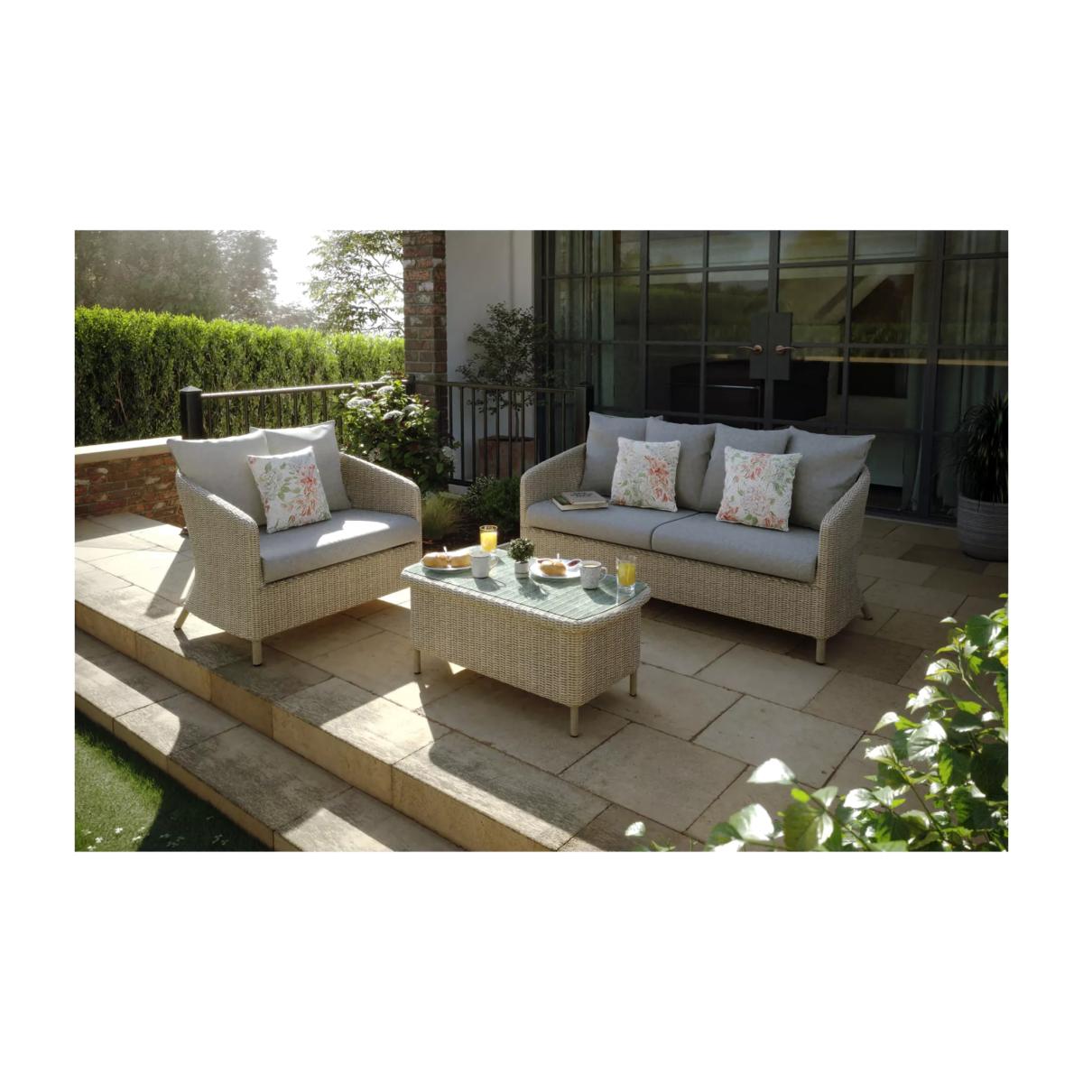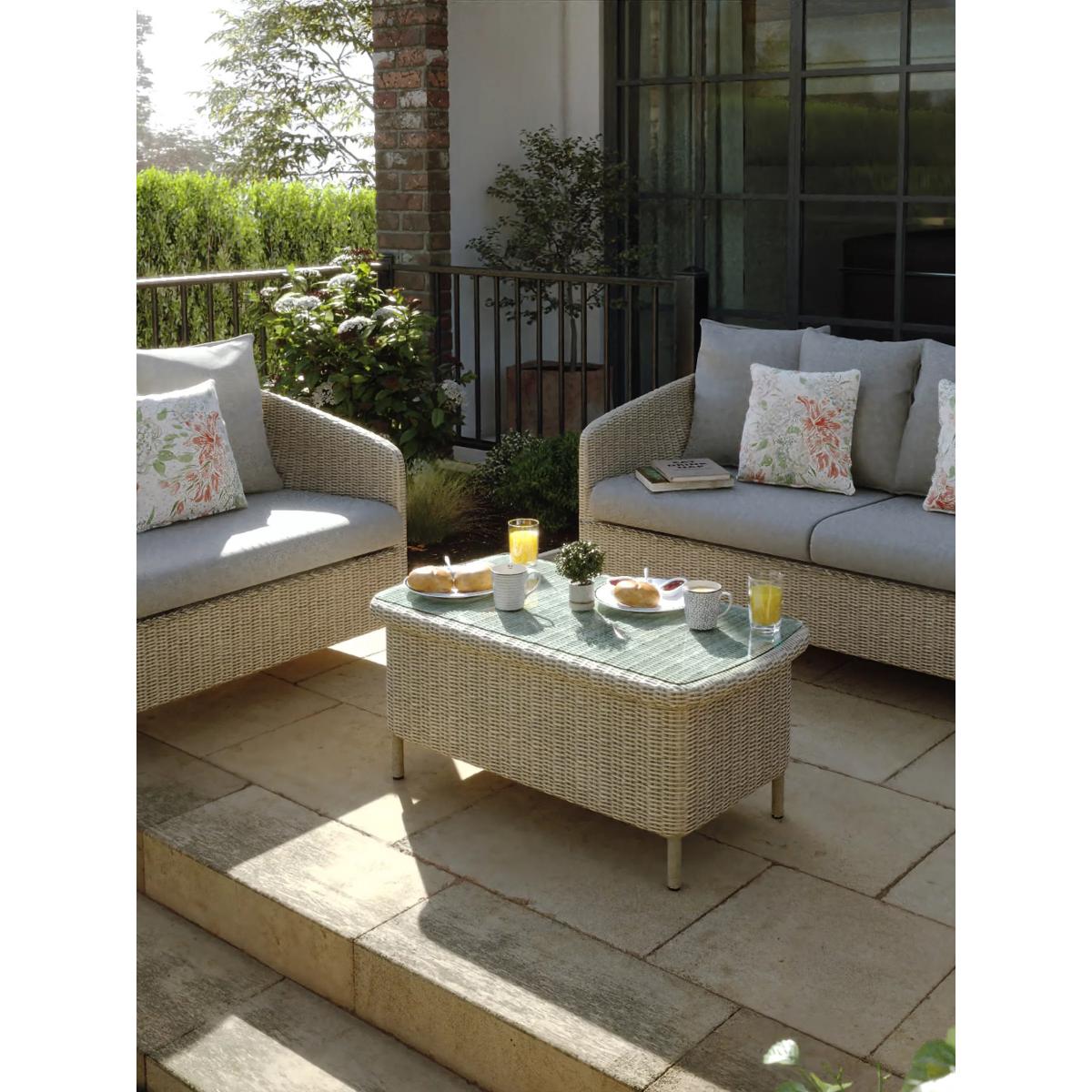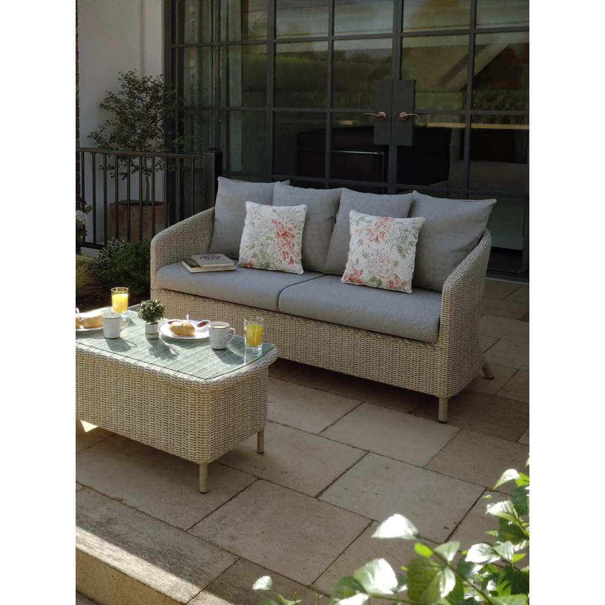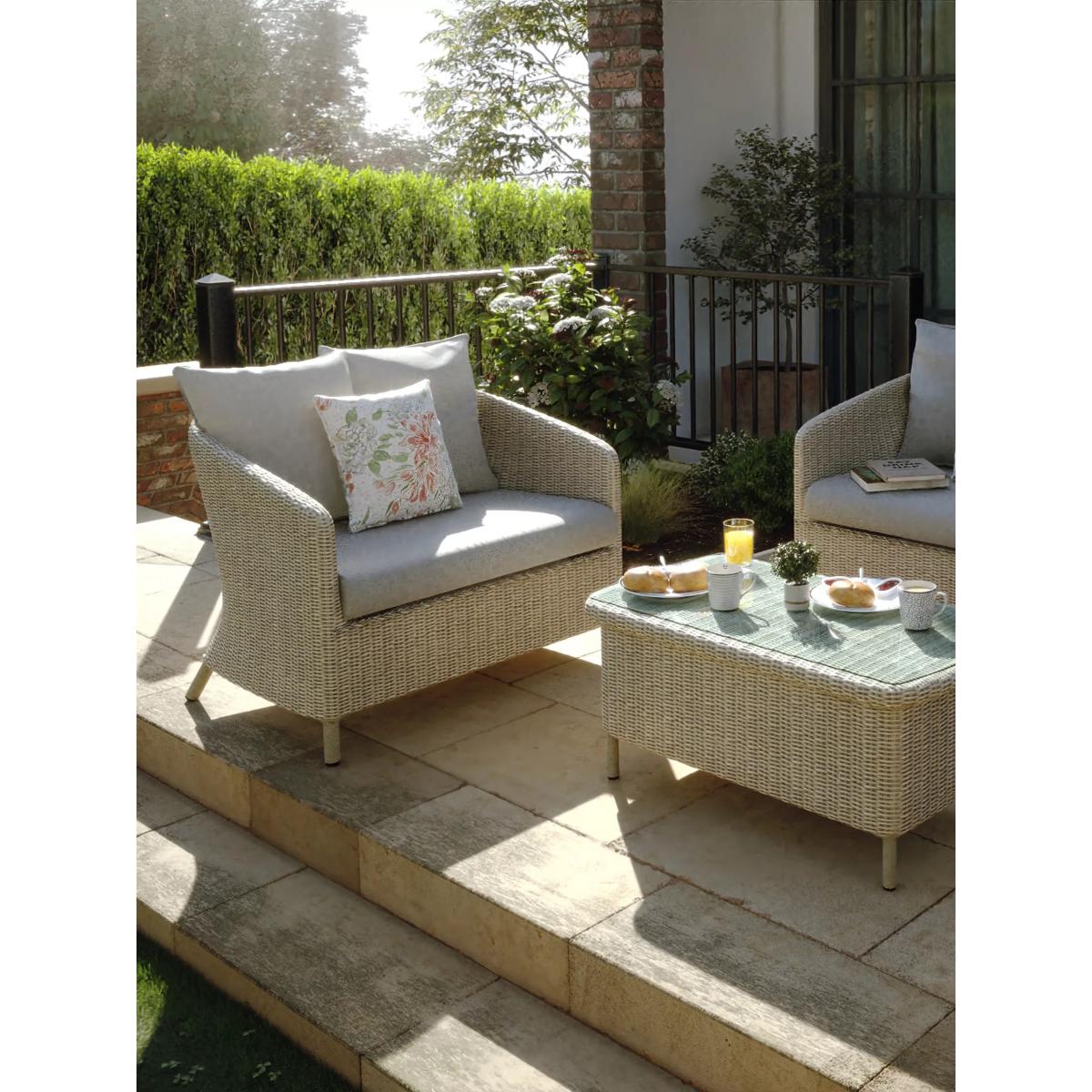 Relax and unwind in style with the Laura Ashley Arley outdoor rattan set. This range offers a chic look with its classic rattan weave on durable powder-coated aluminium frames, combined with sumptuous deep-seated cushioning in sophisticated Laura Ashley outdoor fabrics. This set includes an Arley snuggler chair with a base cushion and two large back scatter cushions, an Arley sofa with base cushions and four large back scatter cushions, and an Arley rectangular glass top coffee table. The cushions are in the Saunton Dove Grey outdoor fabric and three additional 40cm outdoor cushions are included in Laura Ashley's floral Lillith pattern. The cushions should be stored away when not in use. Key features: Arley snuggler chair with base cushion and two large back scatter cushions Arley sofa with base cushions and four large back scatter cushions Arley rectangular glass top coffee table Three Laura Ashley Lillith 40cm outdoor scatter cushions Reversible UK-manufactured cushions with quality foam bases and fibre-filled scatter cushions 4mm round all-weather synthetic weave furniture UV, weather-resistant and chlorine-resistant outdoor fabrics Durable powder-coated rust-free aluminium frames Low maintenance set and no assembly required 5-year guarantee on the frames, 1-year guarantee on the cushions