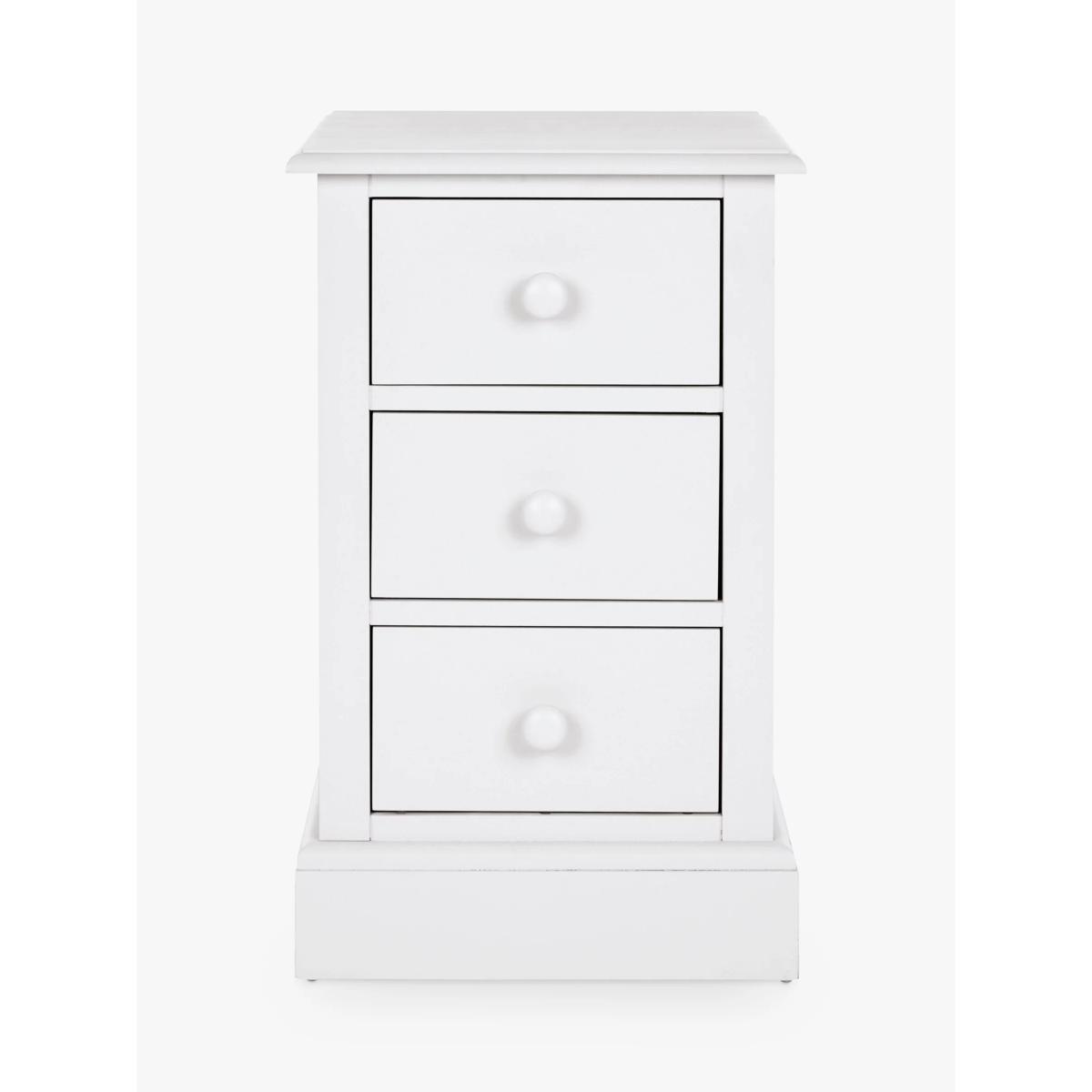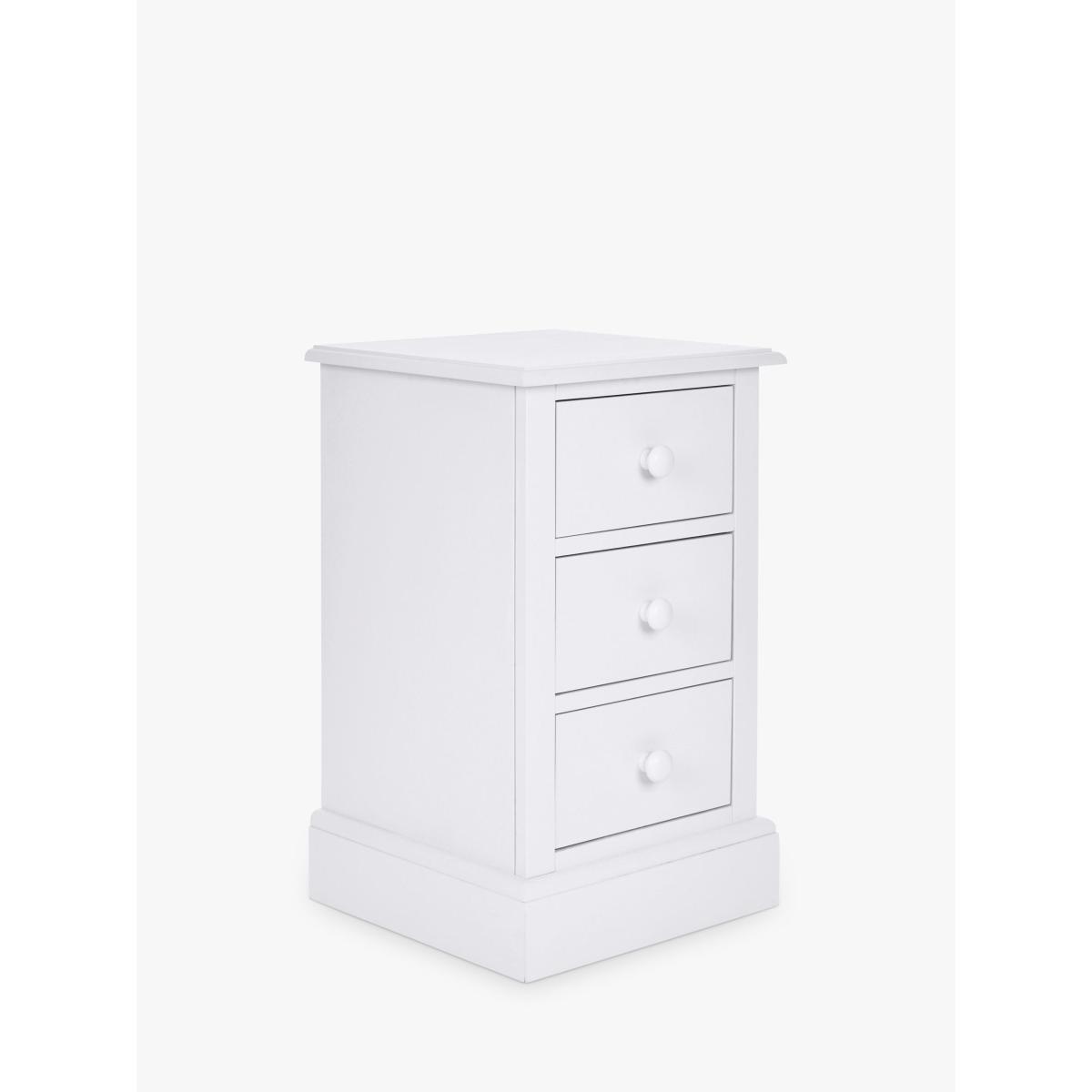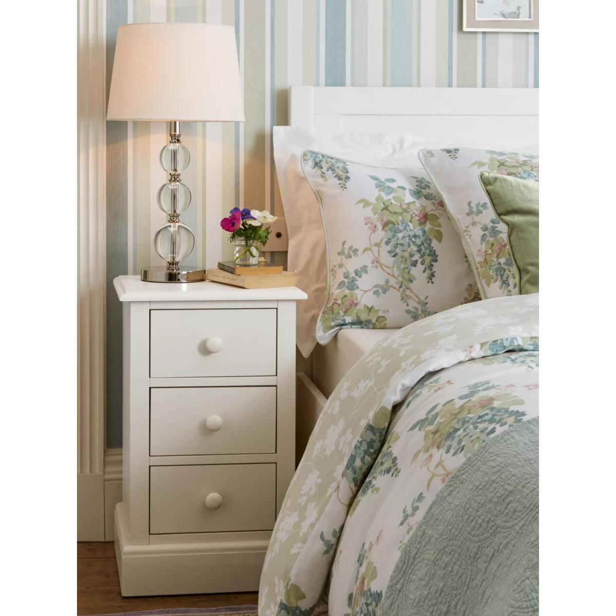 Bedside storage is a novelty and this bedside table is designed with three spacious drawers. Traditionally designed with a profiled top and bottom plinth, it's made from sturdy wood and hand-painted both inside and out. Visible brush strokes in the paintwork add extra charm and character. Relatively narrow, don't worry about it taking up too much space in your bedroom. It's the perfect size for all your bedside essentials. Want to see it first? You may want to see and get a feel for the furniture in one of our shops before ordering. We'll be able to tell you where the range you'd like to view is on display.